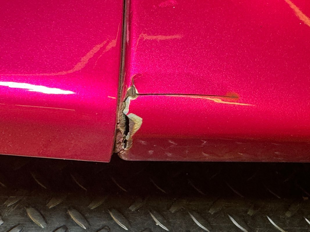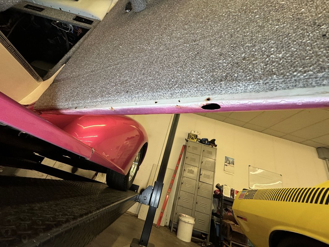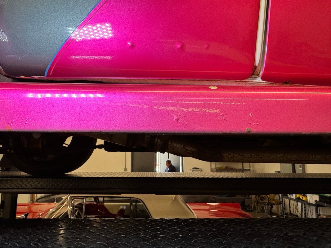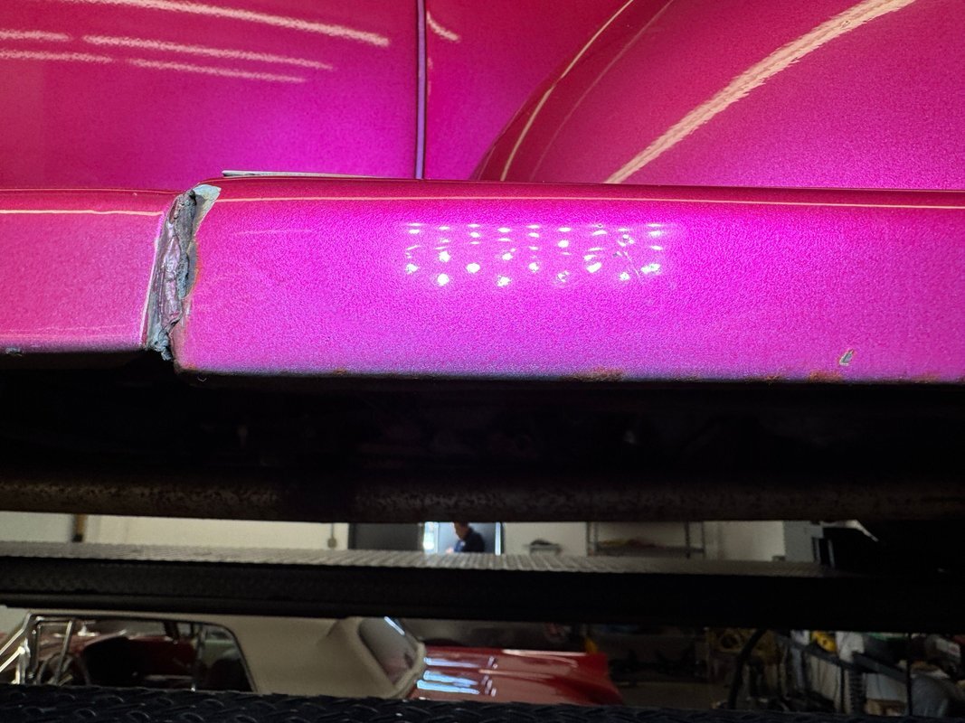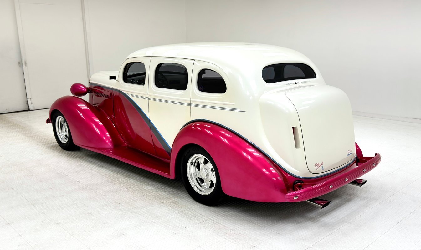 Pearl White meets Hot Pink in an angular pattern, separated by a gray and blue swatch that lands at the rear fender and bounces over it to delineate the pink fender. Straight on you'll see a hot pink car coming your way as the grille, fenders, and bumper are all one color. Then the hood, roof, and upper section of the car reveal coverage of the white. The chopped windows seem to raise the shoulder line of the car and the body has been lowered on the wheels creating an aggressive stance and an impressive presence for a large vehicle. Frenched taillights are accompanied by a brake light behind the frenched in "36 Buick" 3rd brake light above the humpback trunk. 15-inch Weld wheels add even more shine to the car and billet side mirrors look right at home, while trumpet-like dual exhaust blasts out the back. The door handles are shaved, and the paint is bright and dramatic and we note just a few imperfections. A couple of bubbles are seen down low, a crack in the rocker panel along with some extra paint and some chips, and other areas of chipped or rusted seams on the bottom.