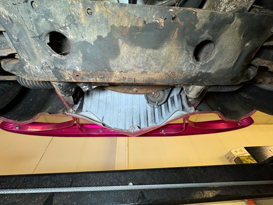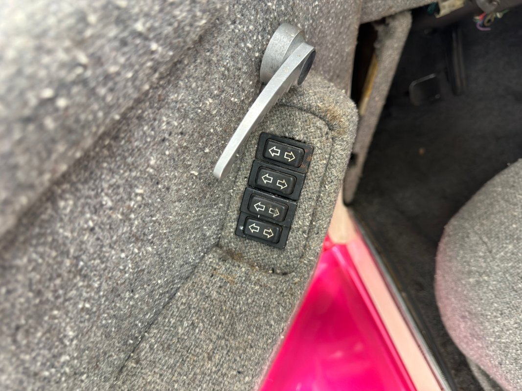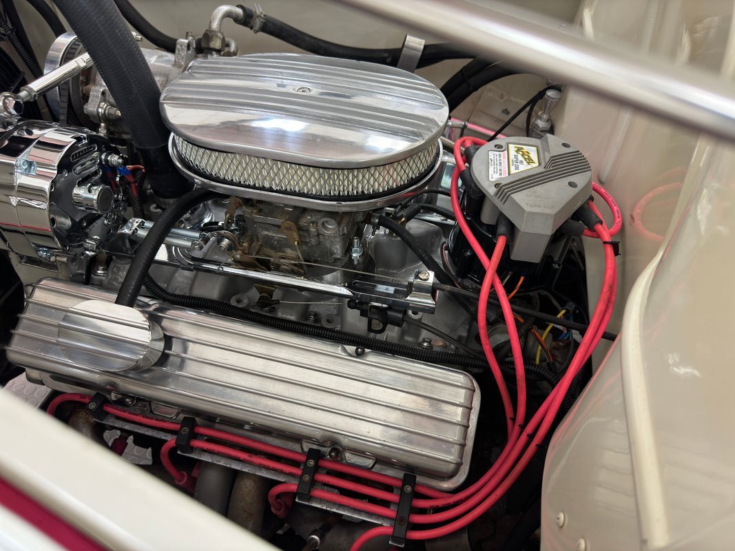 Open the big hood to find a very clean and dressed up 350ci engine with pink ignition wires to match the car! Polished valve covers, air element, alternator, and pulleys make for a shiny presentation. An Edelbrock 4-barrel carburetor is under the air element and above an Edelbrock intake manifold. What can't be seen from the top is the 700R4 4-speed automatic transmission that sets the car in motion. What slows that motion are power disc brakes in the front helped by power drums in the back.