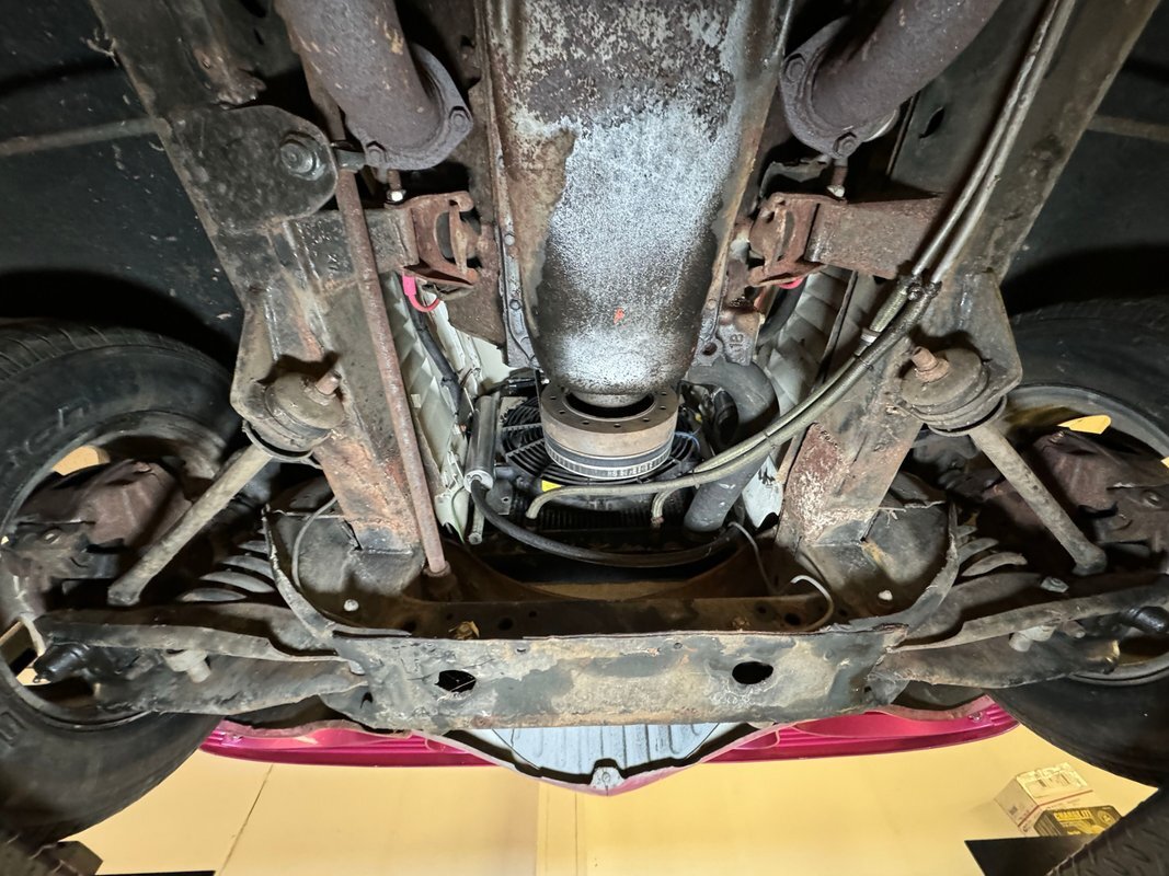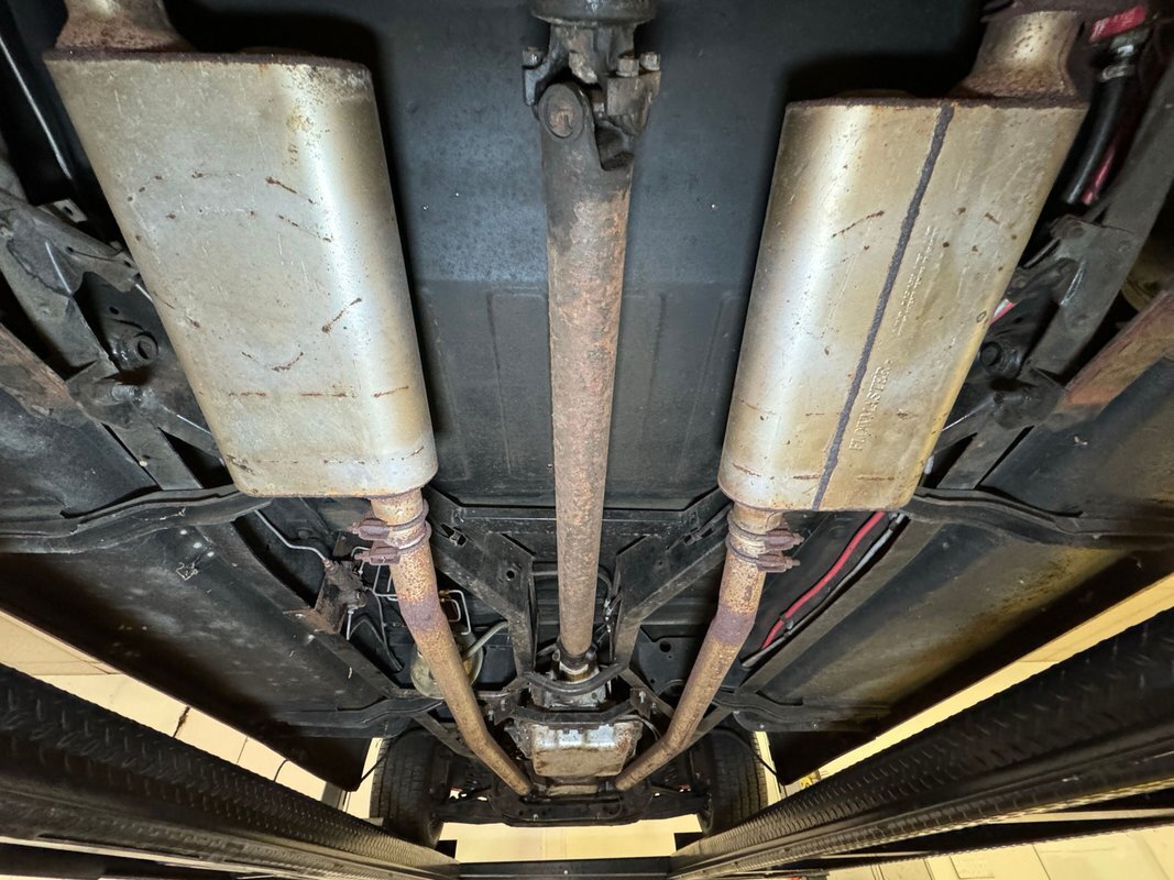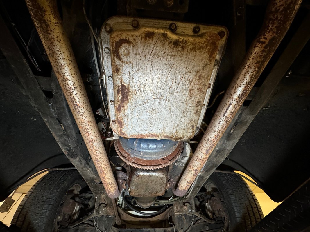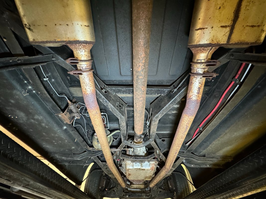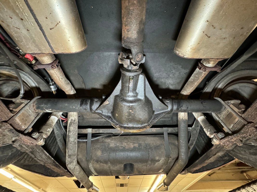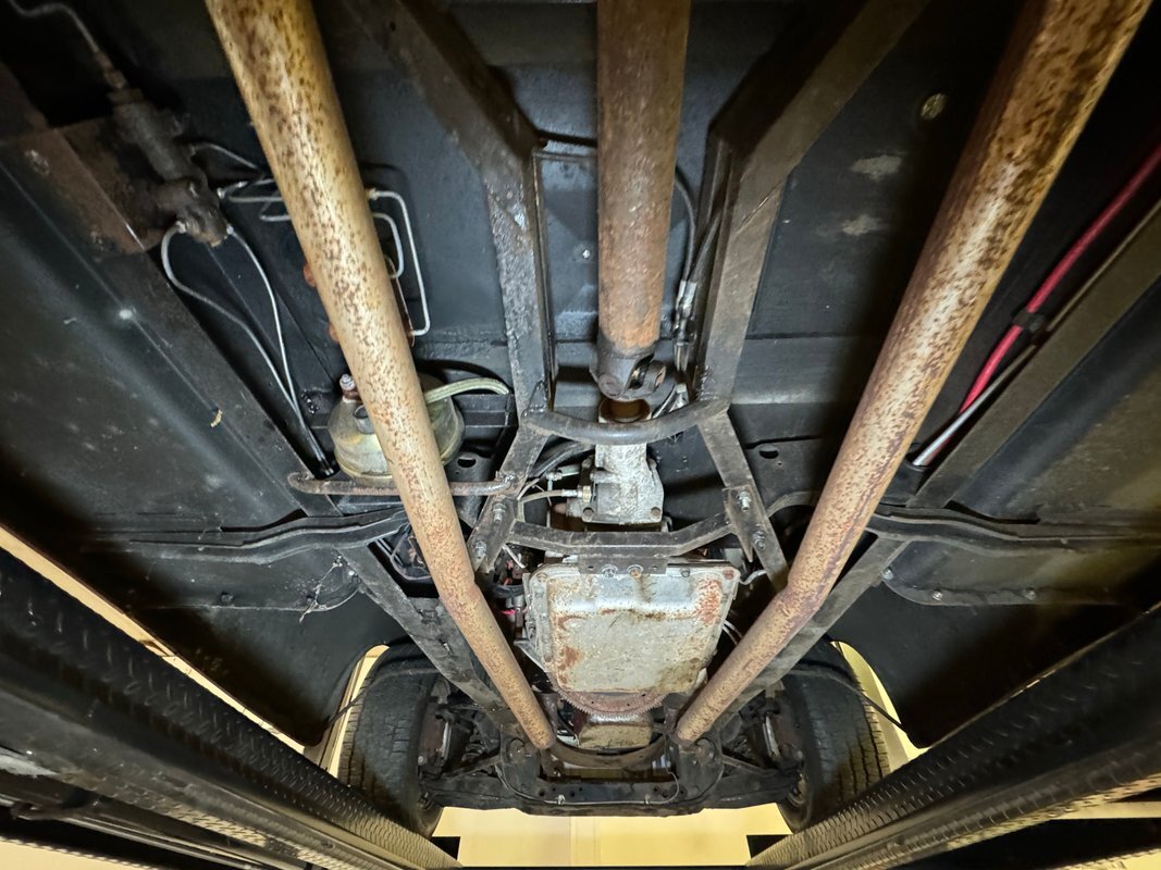 Headers lead to dual exhaust that find their way to Flowmaster mufflers, then out to the trumpets in back. Plenty of surface rust underneath but that's better than invasive rust which we don't see. We also don't see any fluids leaking and that's a good thing as well. For suspension, this car is equipped with a Mustang II front end and leaf springs in back. Our consignor notes rack and pinion steering is included.