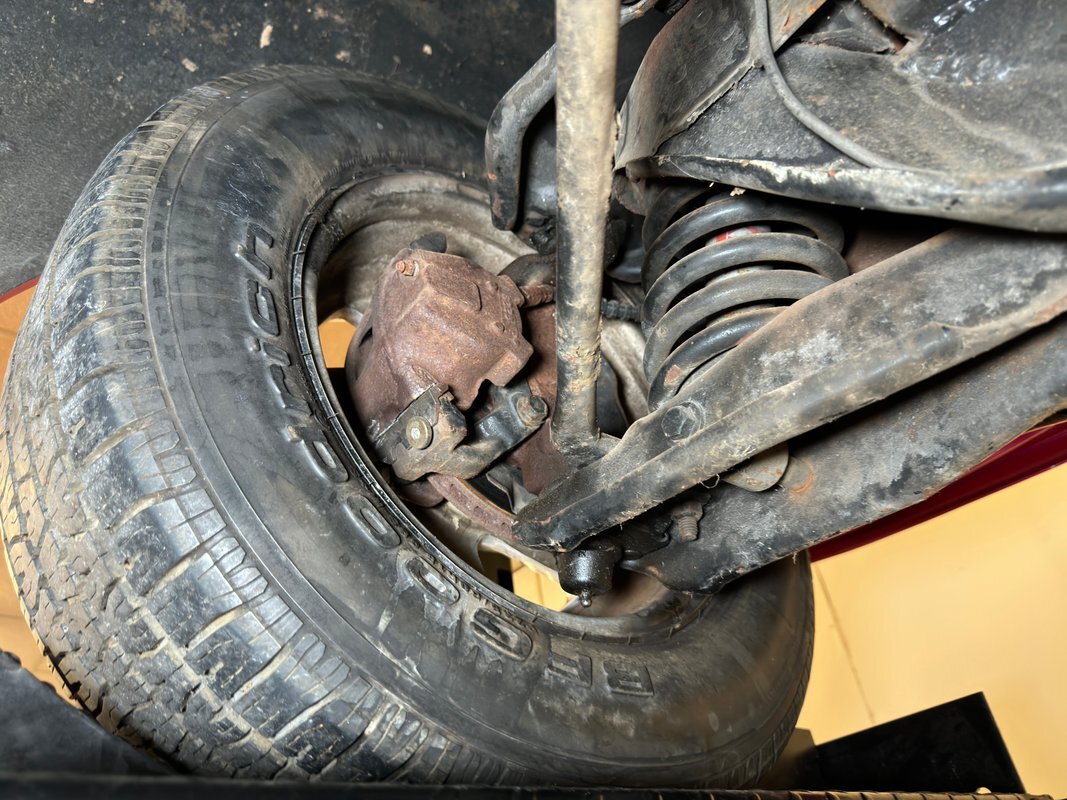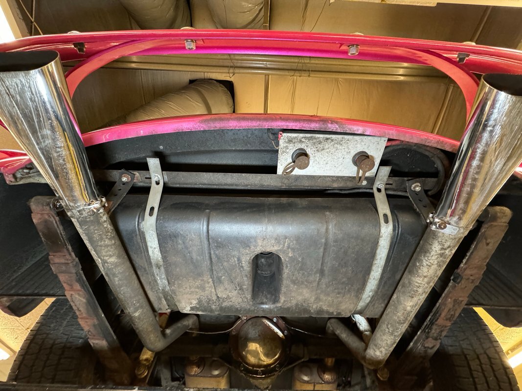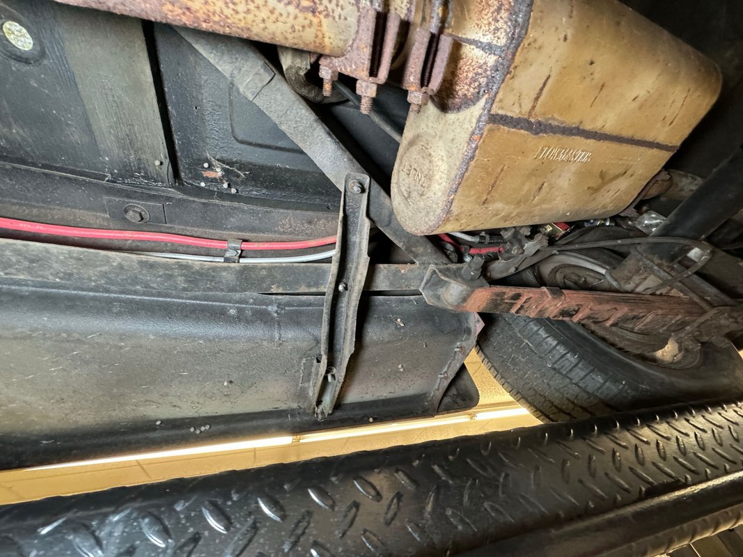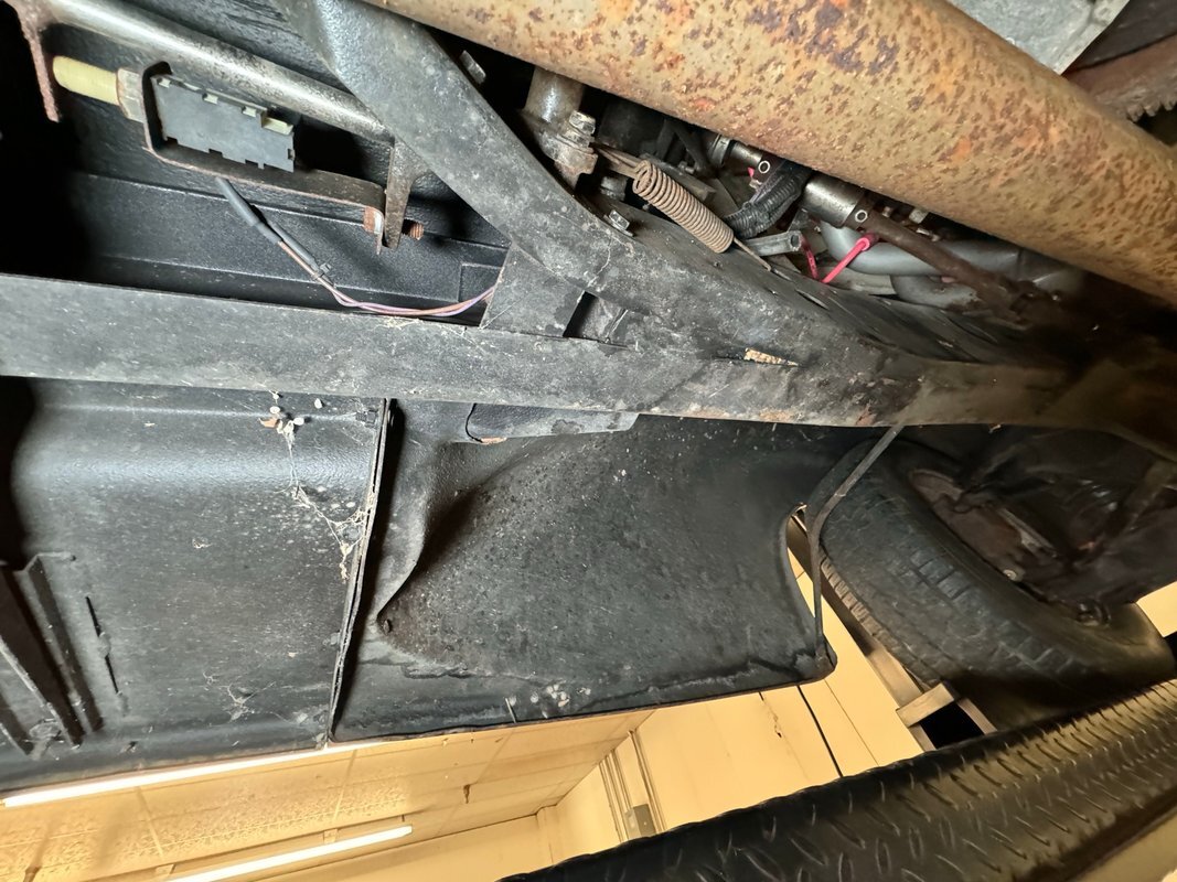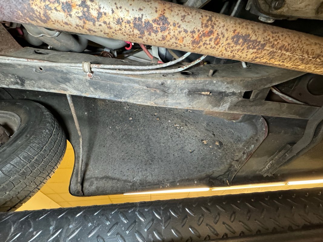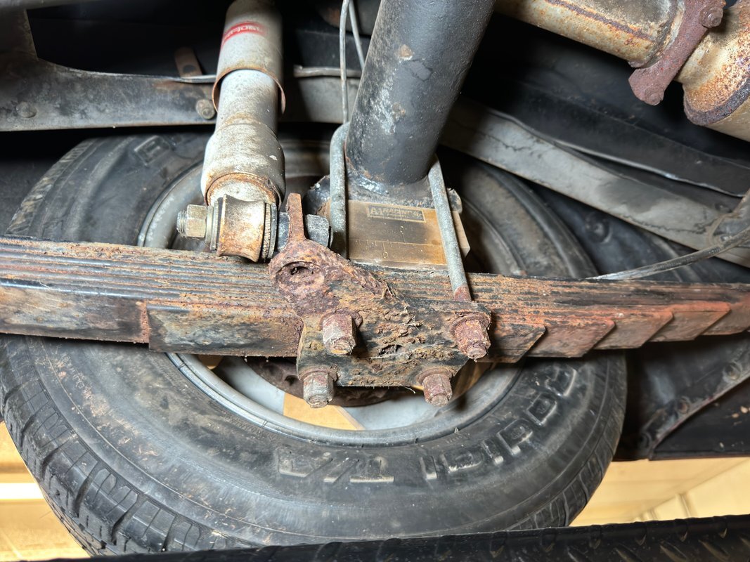 Headers lead to dual exhaust that find their way to Flowmaster mufflers, then out to the trumpets in back. Plenty of surface rust underneath but that's better than invasive rust which we don't see. We also don't see any fluids leaking and that's a good thing as well. For suspension, this car is equipped with a Mustang II front end and leaf springs in back. Our consignor notes rack and pinion steering is included.