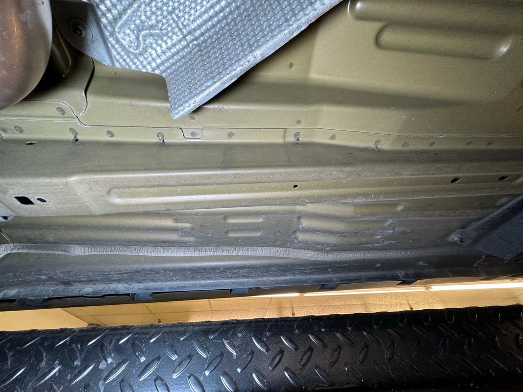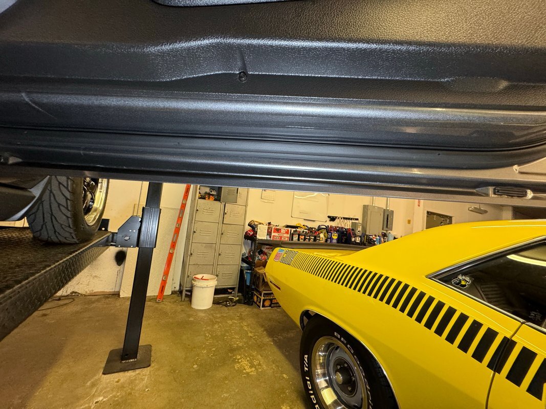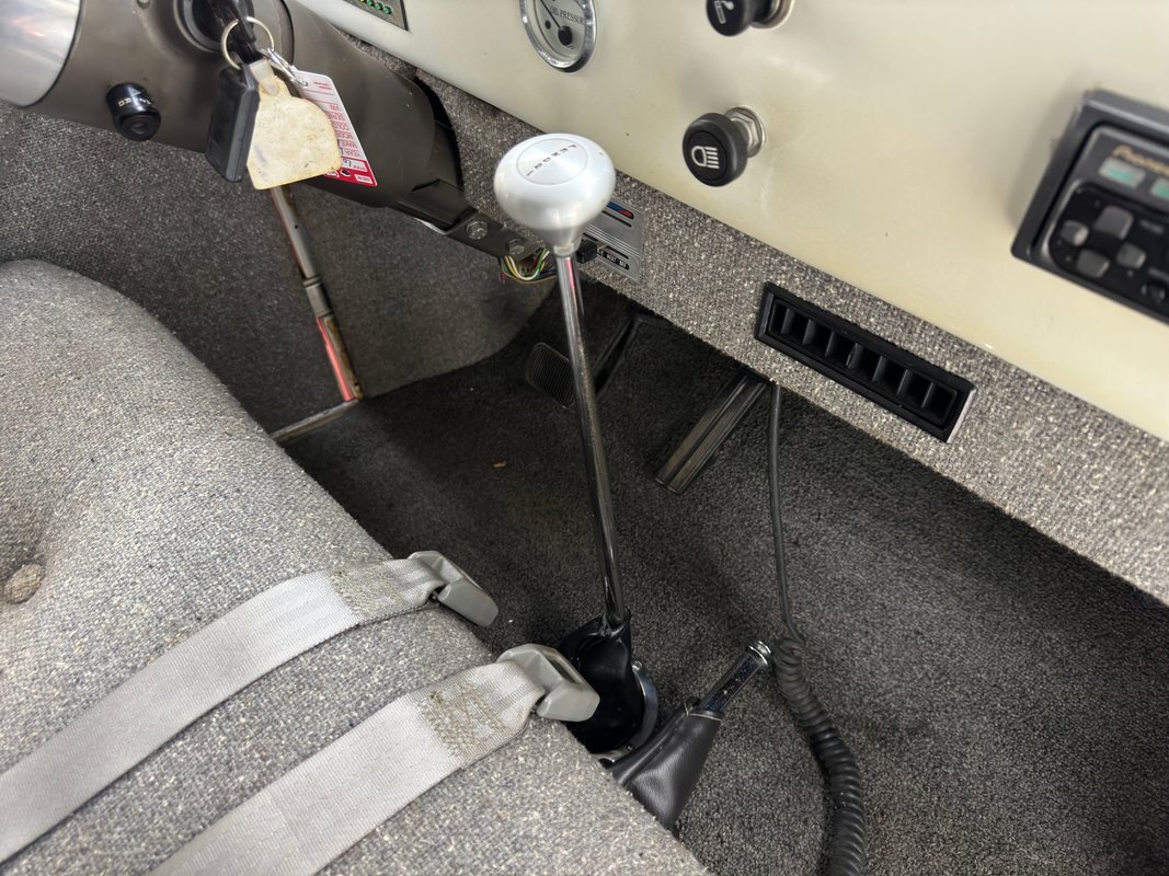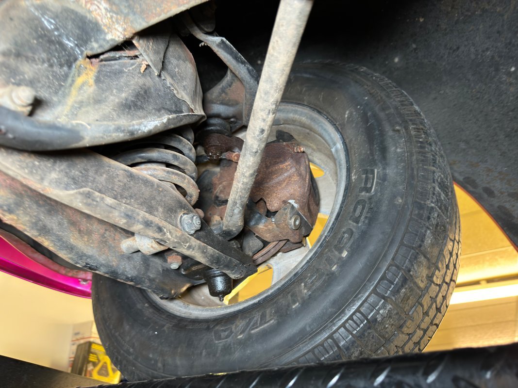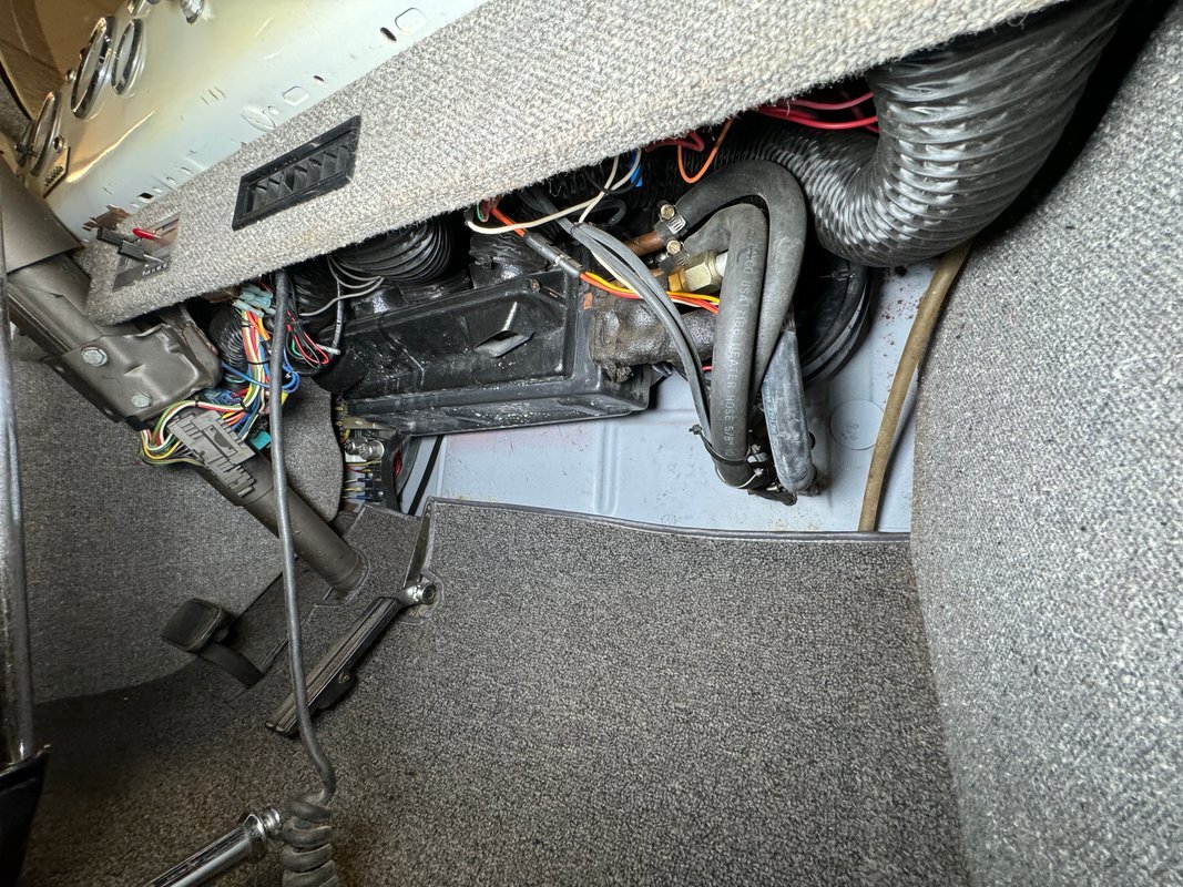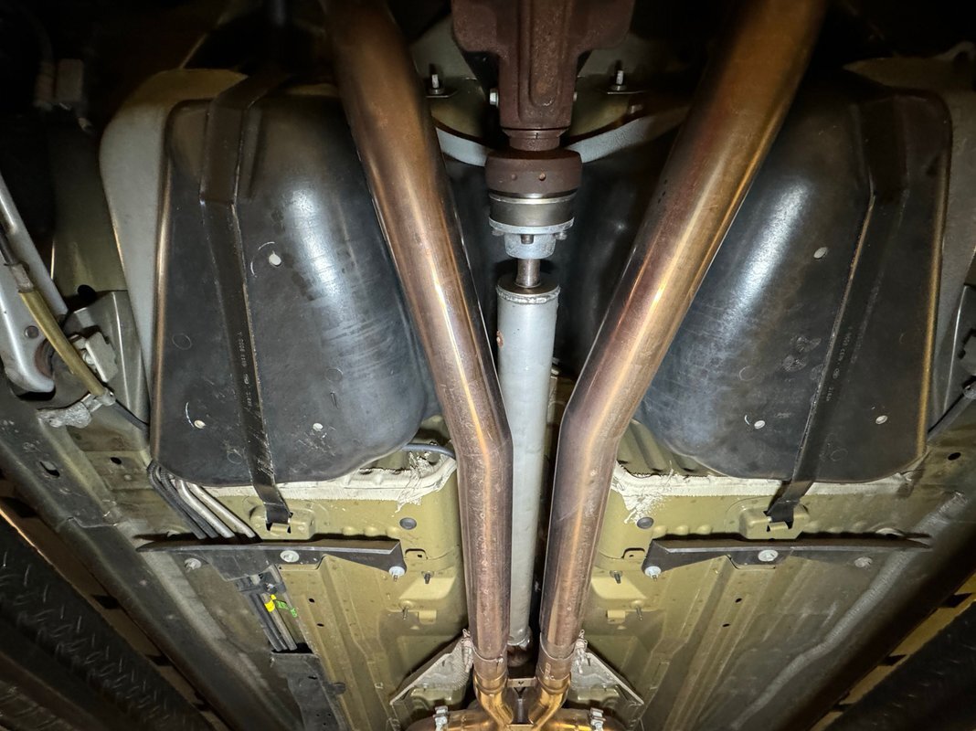 Headers lead to dual exhaust that find their way to Flowmaster mufflers, then out to the trumpets in back. Plenty of surface rust underneath but that's better than invasive rust which we don't see. We also don't see any fluids leaking and that's a good thing as well. For suspension, this car is equipped with a Mustang II front end and leaf springs in back. Our consignor notes rack and pinion steering is included.