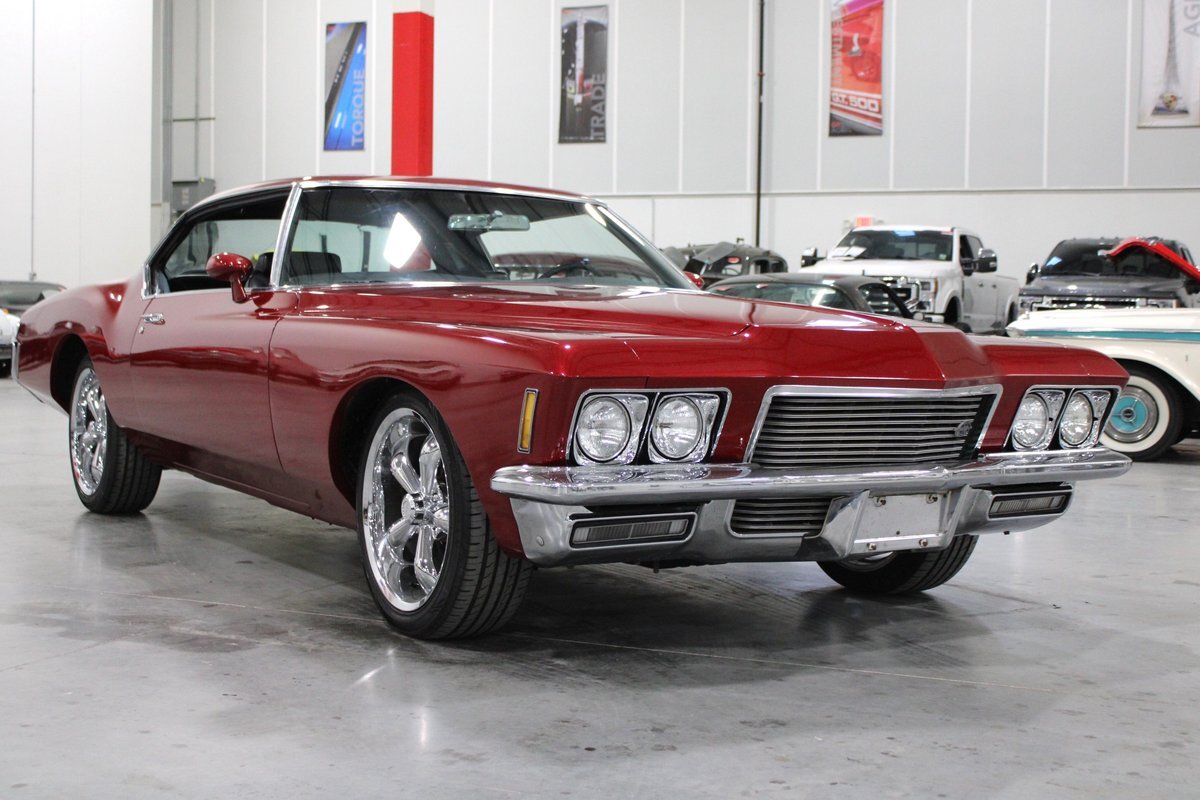 GR Auto Gallery of Indianapolis is pleased to present this 1971 Buick Riviera for consideration. This stunning Riviera is from a private collection. This beauty has a recent paint job and is covered in a slick Red Chrystal metallic color that is offset by a clean black interior featuring factory buckets and console. The big 455 Buick engine is mated to a smooth shifting Turbo 400 transmission. This Boat Tail rolls on 20 inch chrome 5 spoke Vision wheels with 245/45ZR20 black wall tires. The chrome is nice and straight and shows very well. The gas tank is brand new. Standard options include; power steering, power brakes, AM/FM stereo, air conditioning, cruise control, power windows, and power seats. So if you are in the market for a Riv that's ready to roll this is the car for you! Drive this one out of our showroom or have us assist with shipping it to you anywhere in the United States! Don't hesitate to give us a call with any questions or for more information.