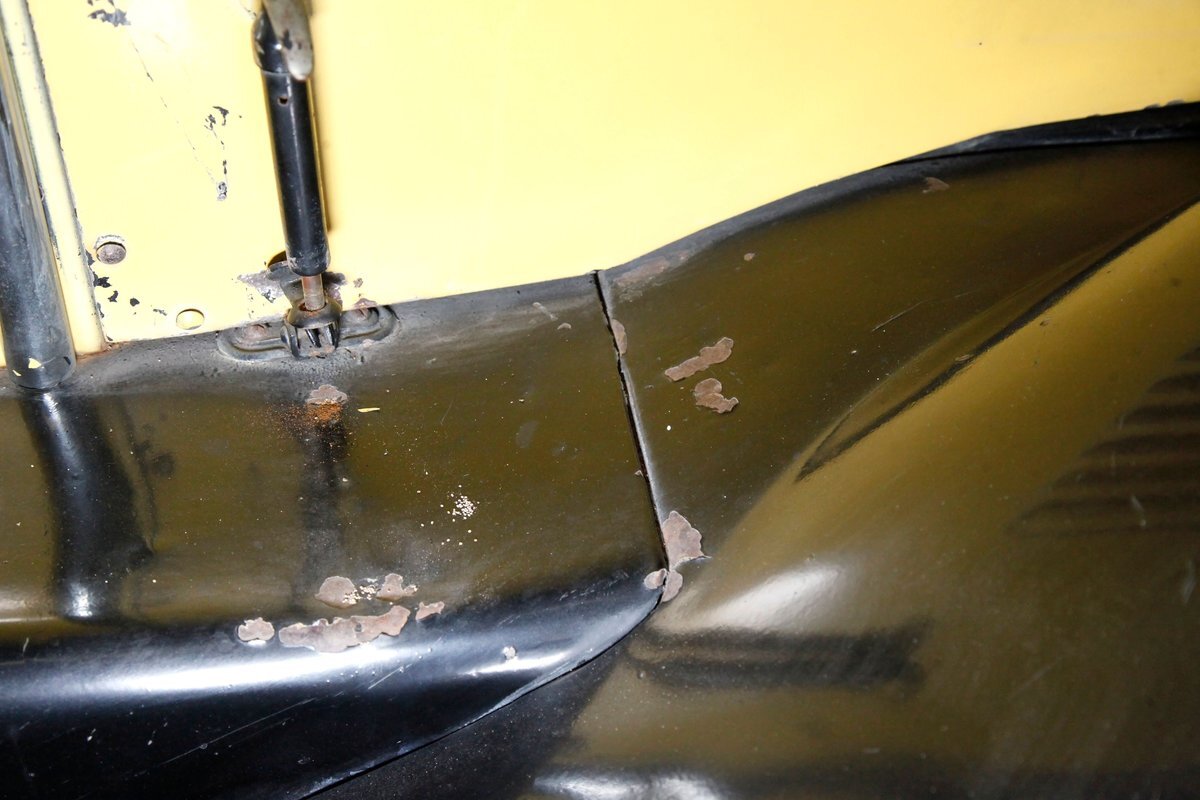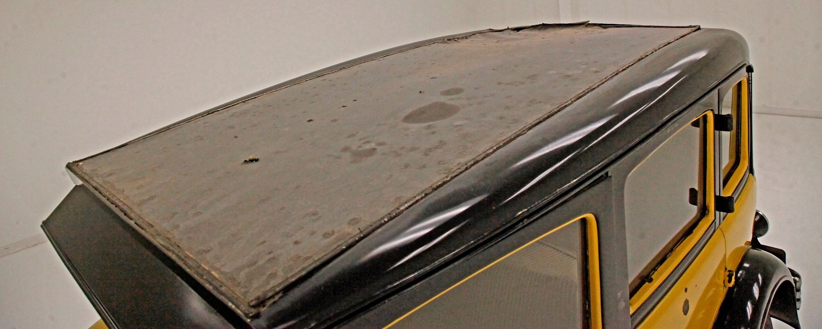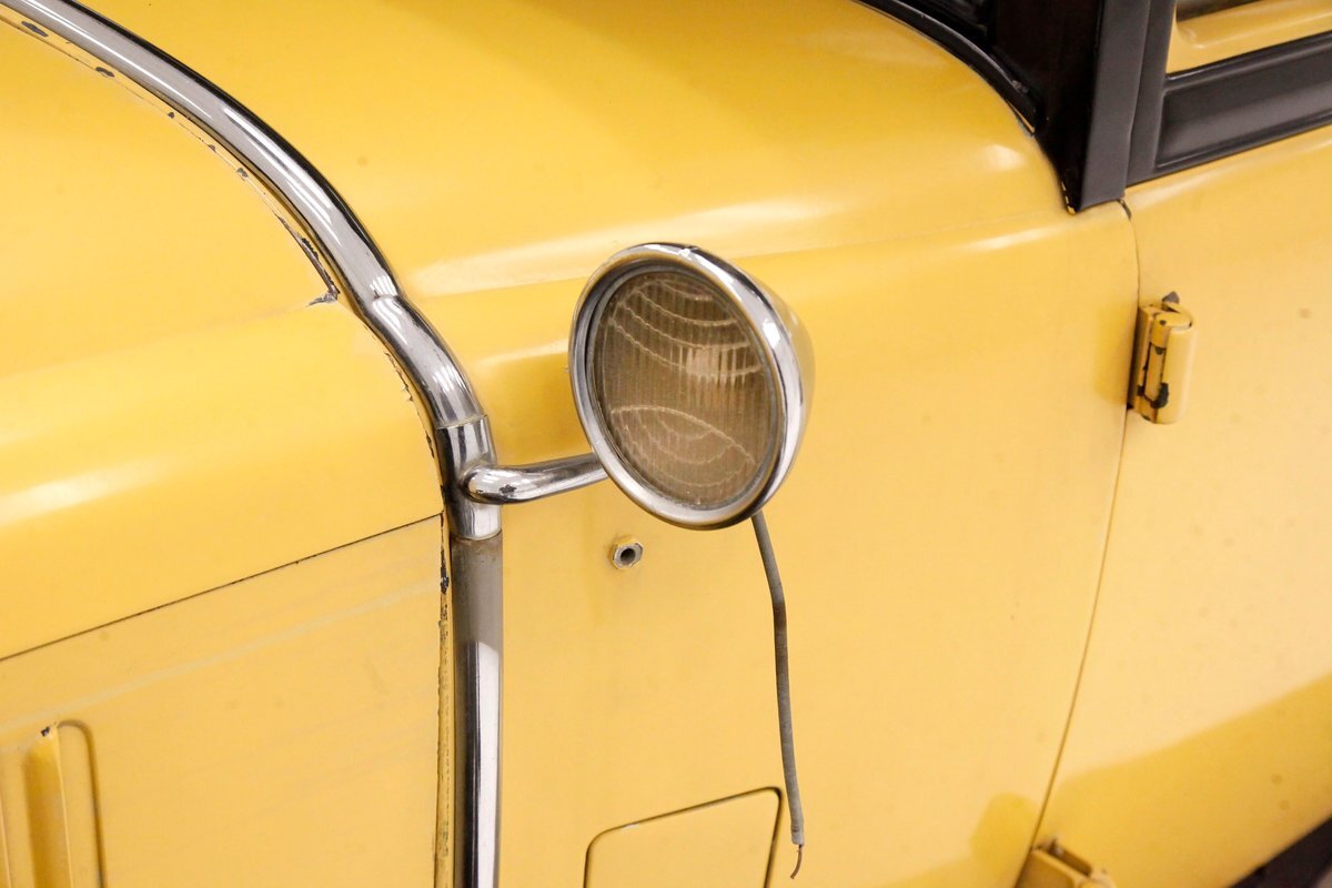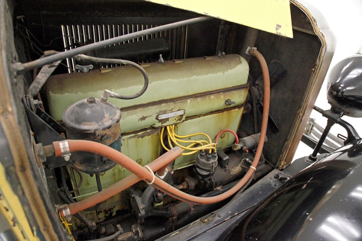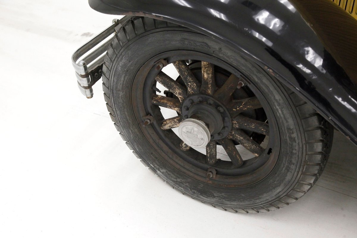 Yellow paint adorns most of the body panels and shows with some chip offs and areas where there is surface rust under this paint. Earlier bodywork near the rockers is showing some bubbling. The roof is rotted canvas and otherwise is steel construction and painted black. Also the fenders and running boards are a contrasting black. Chromed trimmings include the radiator surround, headlight bezels, a triple horizontal bar front bumper and split rear bumper and mirrors and door handles are on for dress up. This chrome is in good condition save for the door handles which are pitted and have beginnings of rusting. The glass is in good condition, and the window frames are painted in yellow which gives an interesting look to the exterior. Running boards are the true sense of the word as they are wood. These are faded and have some water damage but are not rotted. On the back, a single round tail light and a spare tire between the bumpers is noted. 20-inch wood spoked wheels are on and in need of restoration. Definitely the look of the roaring 20's in its Harley Earl Design, which is very refined and curvaceous, all accentuated with the two tone yellow and black.