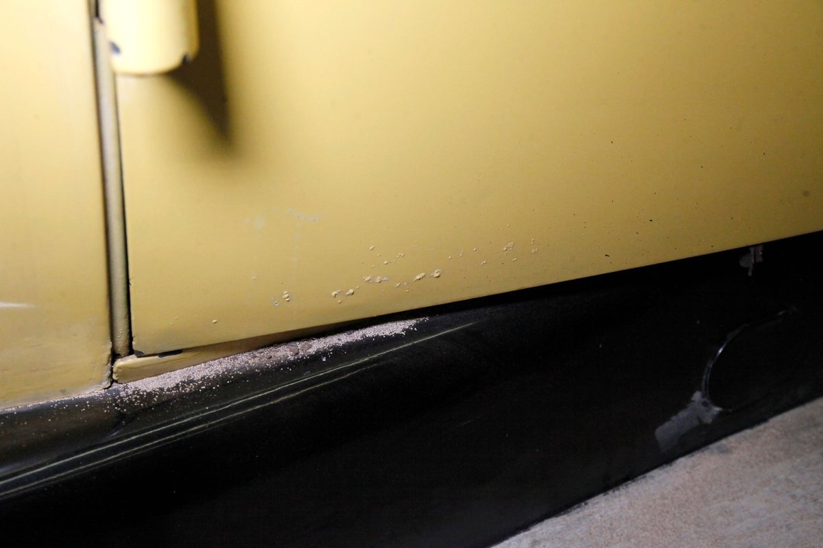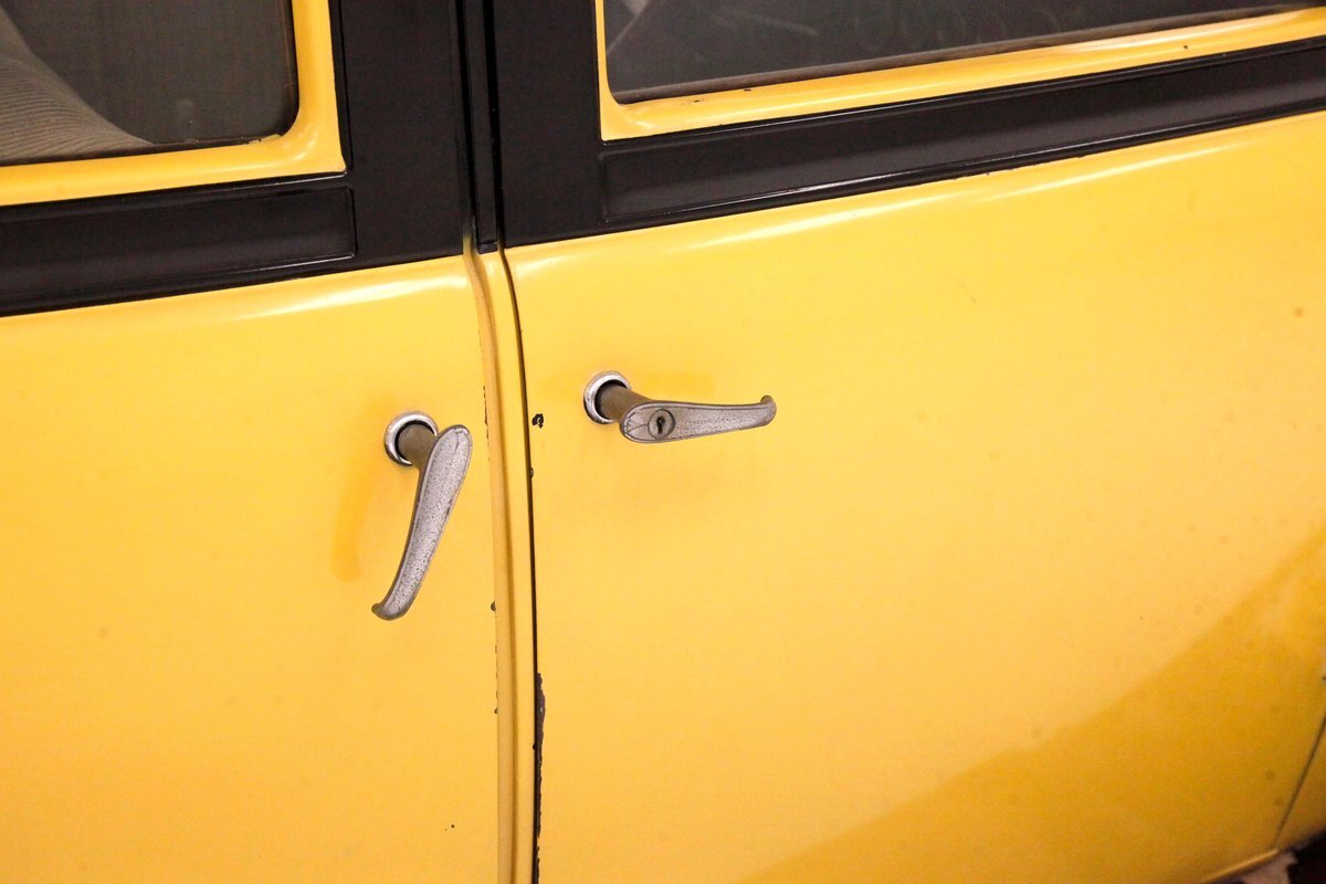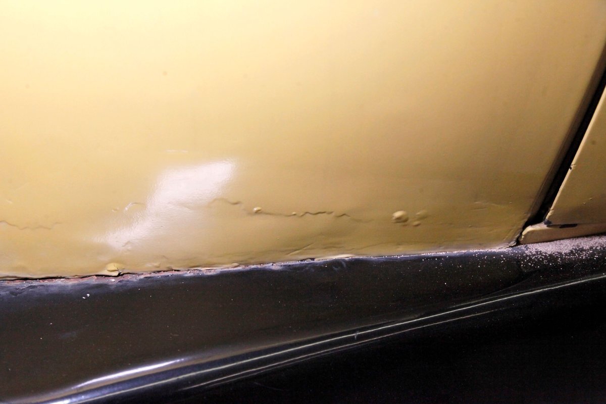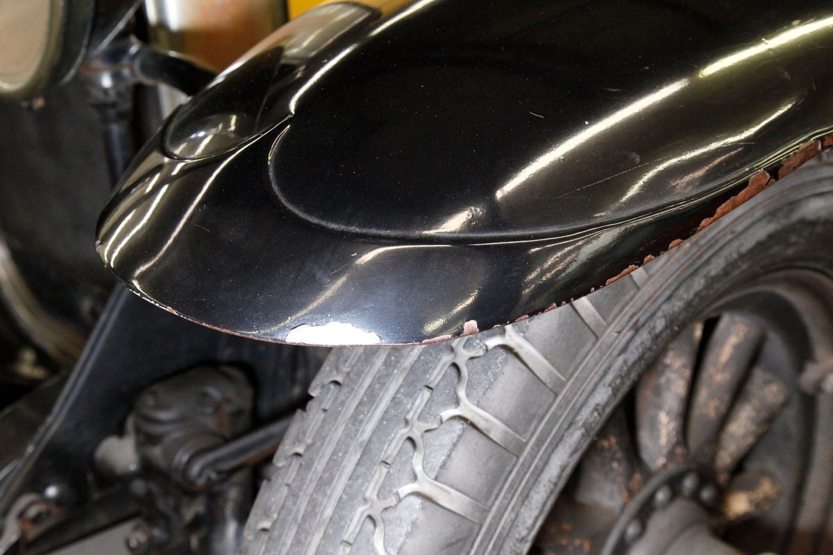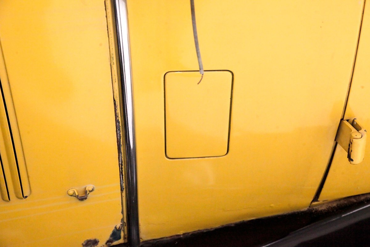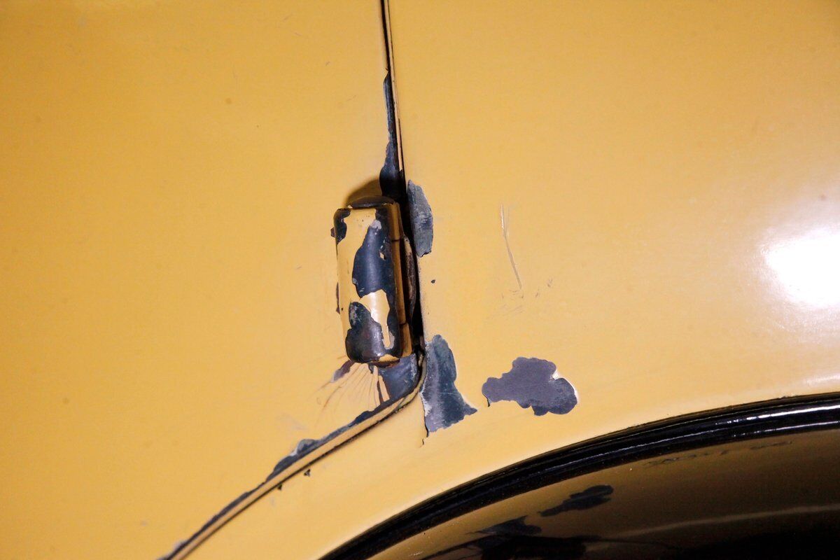 Yellow paint adorns most of the body panels and shows with some chip offs and areas where there is surface rust under this paint. Earlier bodywork near the rockers is showing some bubbling. The roof is rotted canvas and otherwise is steel construction and painted black. Also the fenders and running boards are a contrasting black. Chromed trimmings include the radiator surround, headlight bezels, a triple horizontal bar front bumper and split rear bumper and mirrors and door handles are on for dress up. This chrome is in good condition save for the door handles which are pitted and have beginnings of rusting. The glass is in good condition, and the window frames are painted in yellow which gives an interesting look to the exterior. Running boards are the true sense of the word as they are wood. These are faded and have some water damage but are not rotted. On the back, a single round tail light and a spare tire between the bumpers is noted. 20-inch wood spoked wheels are on and in need of restoration. Definitely the look of the roaring 20's in its Harley Earl Design, which is very refined and curvaceous, all accentuated with the two tone yellow and black.