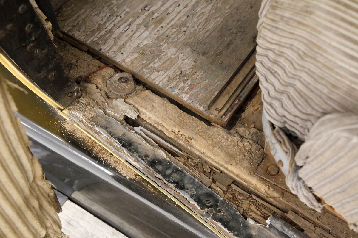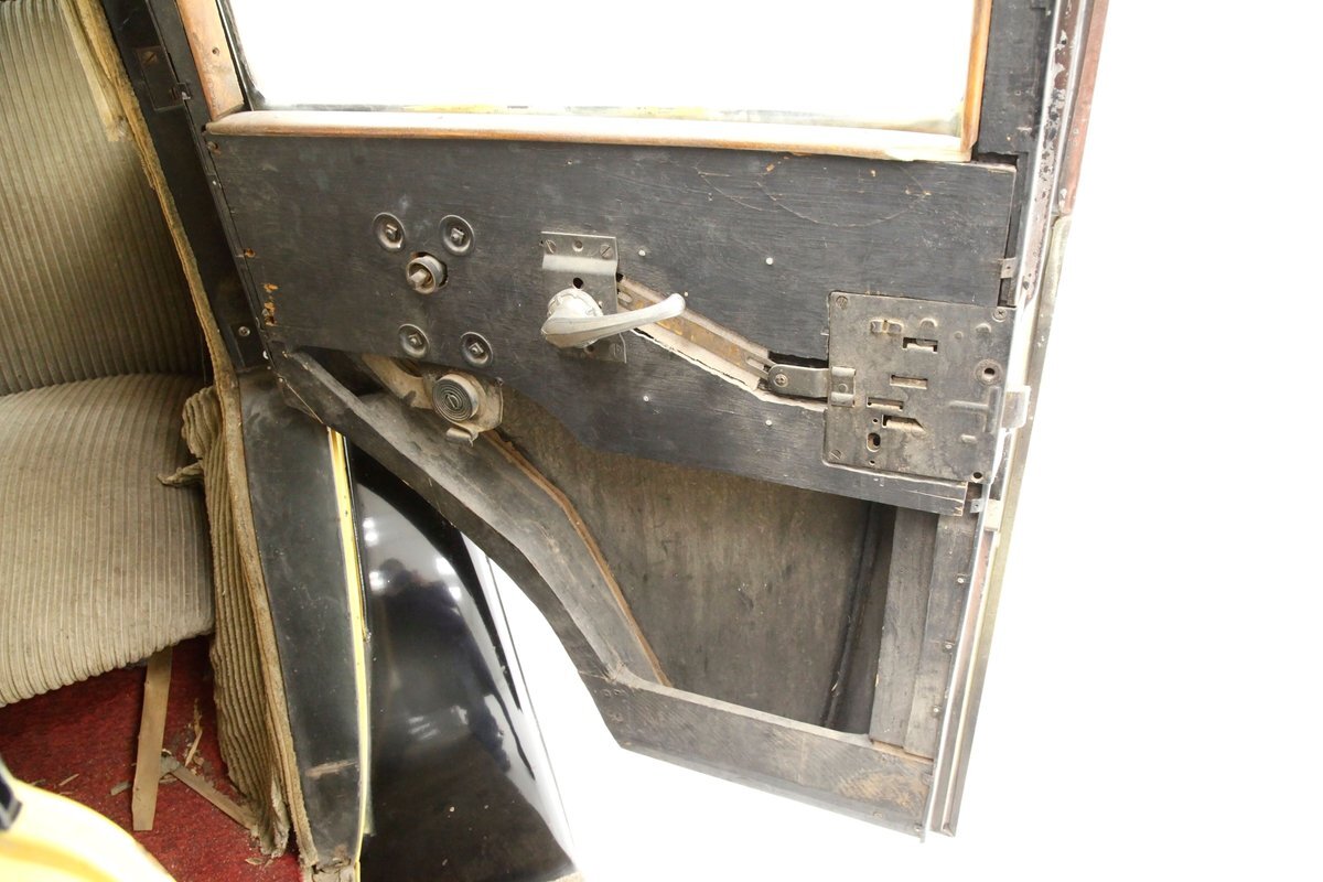 Most interesting, although in need of restoration, but if I were king I'd try to locate the same material. Corduroy in wide ribbed form and colored tan is virtually everywhere from the door panels to the beautifully designed nouveau styled front bench and rear "couch", and even on the side panels and headliner. The black painted dash is fairly straightforward with simple instruments peppering the center and a few extra knobs and pulls. A large wood rimmed steering wheel is fronting the dash and with various throttle and spark advance levers as well as metal central ribs. The floors are in need of repair particularly on the driver's door sill area. It is rotted wood and the rest is damaged rubber over the wood. In the back is some red carpeting and who knows what lies beneath it?! A very interesting use of materials for the interior.
