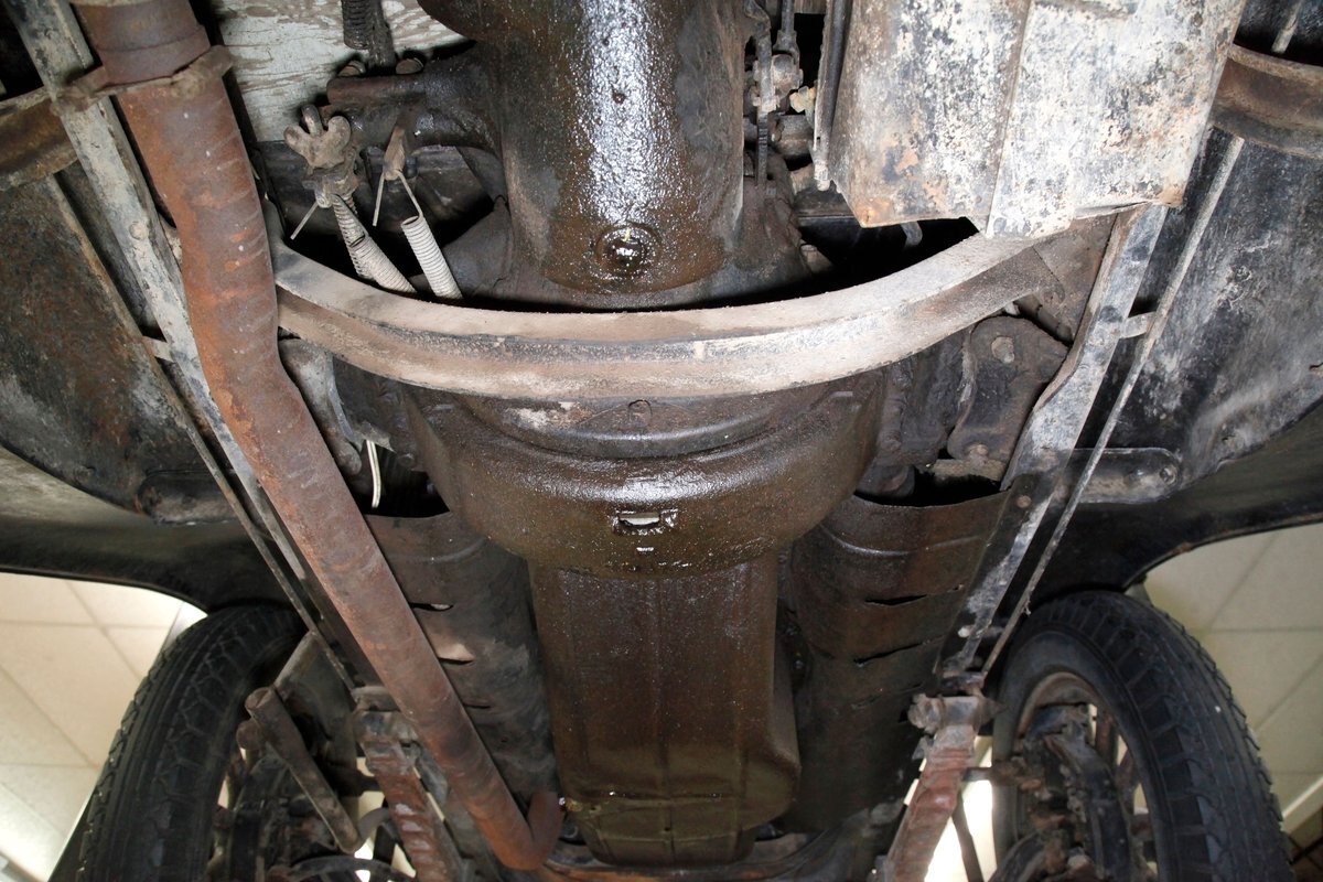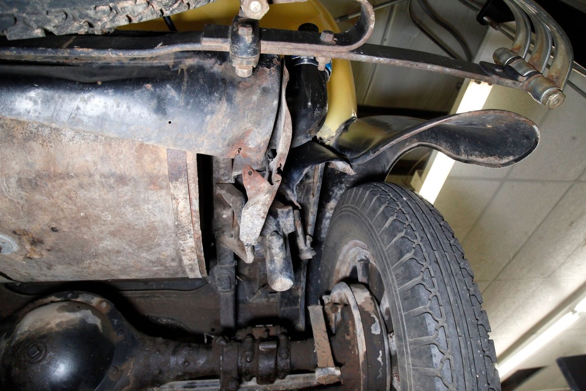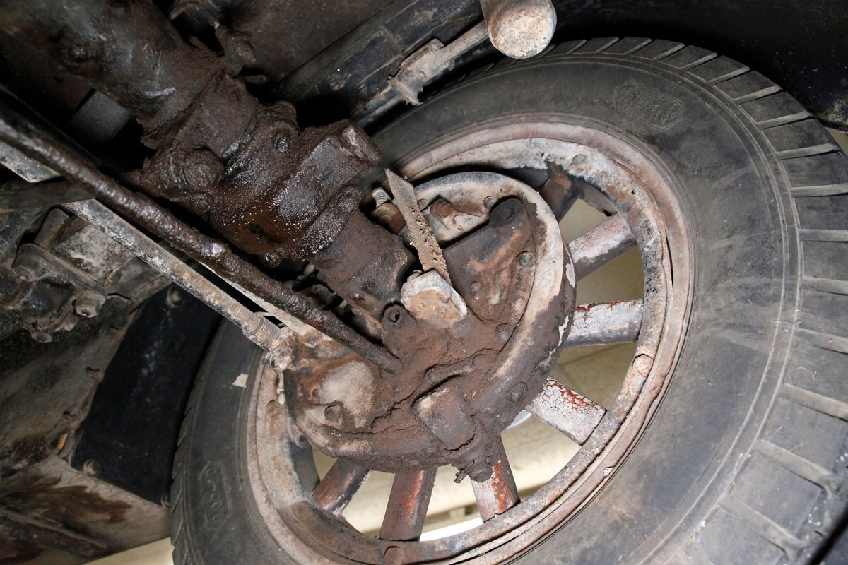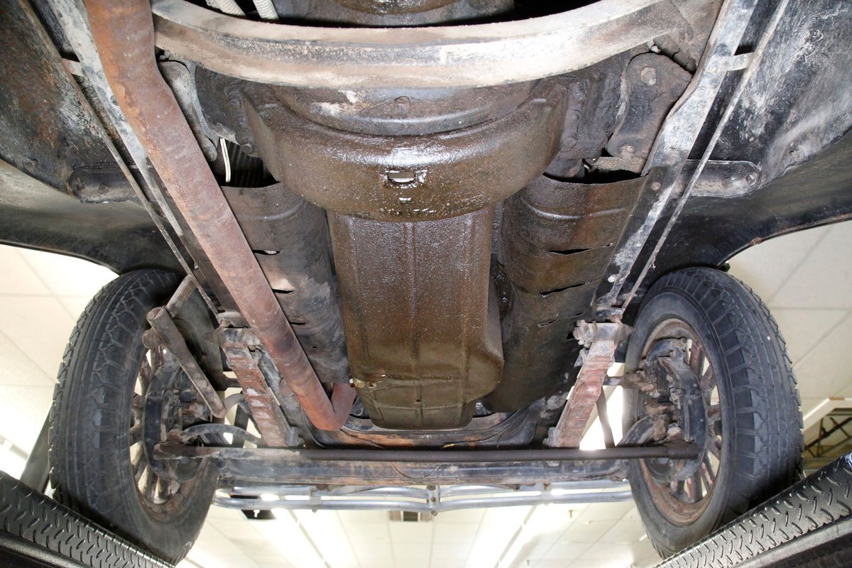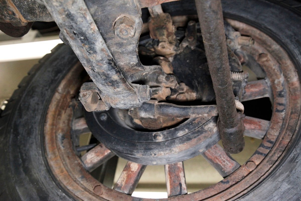 Plenty of patina and some light surface rust albeit rare. All the rest is black painted steel for the frame and wood underside of the floorboards. The engine and rear pumpkin are showing some oiling going on. Mechanical drum brakes are on all 4 corners and for the front leaf springs and for the back quarter elliptical leaf springs. A stock exhaust is on and a bit rusted but no holes.