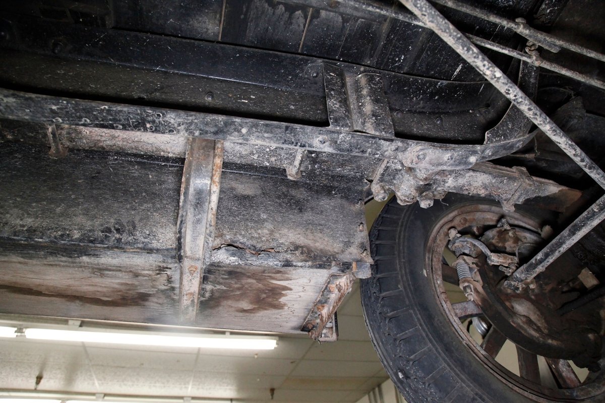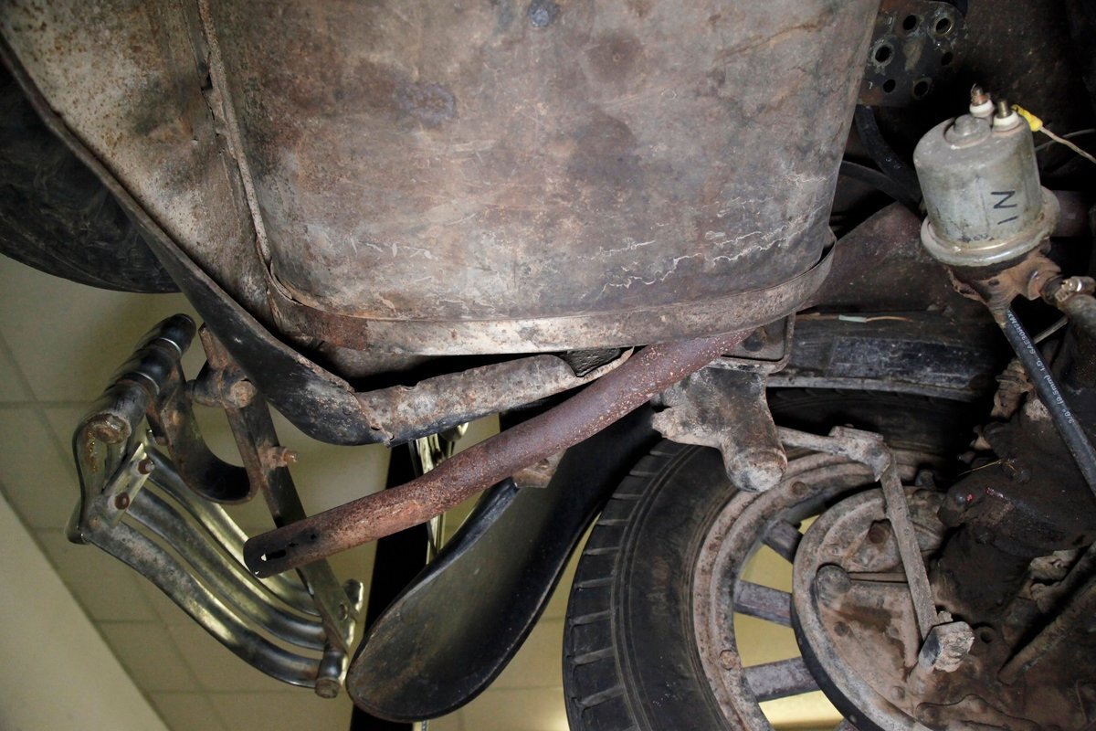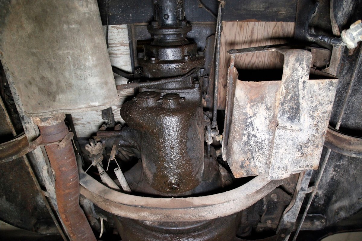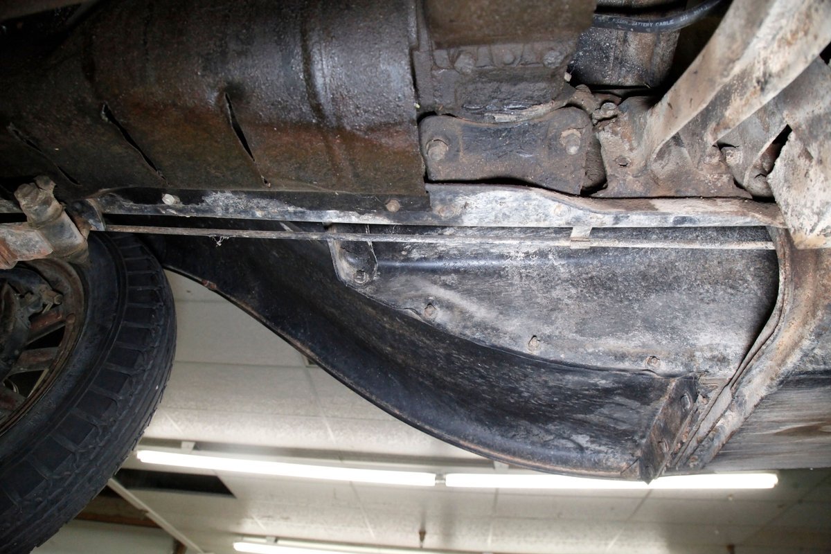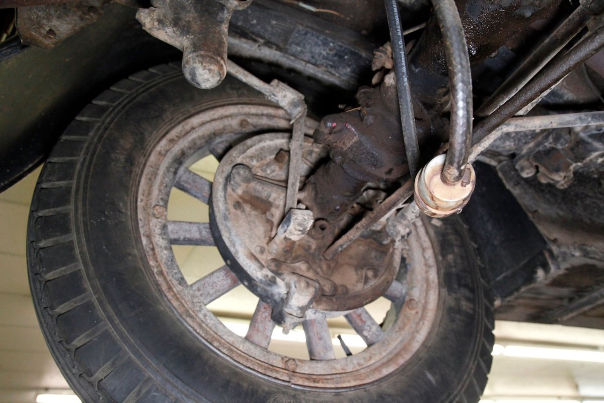 Plenty of patina and some light surface rust albeit rare. All the rest is black painted steel for the frame and wood underside of the floorboards. The engine and rear pumpkin are showing some oiling going on. Mechanical drum brakes are on all 4 corners and for the front leaf springs and for the back quarter elliptical leaf springs. A stock exhaust is on and a bit rusted but no holes.