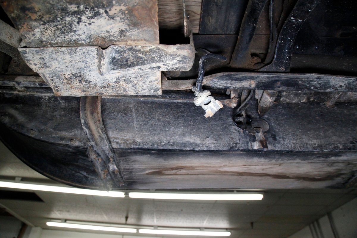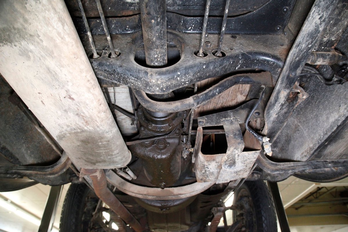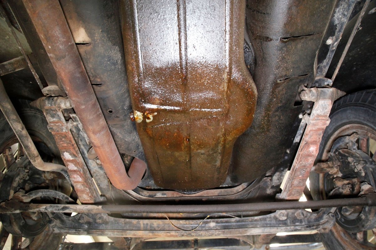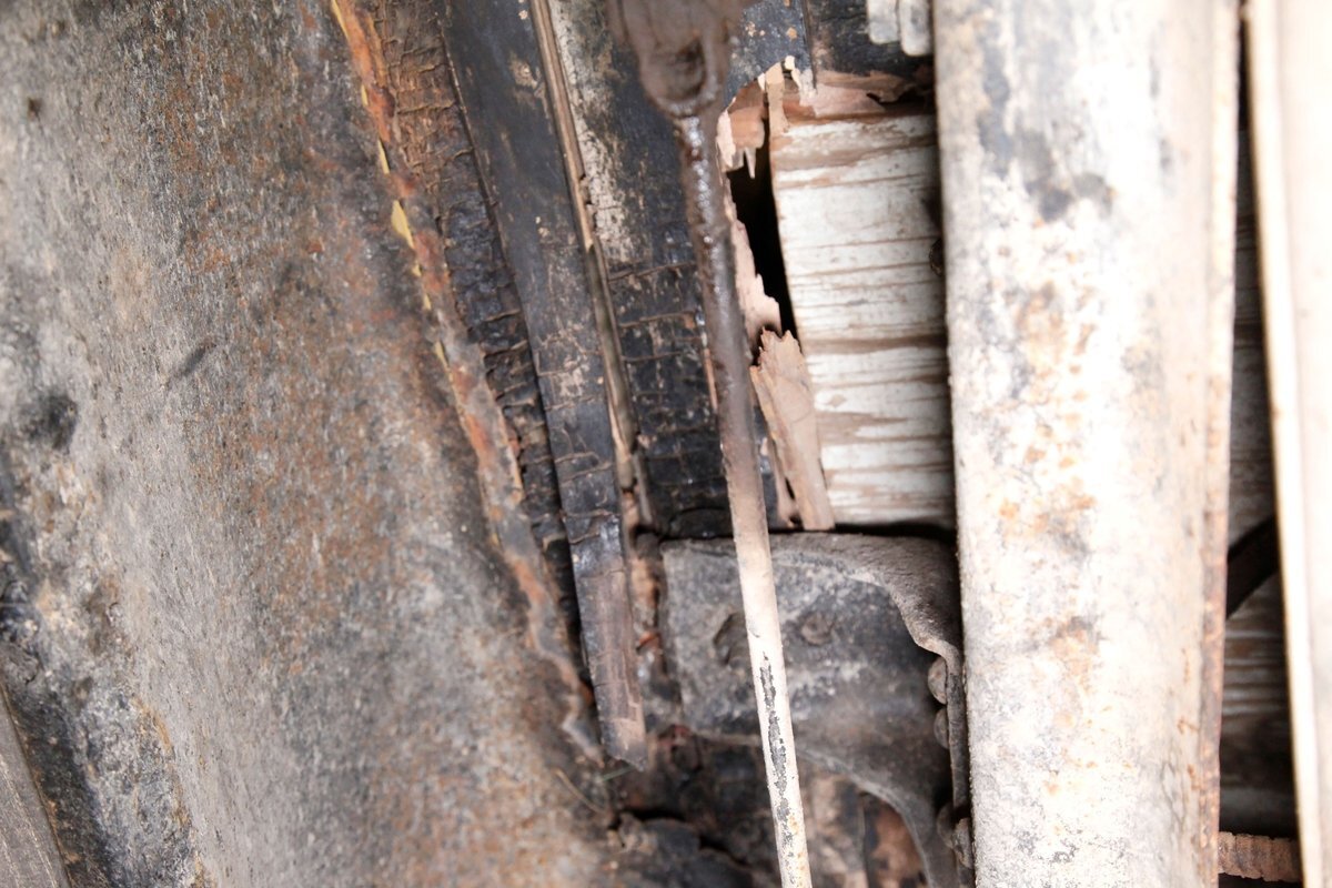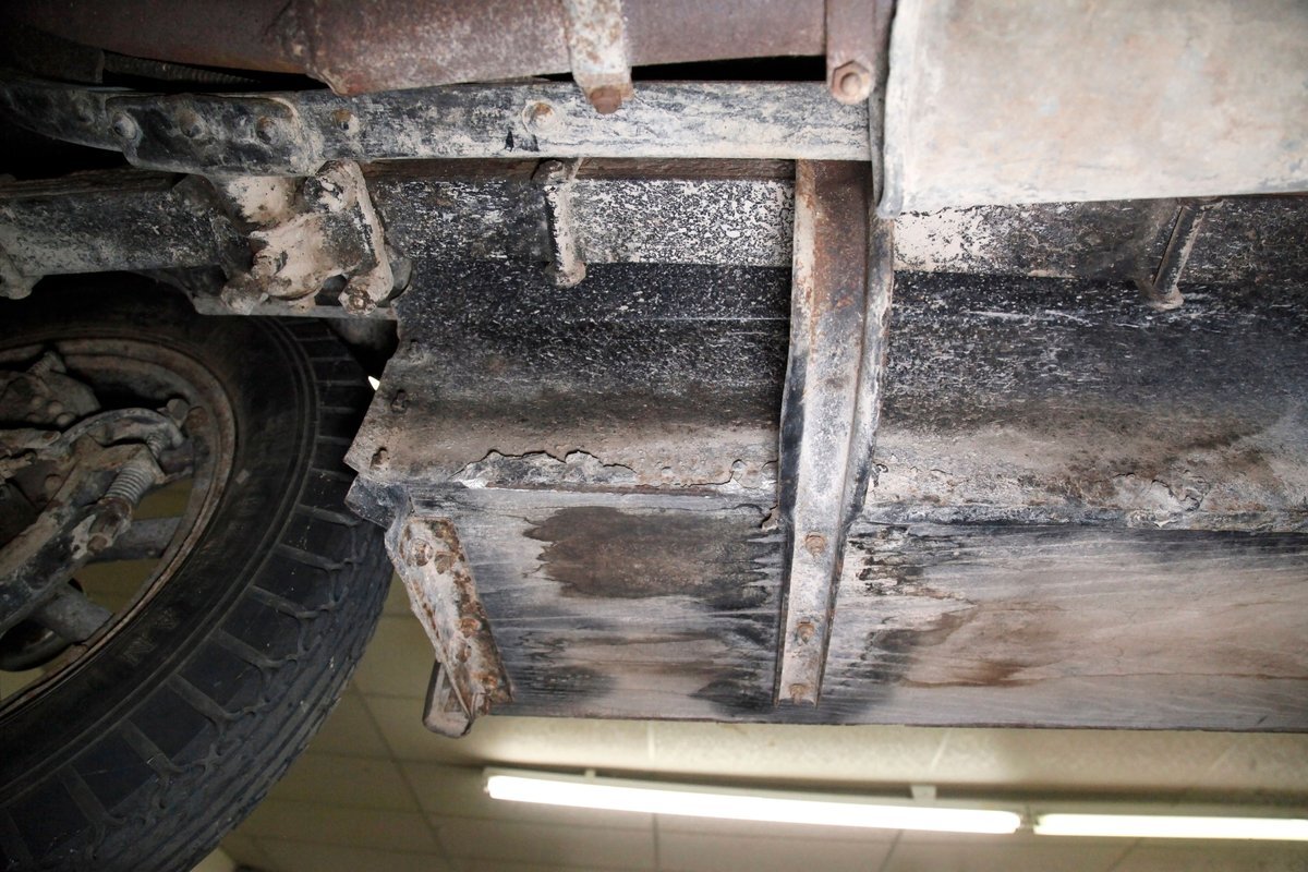 Plenty of patina and some light surface rust albeit rare. All the rest is black painted steel for the frame and wood underside of the floorboards. The engine and rear pumpkin are showing some oiling going on. Mechanical drum brakes are on all 4 corners and for the front leaf springs and for the back quarter elliptical leaf springs. A stock exhaust is on and a bit rusted but no holes.
