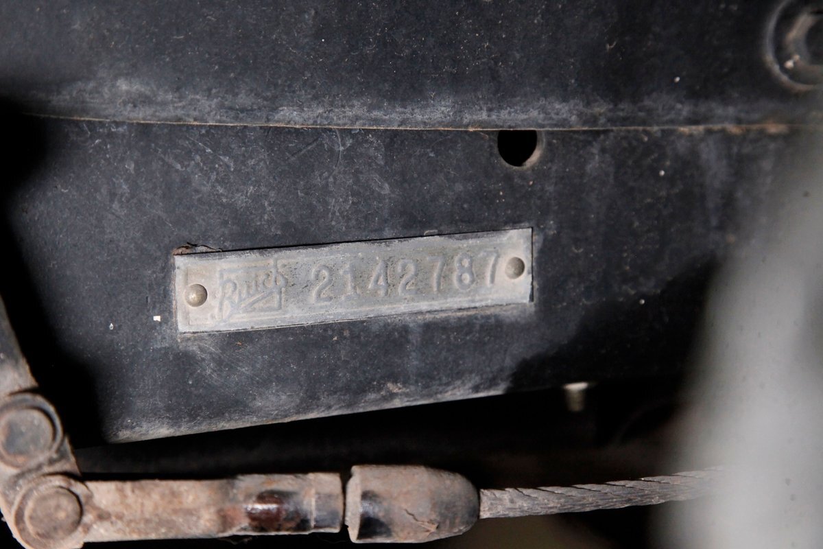 For consignment, a barn find version of the 116 inch wheelbase Buick 116 29-27 4 door sedan. This car has some exterior paint and surface rust issues, some rotting of the interior drivers side floors and the interior, although unique in its wide ribbed corduroy, will need a restoration. The car does not run, so overall it will require some TLC.