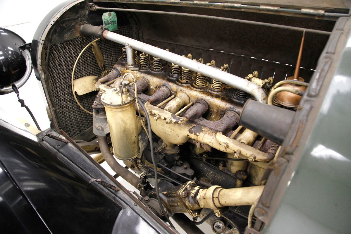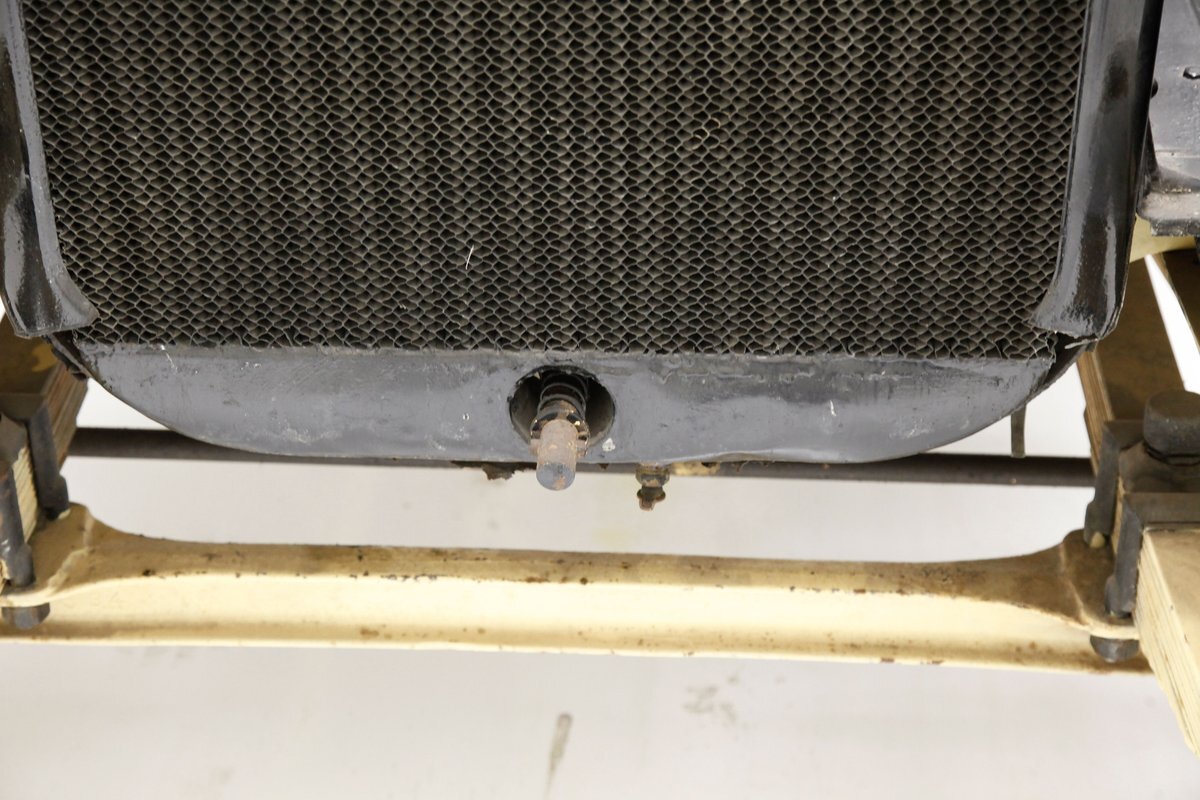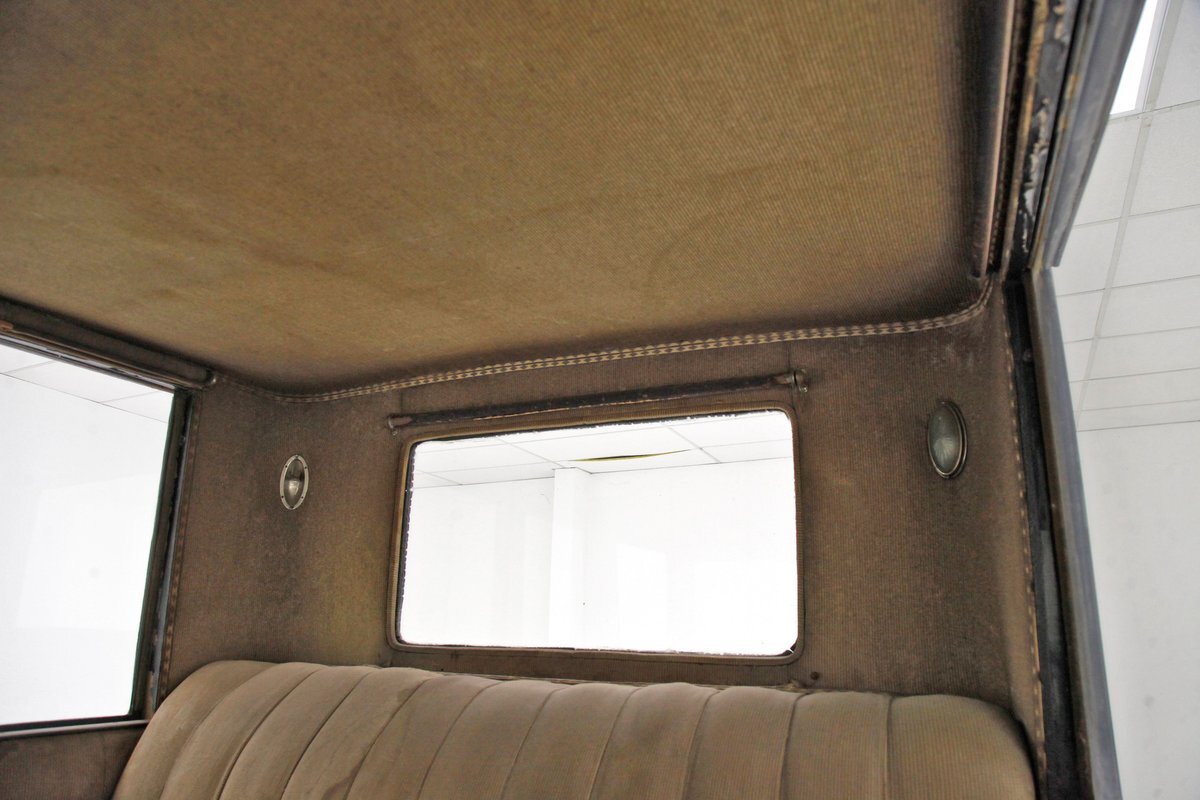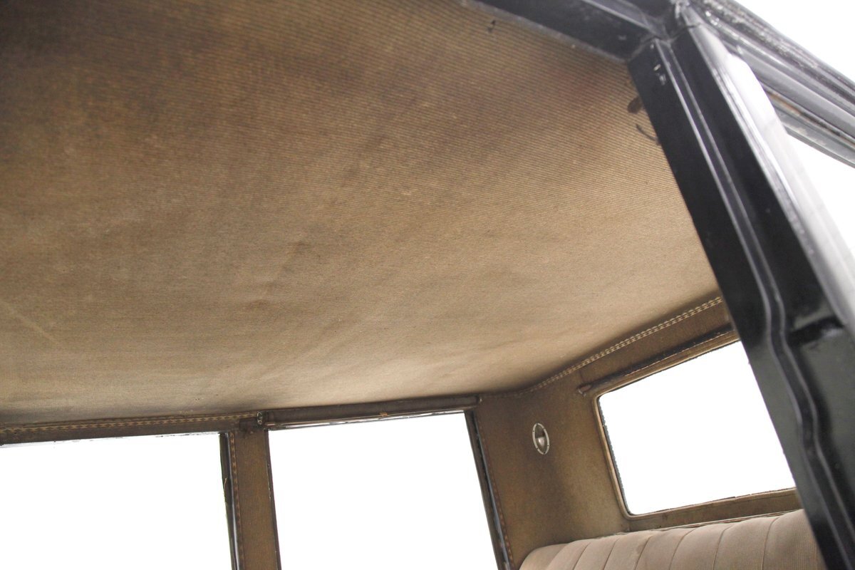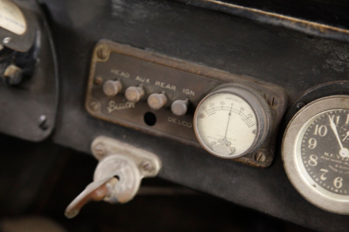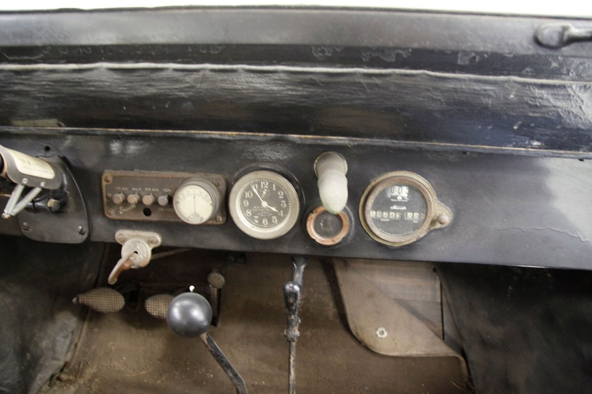 Yards of textured check pattern broadcloth in a tan color way cover the front bucket seats, as well as the rear bench seat. The buckets sit within tan tubs and show with various tears of the upholstery, exposing what may be the original material and padding underneath. A sprawling rear bench, in the same material and color races between the mohair clad sides and while this seat has no tearing but there is substantial staining. Small folding "jump seats" appear from the back of the buckets and could double as a footrest if one chooses not to use the floor mounted board rest. Faded, tattered and soiled tan textured carpet floats this interior and the long armed shifter and parking brake handle rise from the center, just in front of the dash. More tan textured cloth adorns the door panels as well and the headliner to boot with all presenting varying degree of soiling and water stains. A wood rimmed 4 spoke steering wheel with spark advance and throttle controls rests atop the long black column and a tilt out windshield is noted above the black steel dash. Speaking of the dash, it is bedecked with a smattering of factory gauges and push-buttons for the lighting, all showing a properly aged patina.