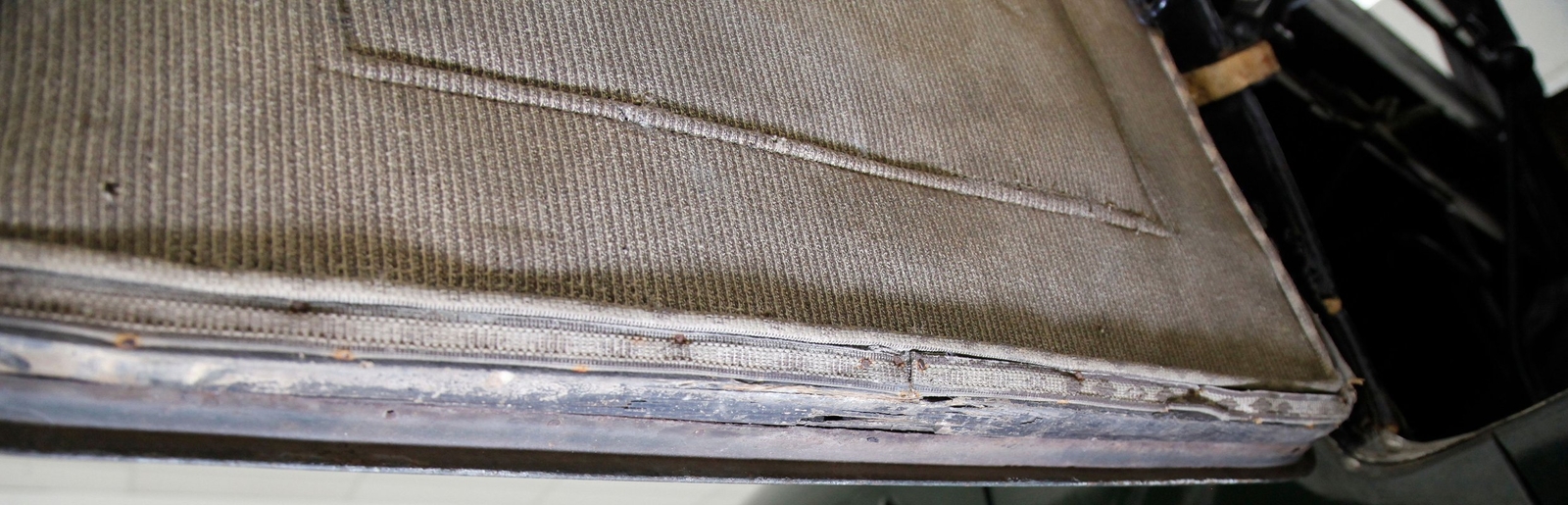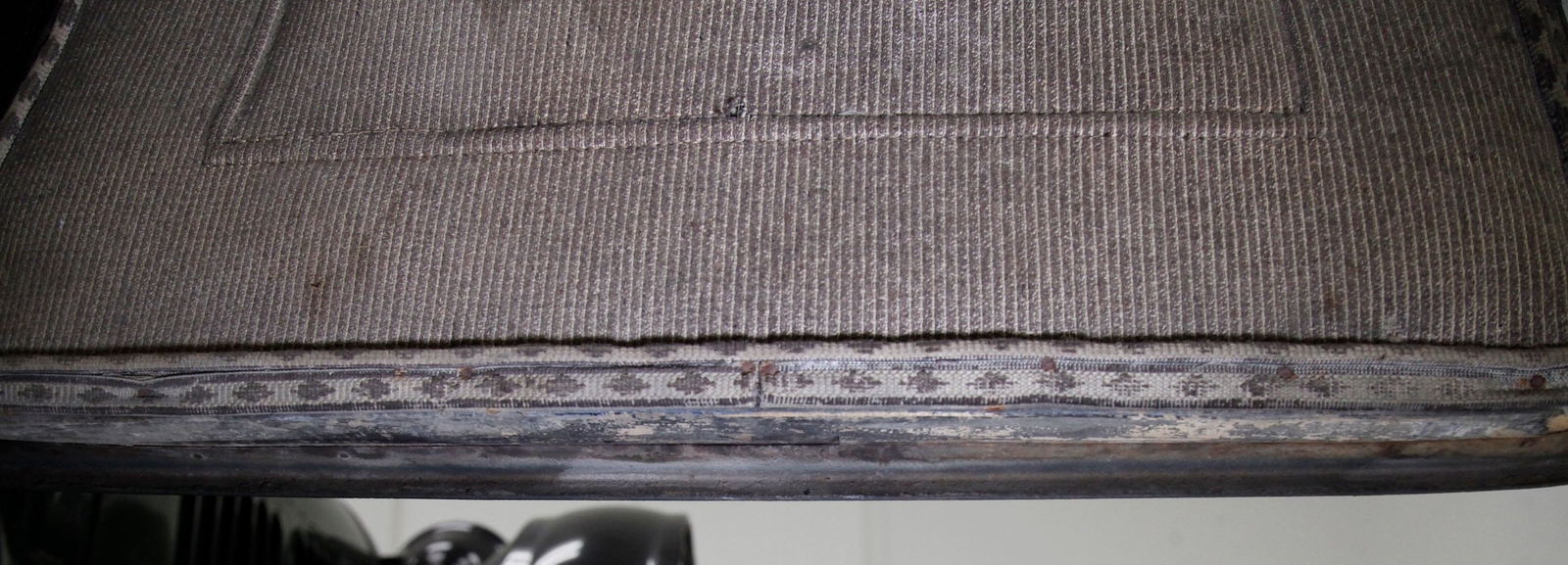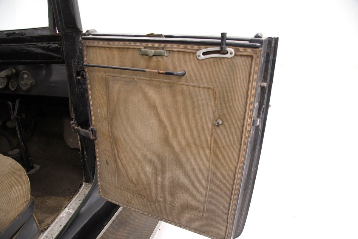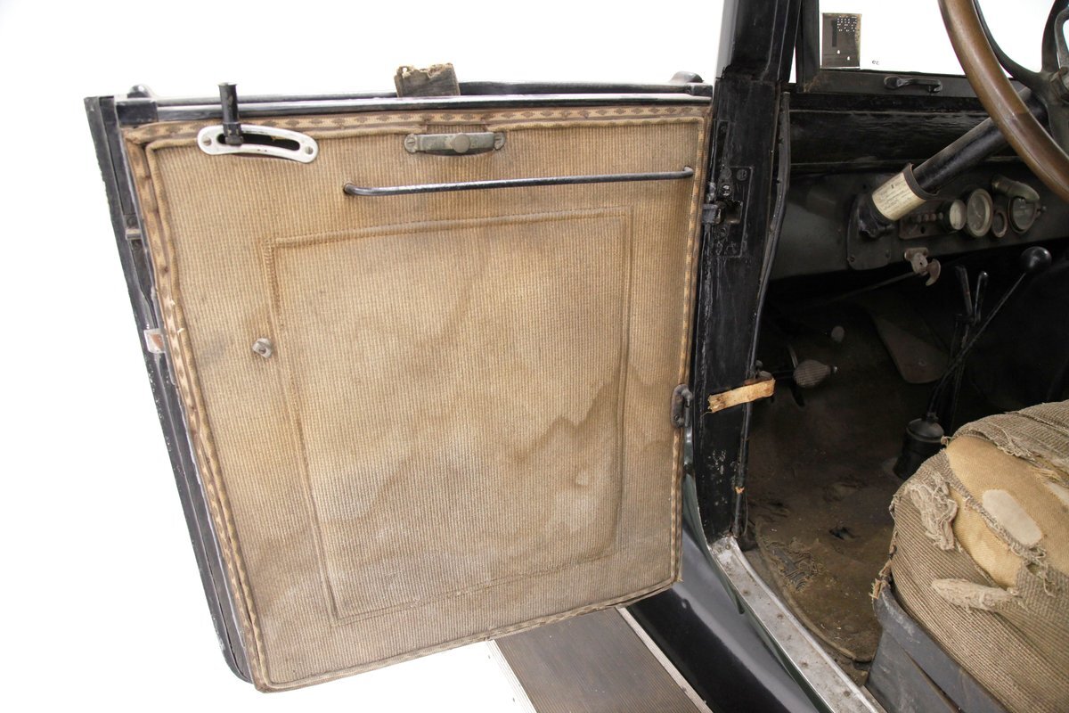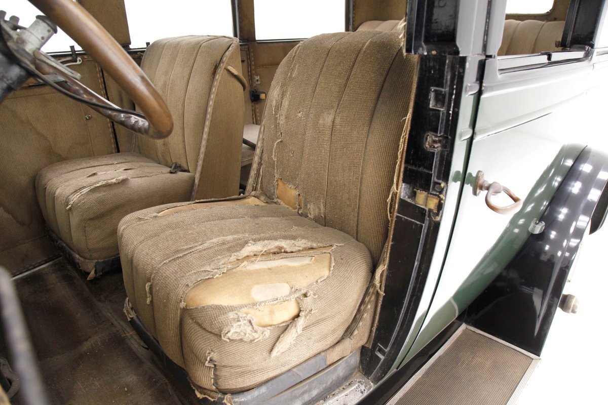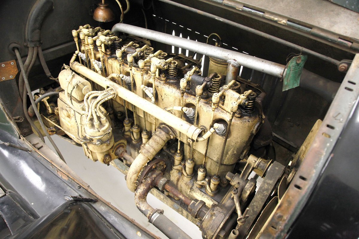 Yards of textured check pattern broadcloth in a tan color way cover the front bucket seats, as well as the rear bench seat. The buckets sit within tan tubs and show with various tears of the upholstery, exposing what may be the original material and padding underneath. A sprawling rear bench, in the same material and color races between the mohair clad sides and while this seat has no tearing but there is substantial staining. Small folding "jump seats" appear from the back of the buckets and could double as a footrest if one chooses not to use the floor mounted board rest. Faded, tattered and soiled tan textured carpet floats this interior and the long armed shifter and parking brake handle rise from the center, just in front of the dash. More tan textured cloth adorns the door panels as well and the headliner to boot with all presenting varying degree of soiling and water stains. A wood rimmed 4 spoke steering wheel with spark advance and throttle controls rests atop the long black column and a tilt out windshield is noted above the black steel dash. Speaking of the dash, it is bedecked with a smattering of factory gauges and push-buttons for the lighting, all showing a properly aged patina.