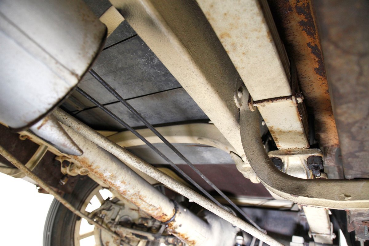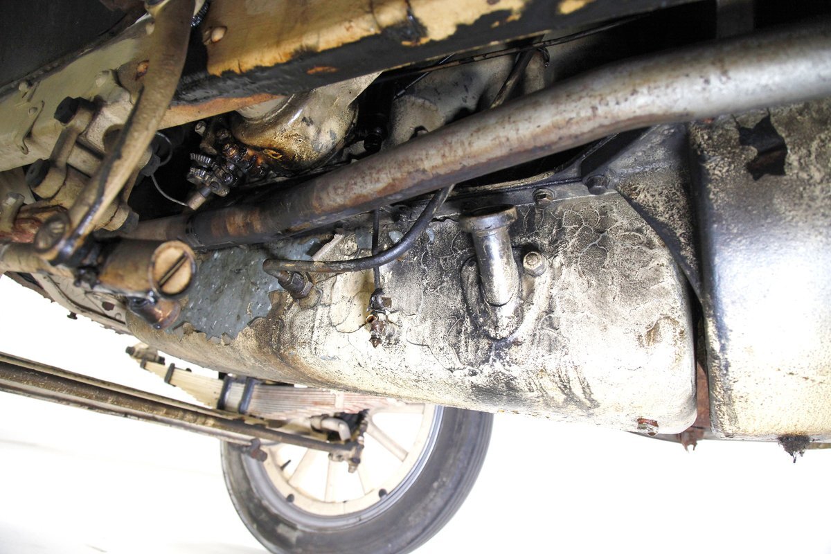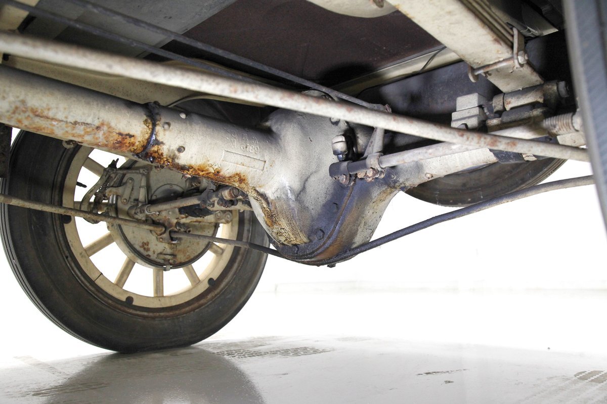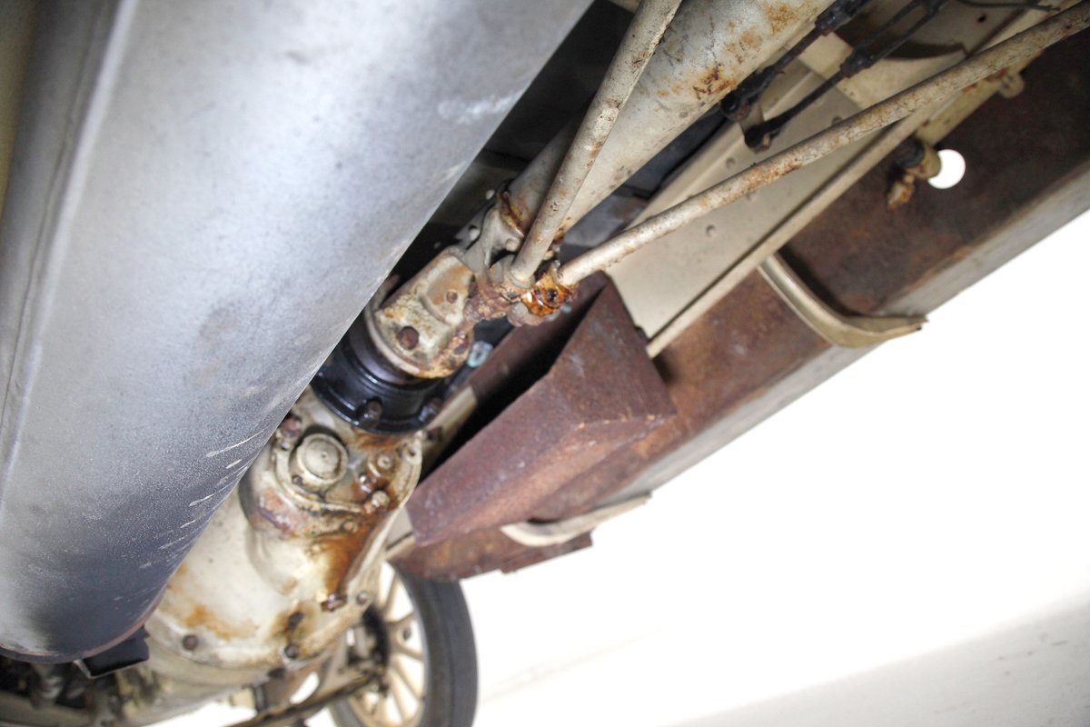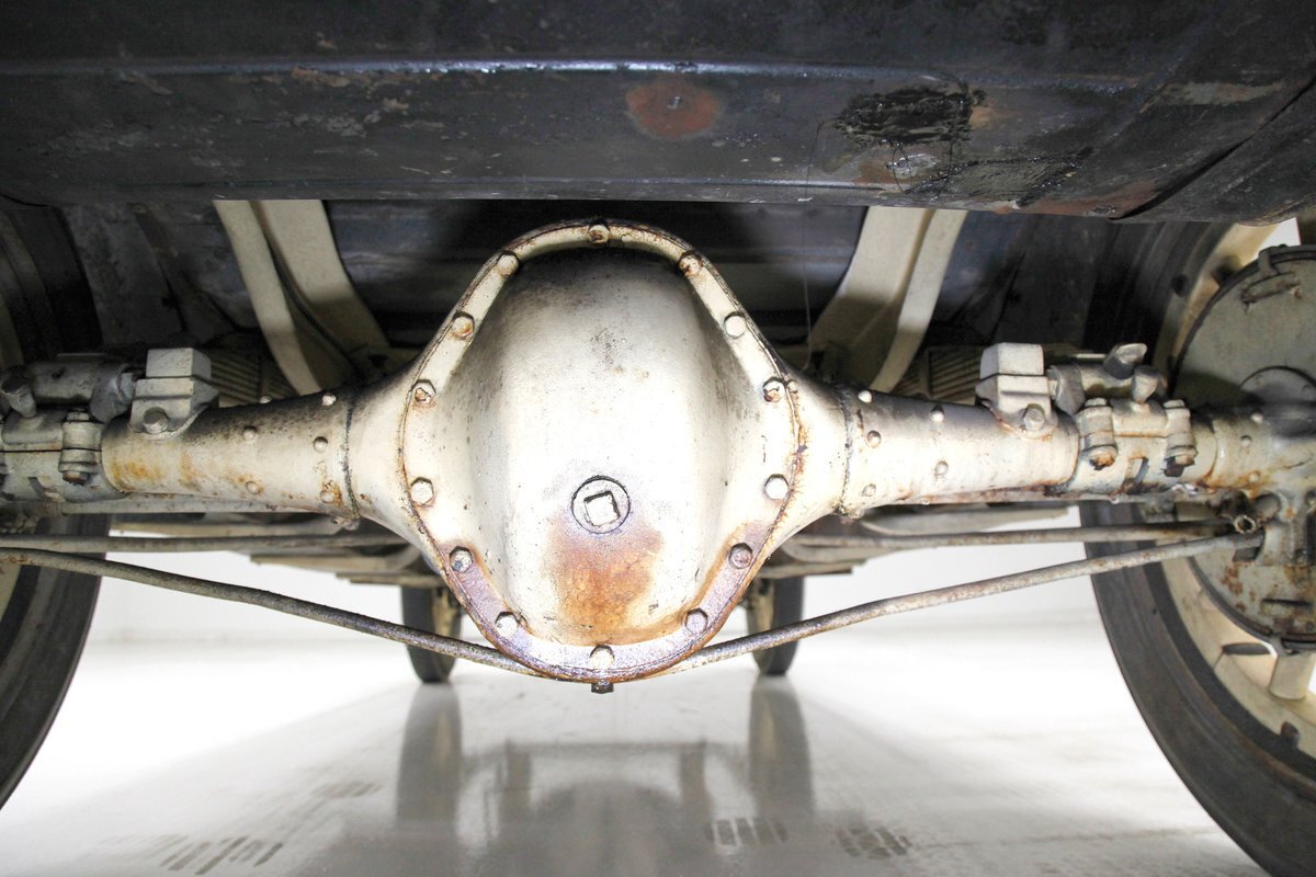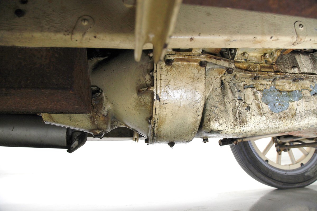 A light coating of surface rust is seen underneath on the untreated components and the wooden floorboards and running boards remain solid though. The framing has a nice coating of straw yellow paint and the rest of the undercarriage follows suit with a slight but appreciable patina to it. Leaf springs give the ride for the front and back and mechanical drum brakes are on the rear, which was the standard of the industry in 1918.
