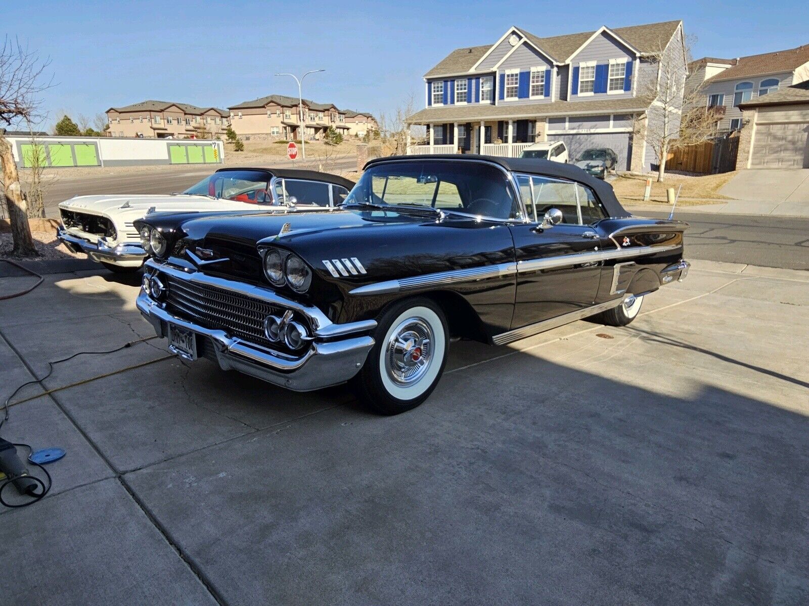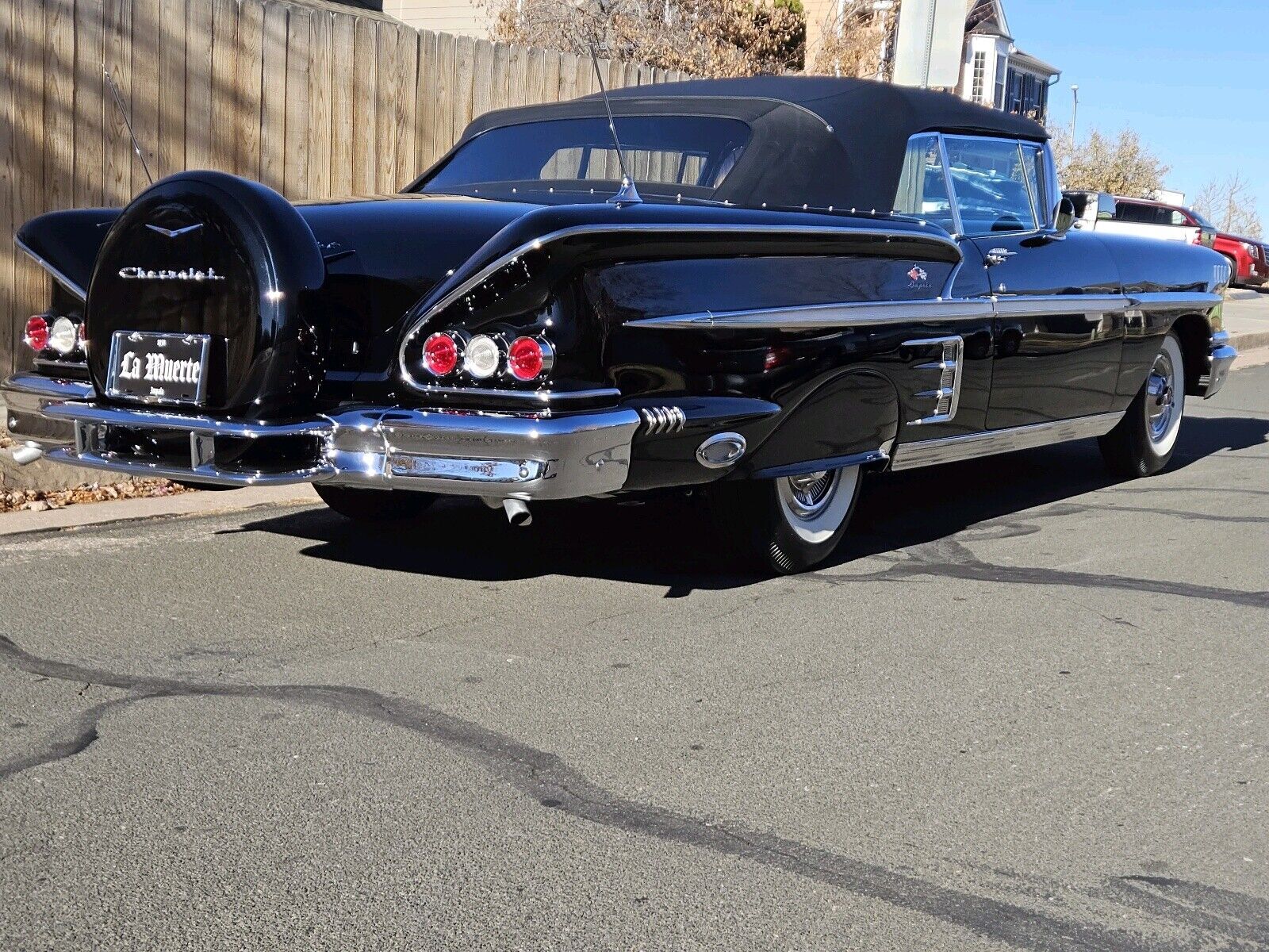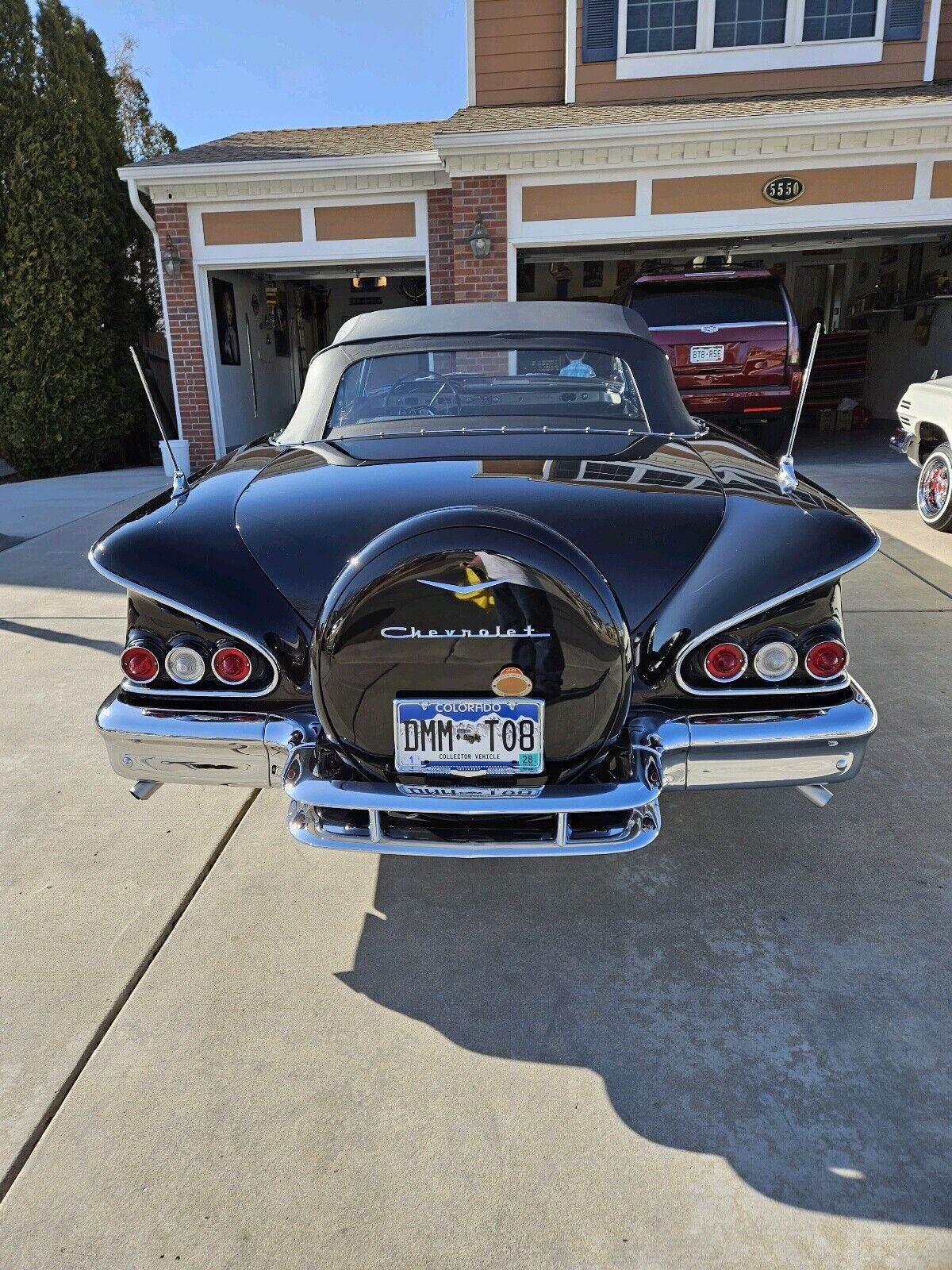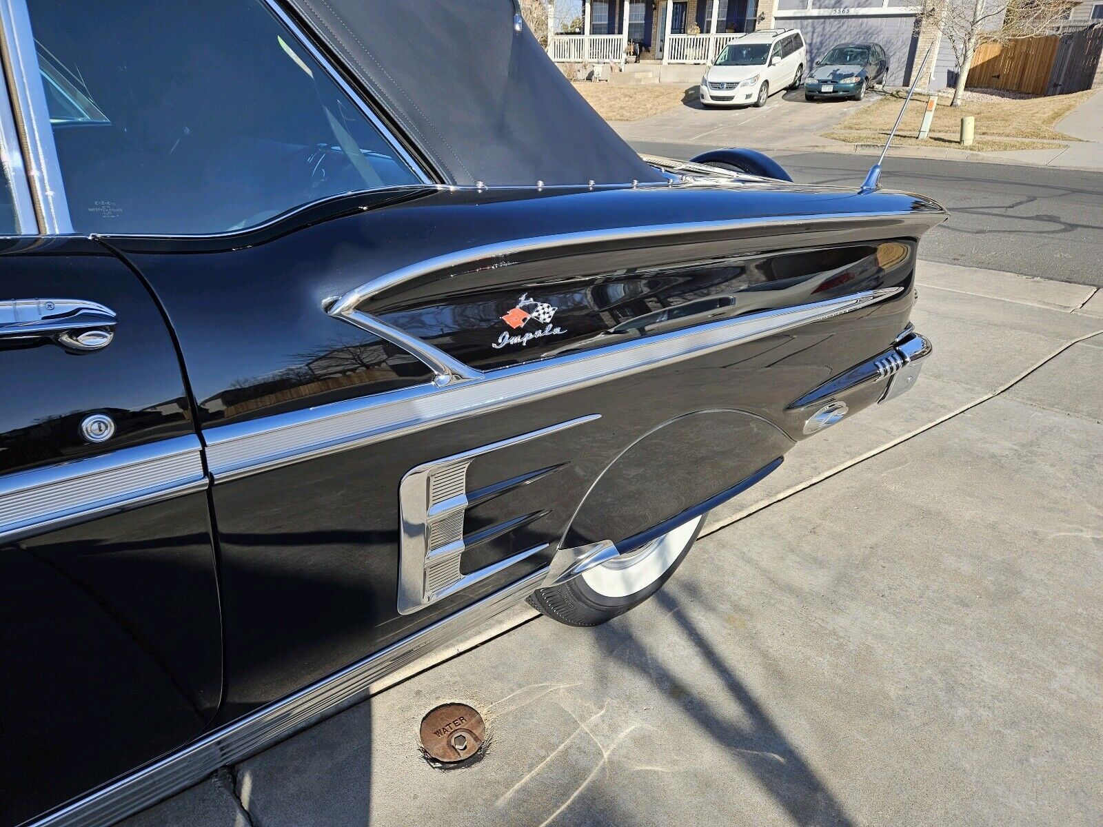 Beautiful rotisserie correct restoration on this real 1958 Impala Convertible with only 55,989 produced. Only 98 miles since restoration, this restoration was done a few years back. This beauty was put back to it original color 900A code in the gorgeous Onyx Black exterior, black convertible top. This Impala was restored to the GM original specifications. Rebuilt 348 ci V-8 with the correct tri-power, backup with the automatic turbo glide transmission. Has power steering, power brakes, power top, wonder bar radio. Correct in every way. National show winner. This vehicle is coming out of a collection that was stored a few years after previous owner passed. Did all the required services and maintenance. This vehicle was restored with all the original correct parts, with minimal reproduction parts. All glass is Ez eye glass. Original continental kit, teardrop fender skirts, beautiful mirror finish Tuxedo Black paint with the Tri-color Trim code- 807 gray, black, turquoise, material cloth and vinyl interior. 900 code car. Red oxide floorboards, new BF Goodrich tires. Factory 14" hubcaps with accessorie spinners. Beautiful bright work with one small ding on driver side front fender spear. Car will need carburetors dialed in and timed due to the Colorado altitude. Brakes need minor adjustment to linkage from brake pedal to power brake booster. Power brake booster was professionally Rebuilt. This car has over the money spent in the restoration of the asking price. This classic only has 98 miles since the restoration. Car has always been in a climate controlled environment with a car cover over it. Previous owner restored and did not get to finish and enjoy it. I got this vehicle to enjoy and fulfill a life time dream. It's unfortunate I don't have the time to enjoy this beautiful car and ready to part with it. This car is ready for a collector or car enthusiasts. This is the breakdown for this cowl tag