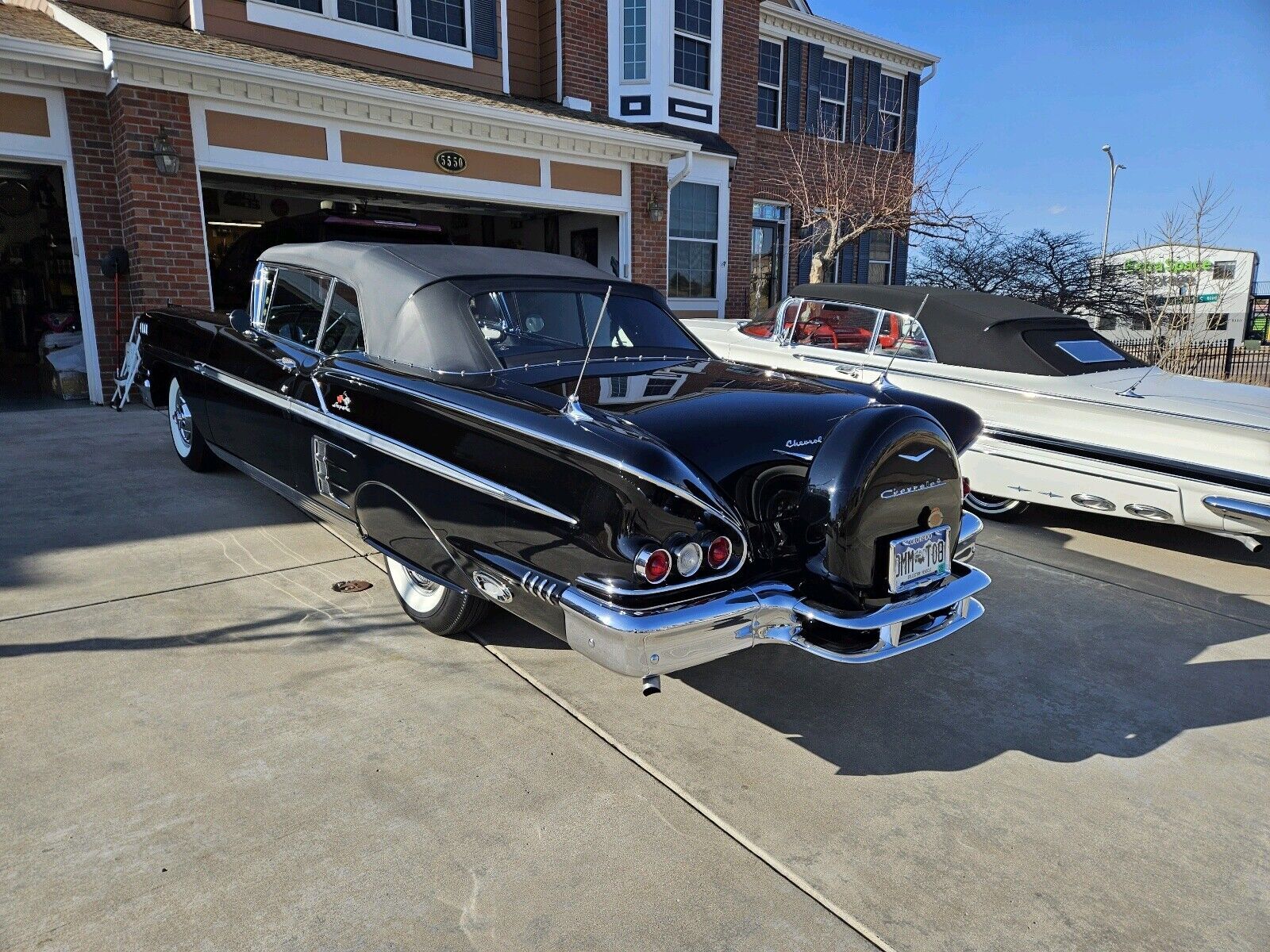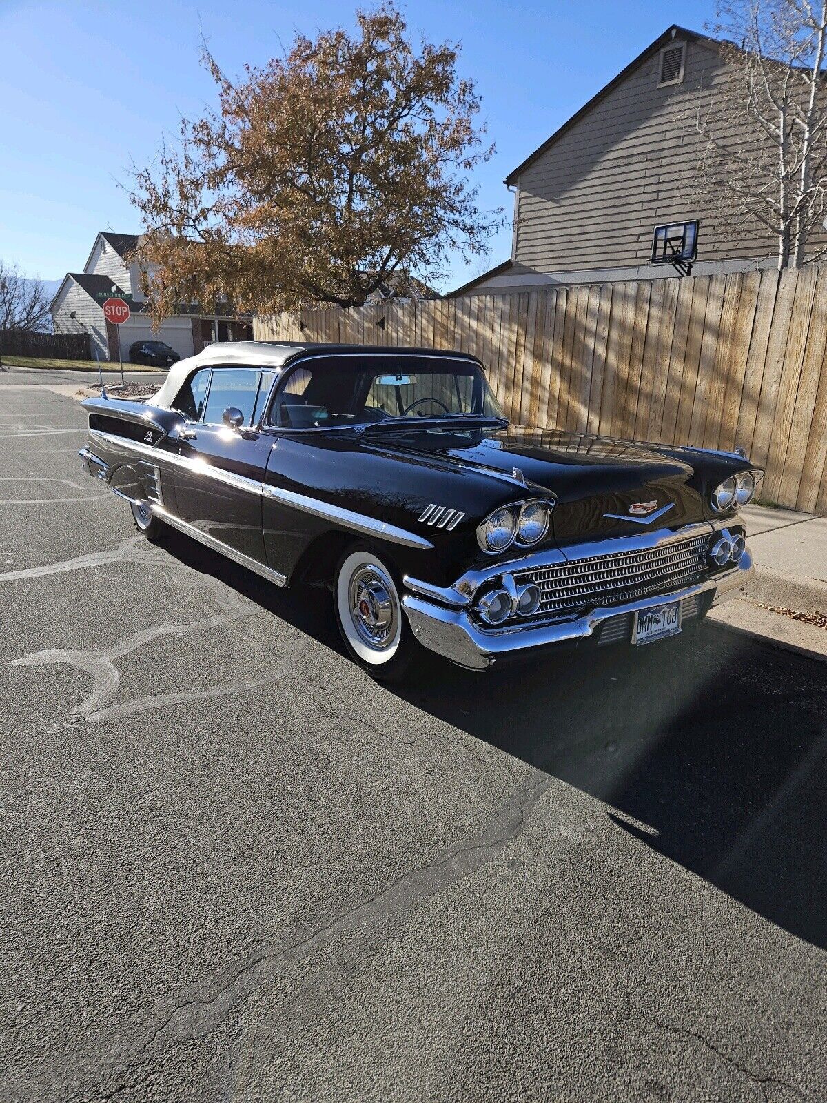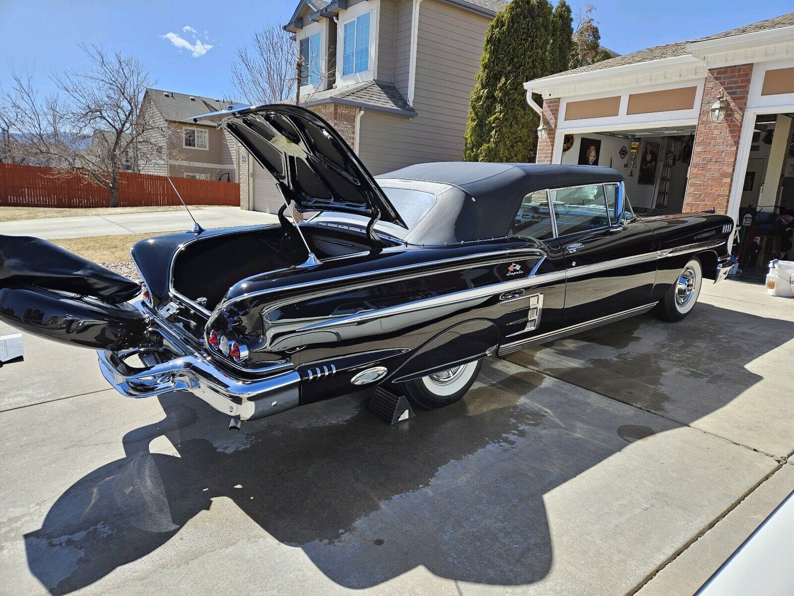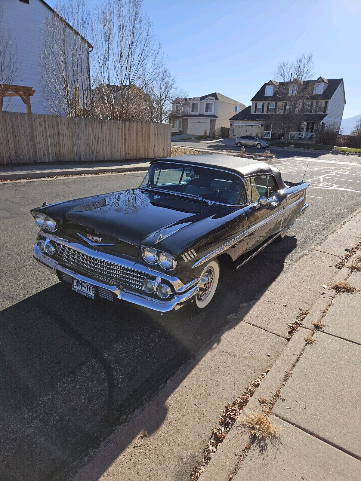 Beautiful rotisserie correct restoration on this real 1958 Impala Convertible with only 55,989 produced. Only 98 miles since restoration, this restoration was done a few years back. This beauty was put back to it original color 900A code in the gorgeous Onyx Black exterior, black convertible top. This Impala was restored to the GM original specifications. Rebuilt 348 ci V-8 with the correct tri-power, backup with the automatic turbo glide transmission. Has power steering, power brakes, power top, wonder bar radio. Correct in every way. National show winner. This vehicle is coming out of a collection that was stored a few years after previous owner passed. Did all the required services and maintenance. This vehicle was restored with all the original correct parts, with minimal reproduction parts. All glass is Ez eye glass. Original continental kit, teardrop fender skirts, beautiful mirror finish Tuxedo Black paint with the Tri-color Trim code- 807 gray, black, turquoise, material cloth and vinyl interior. 900 code car. Red oxide floorboards, new BF Goodrich tires. Factory 14" hubcaps with accessorie spinners. Beautiful bright work with one small ding on driver side front fender spear. Car will need carburetors dialed in and timed due to the Colorado altitude. Brakes need minor adjustment to linkage from brake pedal to power brake booster. Power brake booster was professionally Rebuilt. This car has over the money spent in the restoration of the asking price. This classic only has 98 miles since the restoration. Car has always been in a climate controlled environment with a car cover over it. Previous owner restored and did not get to finish and enjoy it. I got this vehicle to enjoy and fulfill a life time dream. It's unfortunate I don't have the time to enjoy this beautiful car and ready to part with it. This car is ready for a collector or car enthusiasts. This is the breakdown for this cowl tag
