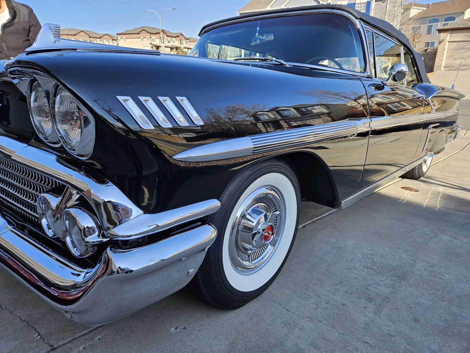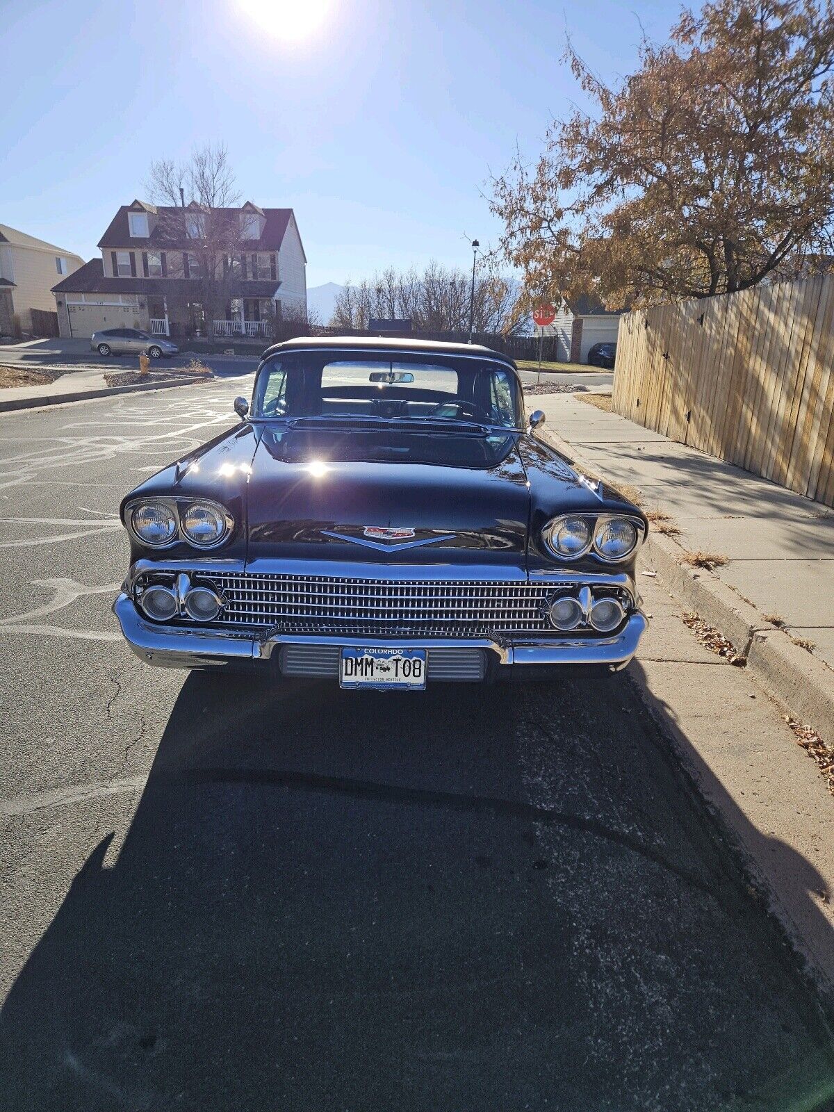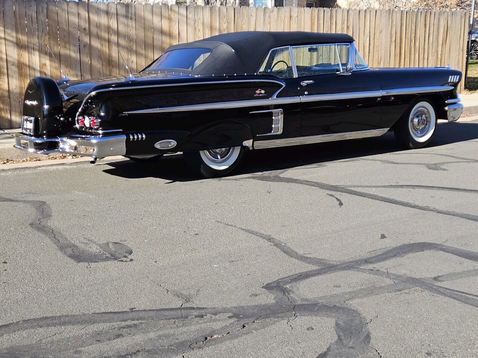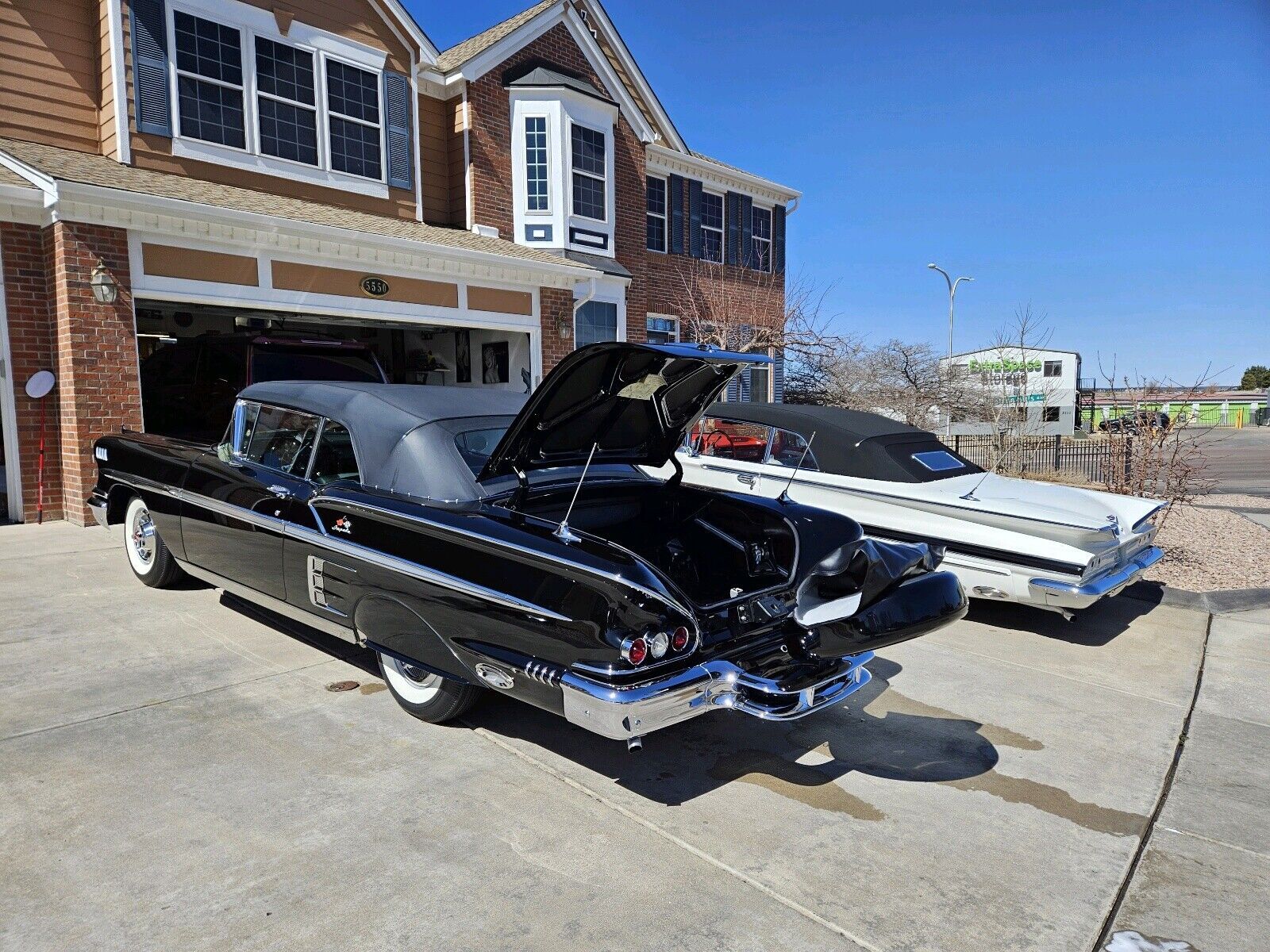 Beautiful rotisserie correct restoration on this real 1958 Impala Convertible with only 55,989 produced. Only 98 miles since restoration, this restoration was done a few years back. This beauty was put back to it original color 900A code in the gorgeous Onyx Black exterior, black convertible top. This Impala was restored to the GM original specifications. Rebuilt 348 ci V-8 with the correct tri-power, backup with the automatic turbo glide transmission. Has power steering, power brakes, power top, wonder bar radio. Correct in every way. National show winner. This vehicle is coming out of a collection that was stored a few years after previous owner passed. Did all the required services and maintenance. This vehicle was restored with all the original correct parts, with minimal reproduction parts. All glass is Ez eye glass. Original continental kit, teardrop fender skirts, beautiful mirror finish Tuxedo Black paint with the Tri-color Trim code- 807 gray, black, turquoise, material cloth and vinyl interior. 900 code car. Red oxide floorboards, new BF Goodrich tires. Factory 14" hubcaps with accessorie spinners. Beautiful bright work with one small ding on driver side front fender spear. Car will need carburetors dialed in and timed due to the Colorado altitude. Brakes need minor adjustment to linkage from brake pedal to power brake booster. Power brake booster was professionally Rebuilt. This car has over the money spent in the restoration of the asking price. This classic only has 98 miles since the restoration. Car has always been in a climate controlled environment with a car cover over it. Previous owner restored and did not get to finish and enjoy it. I got this vehicle to enjoy and fulfill a life time dream. It's unfortunate I don't have the time to enjoy this beautiful car and ready to part with it. This car is ready for a collector or car enthusiasts. This is the breakdown for this cowl tag
