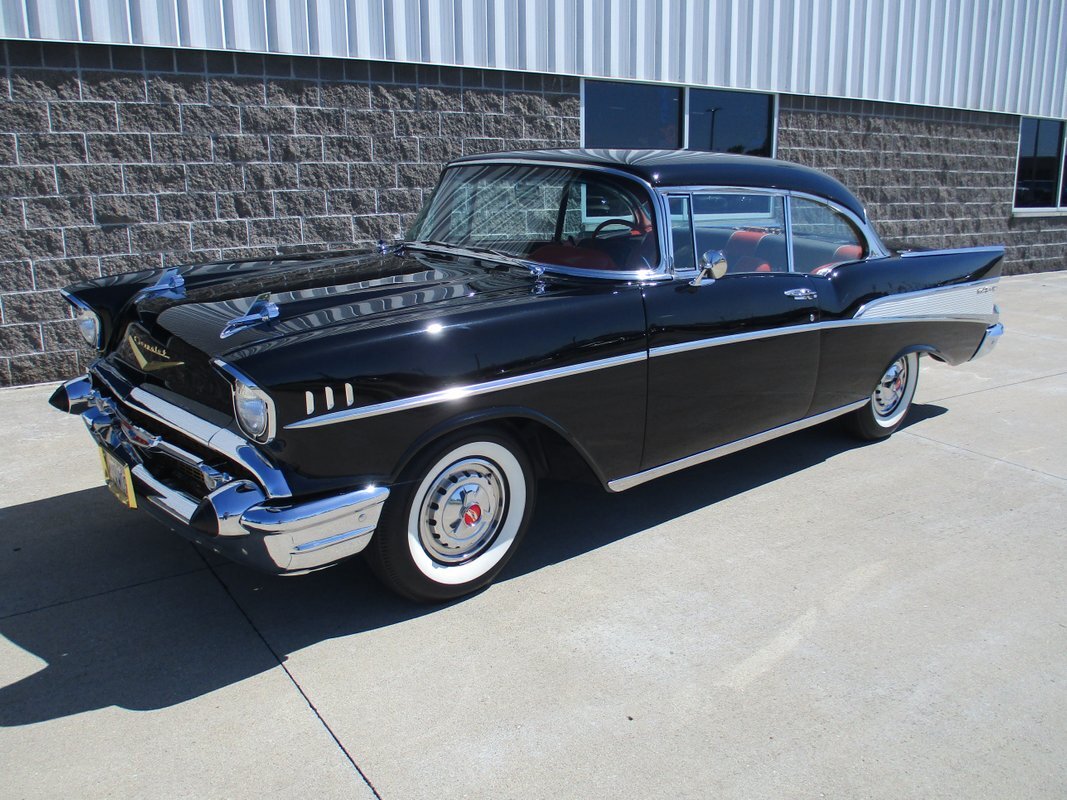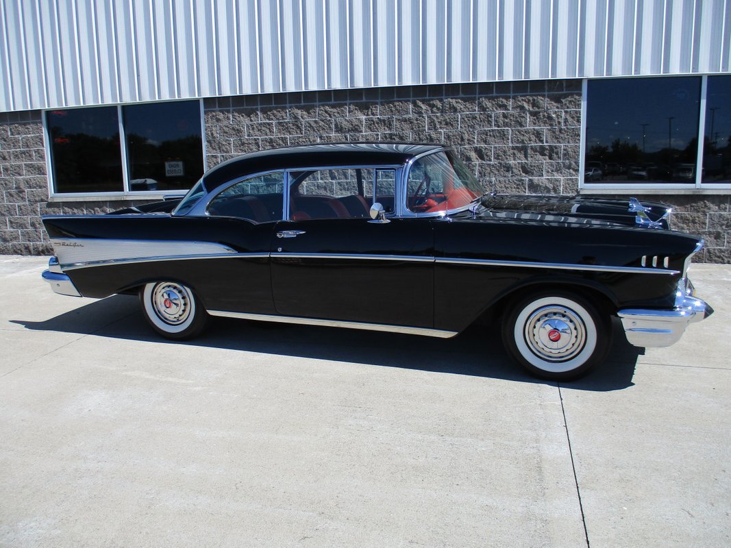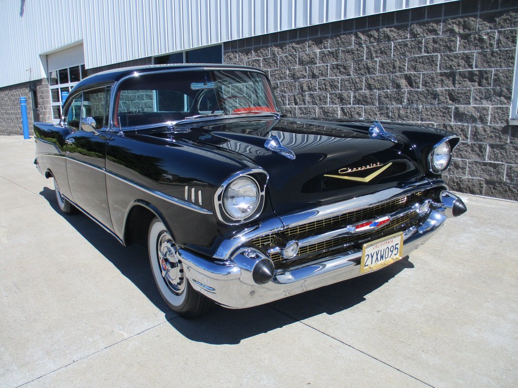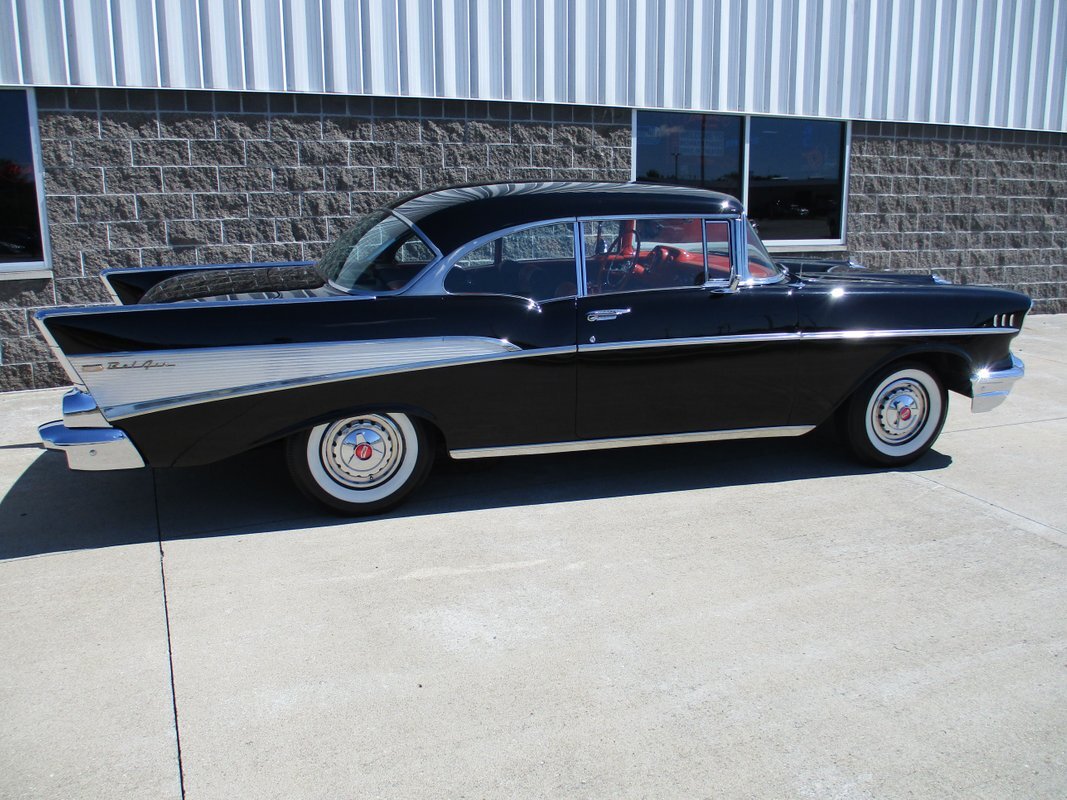 This is a very nicely restored 1957 Chevrolet Bel Air Sport Coupe, a classic American icon that epitomizes the golden era of automotive design. This striking example is finished in a sleek Black exterior, complemented by a beautiful Red and Black cloth interior. Originally built in Oakland, California, this Bel Air remained a California treasure until 1992, preserving its heritage and condition. Under the hood, it boasts a robust 283 cubic inch V8 engine with a four-barrel carburetor, paired with a smooth two-speed Powerglide automatic transmission.