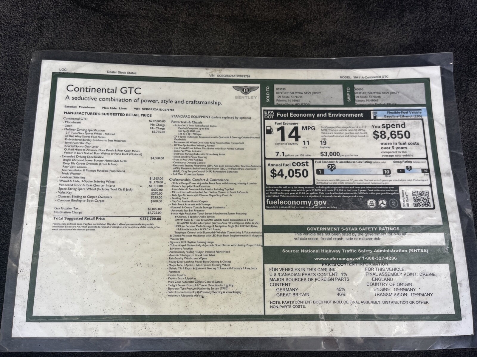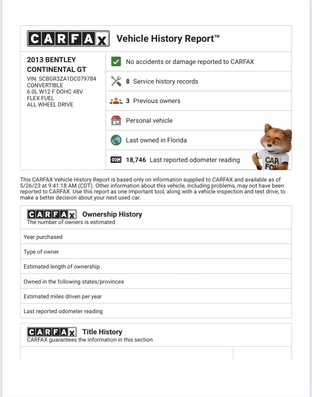 THIS IS A TRUE EXAMPLE OF A PRISTINE 2013 BENTLEY CONTINENTAL GTC CONVERTIBLE. THE VEHICLE IS COMPLETELY FACTORY WITH ALL MANUALS, BOOKS & ORIGINAL WINDOW STICKER. IT IS IN LIKE NEW CONDITION WITH ONLY 26,359 ORIGINAL PAMPERED MILES.
