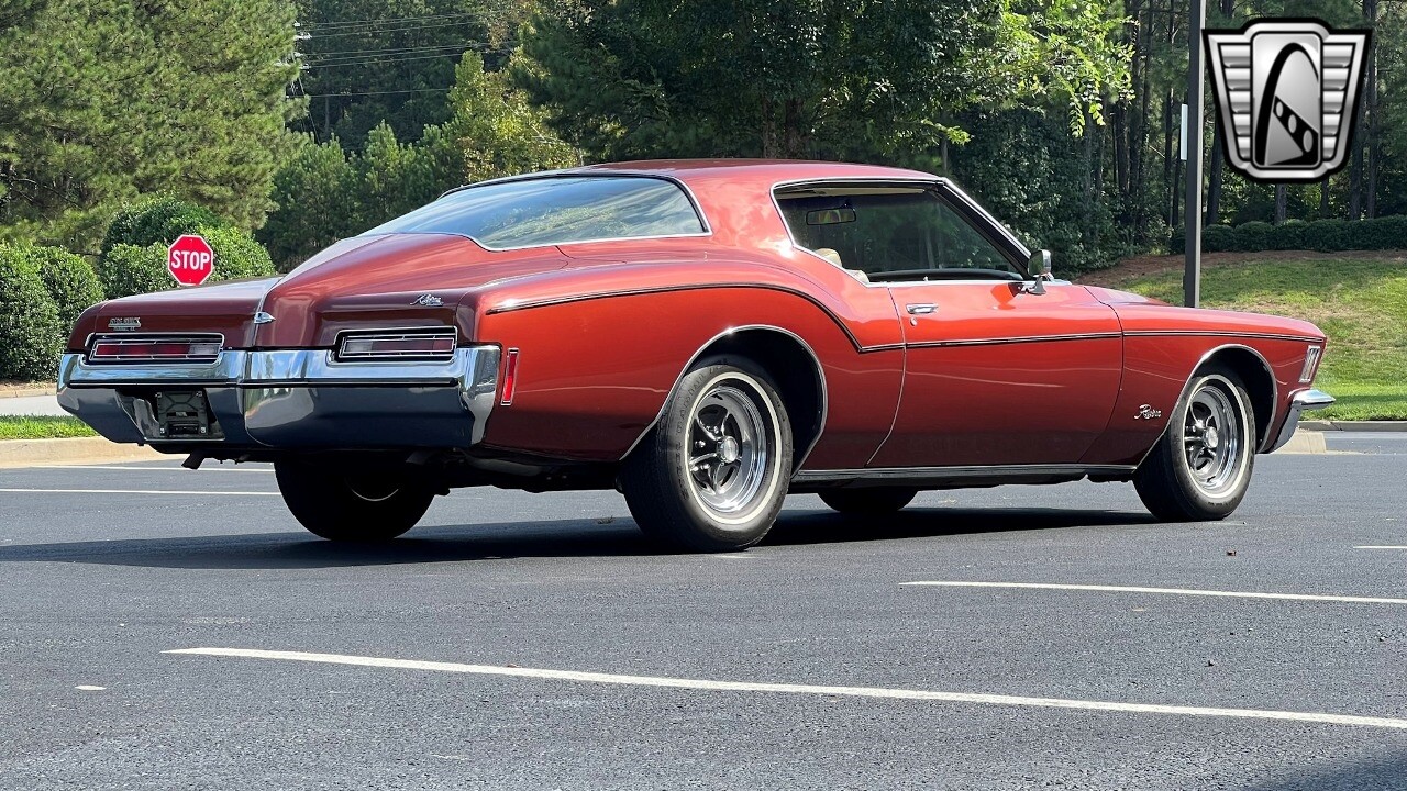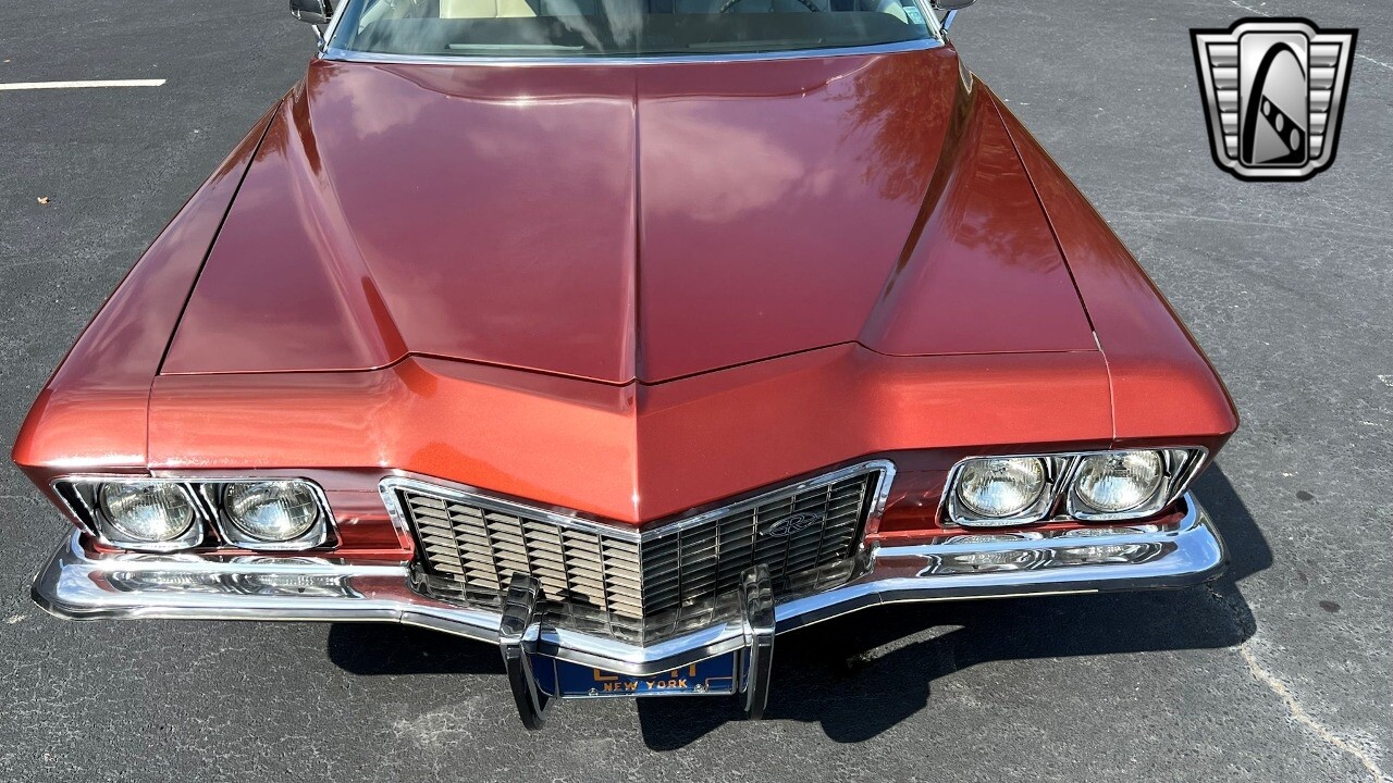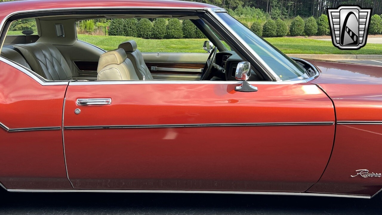 For sale is a striking 1972 Buick Riviera, bathed in a vibrant, eye-catching orange color that beautifully complements the sleek proportions and standout design of this classic ride. The Riviera's sense of luxury and style continues inside with a pristine white interior which provides a clean, refreshing contrast to the bold exterior color.