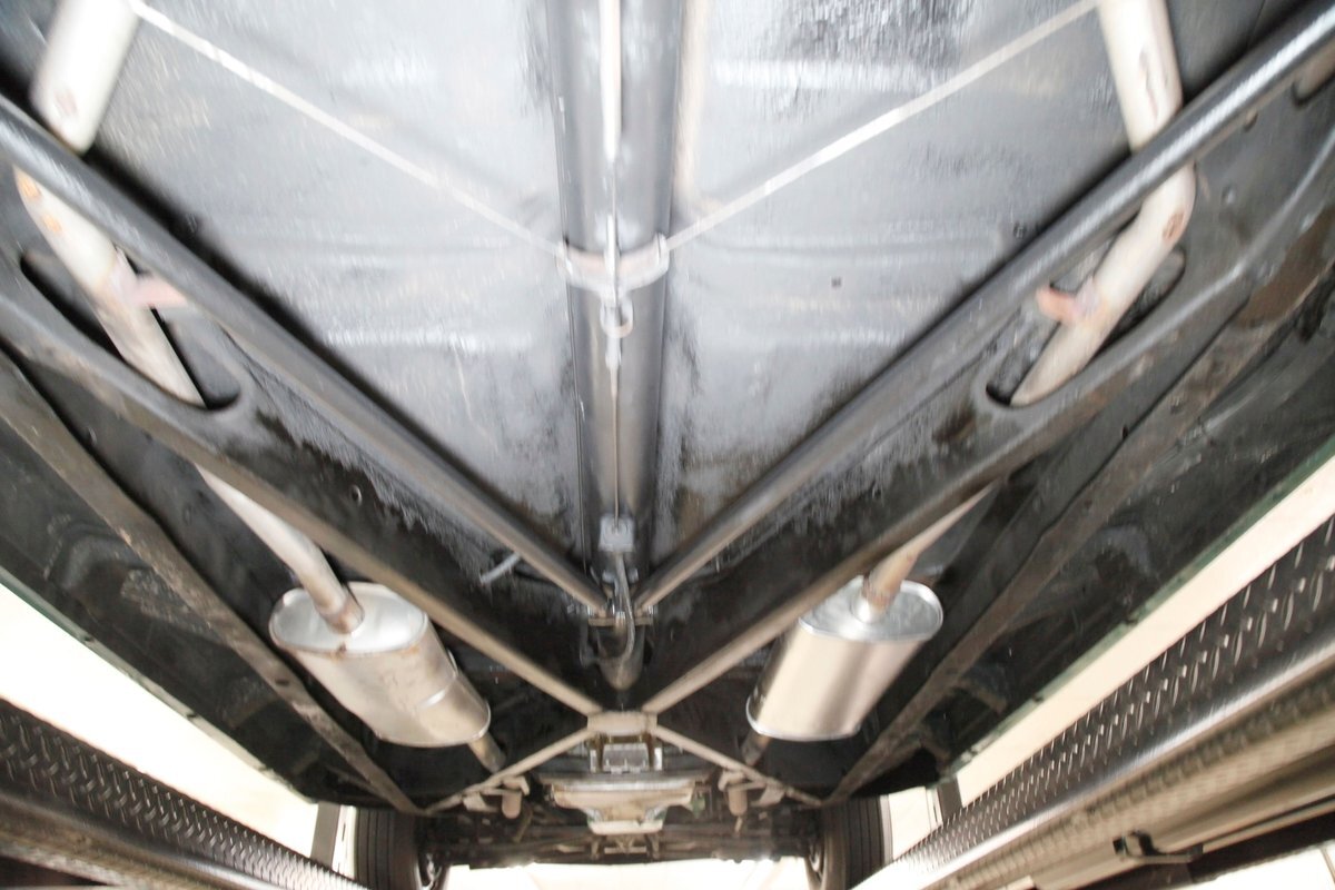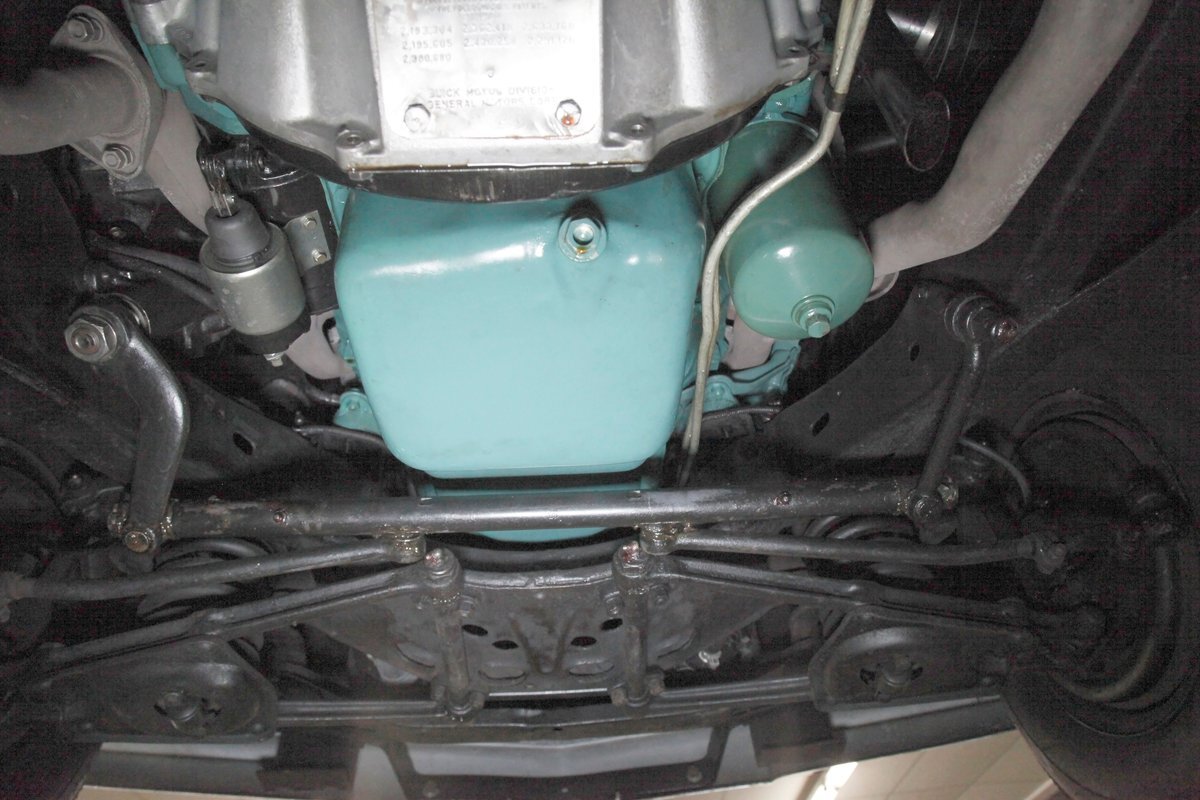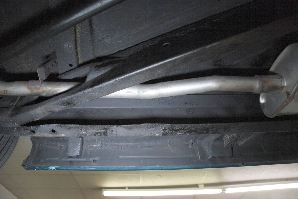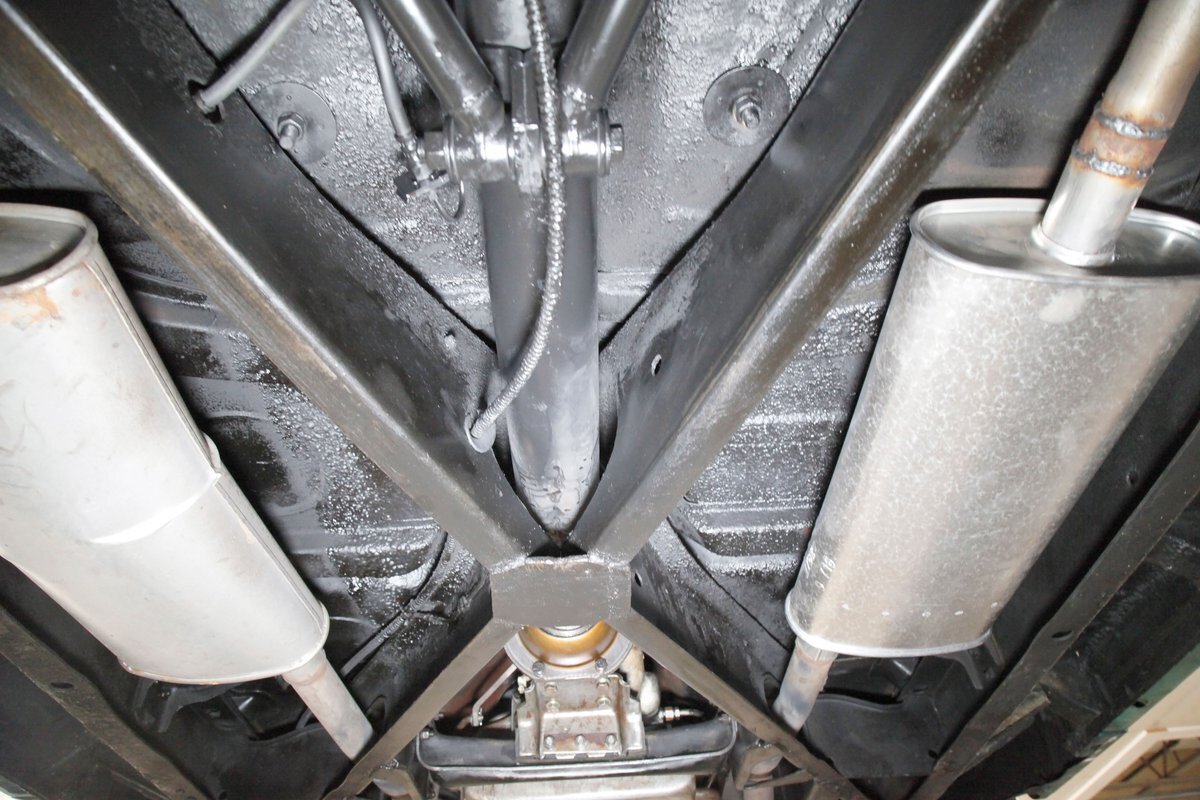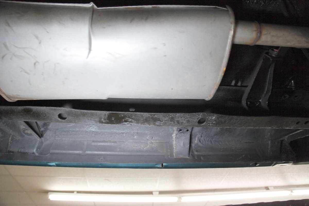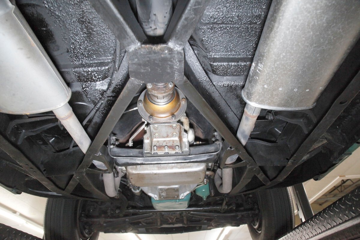 Underneath is all solid for the X framing as well as the stamped steel floor pans and inner fenders. There is a lot of black paint and undercoating on the flooring and frame and has kept this large skate all structurally sound. Independent coil spring suspension and leaf spring suspension provide the ride front and rear and power drum braking is all around. A new dual exhaust is in for the exhale and we note this car is equipped with power steering.
