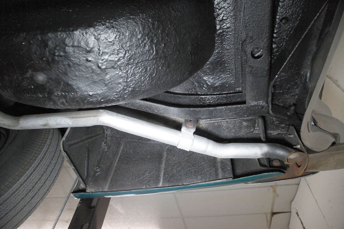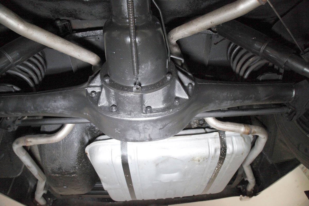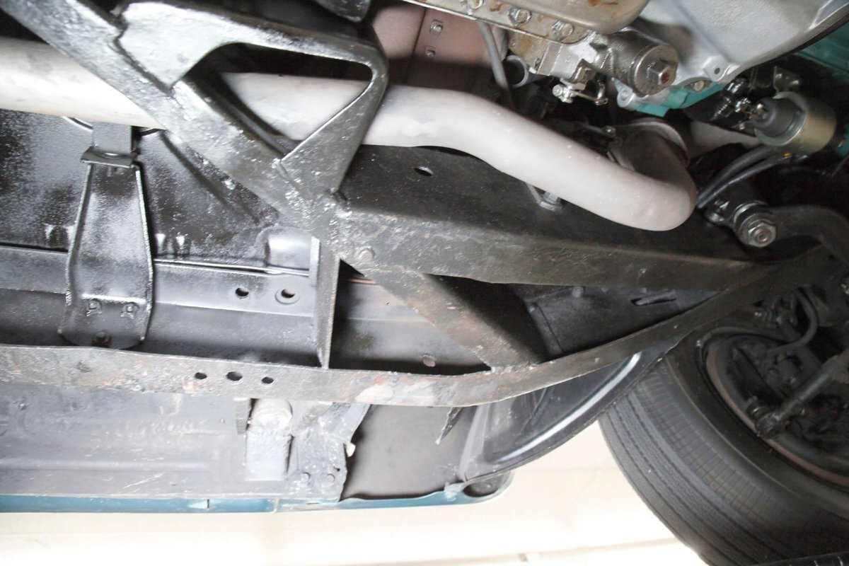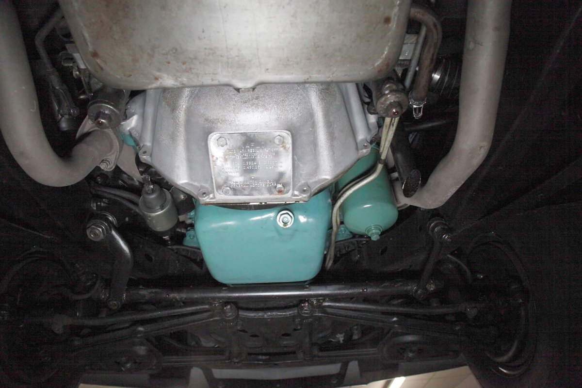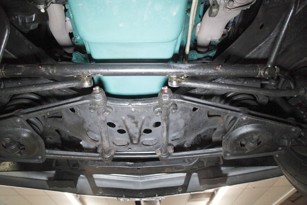 Underneath is all solid for the X framing as well as the stamped steel floor pans and inner fenders. There is a lot of black paint and undercoating on the flooring and frame and has kept this large skate all structurally sound. Independent coil spring suspension and leaf spring suspension provide the ride front and rear and power drum braking is all around. A new dual exhaust is in for the exhale and we note this car is equipped with power steering.