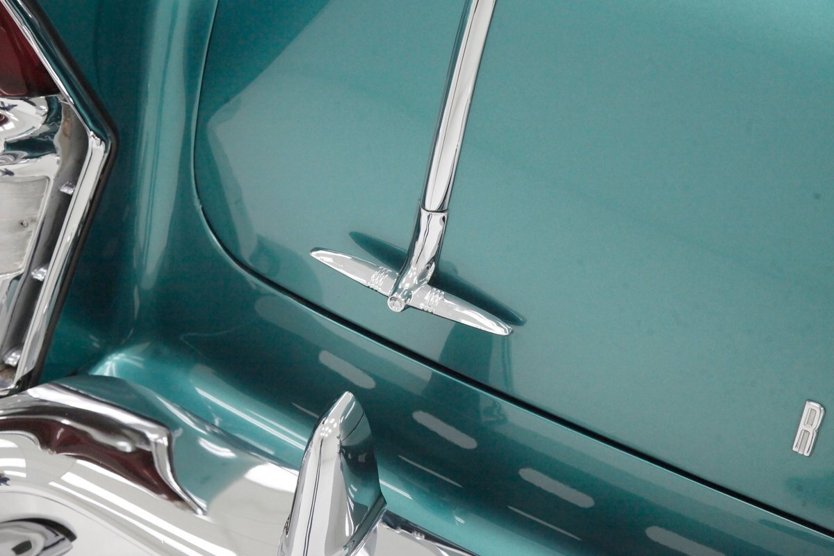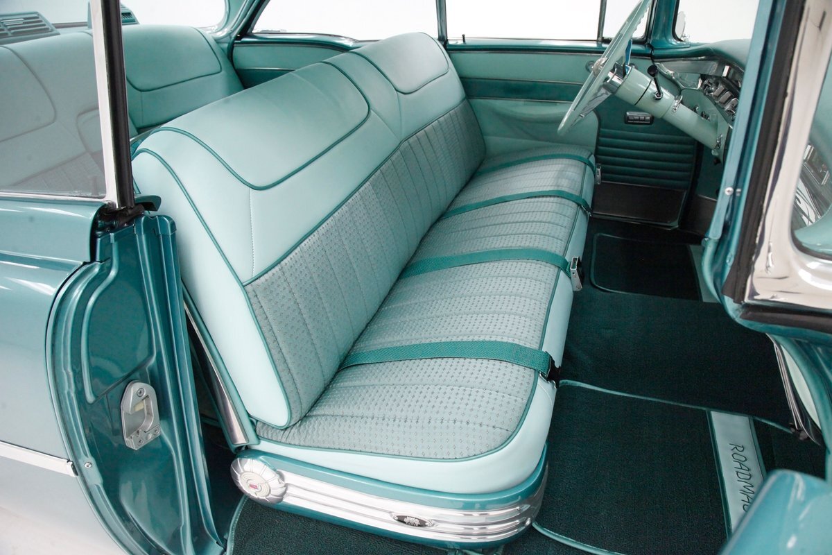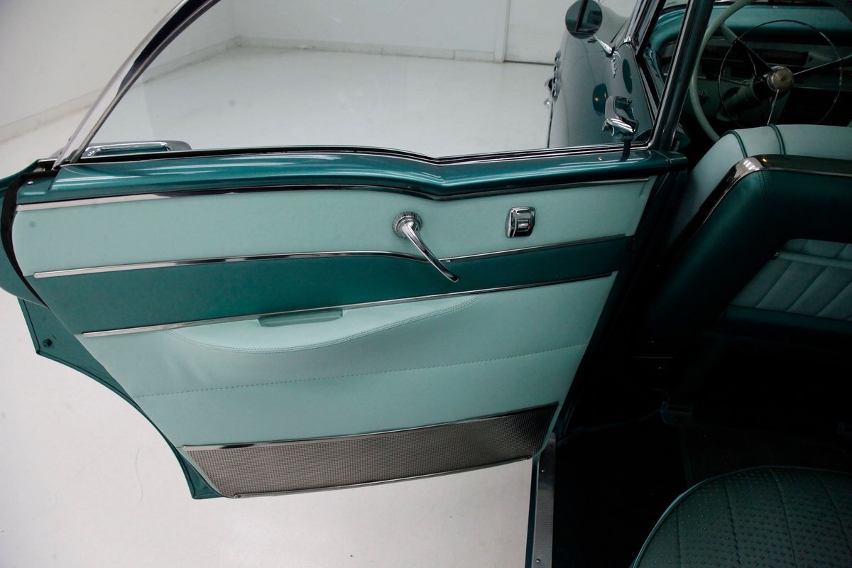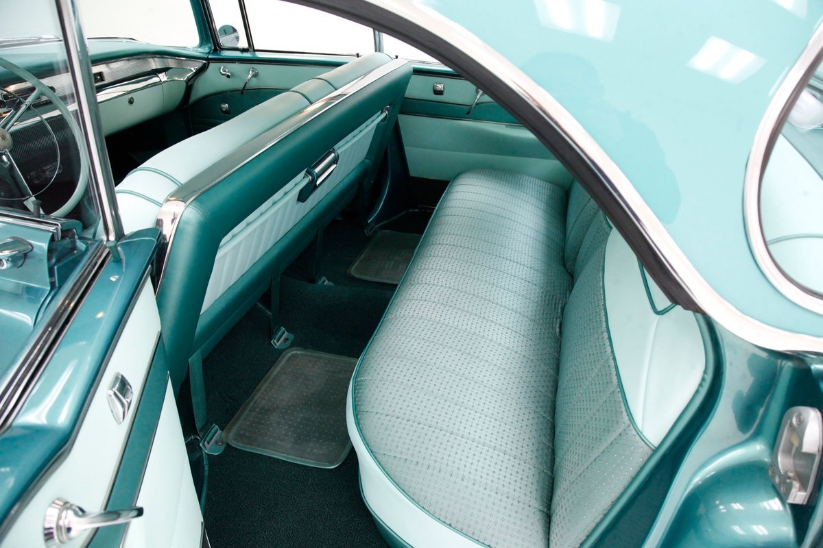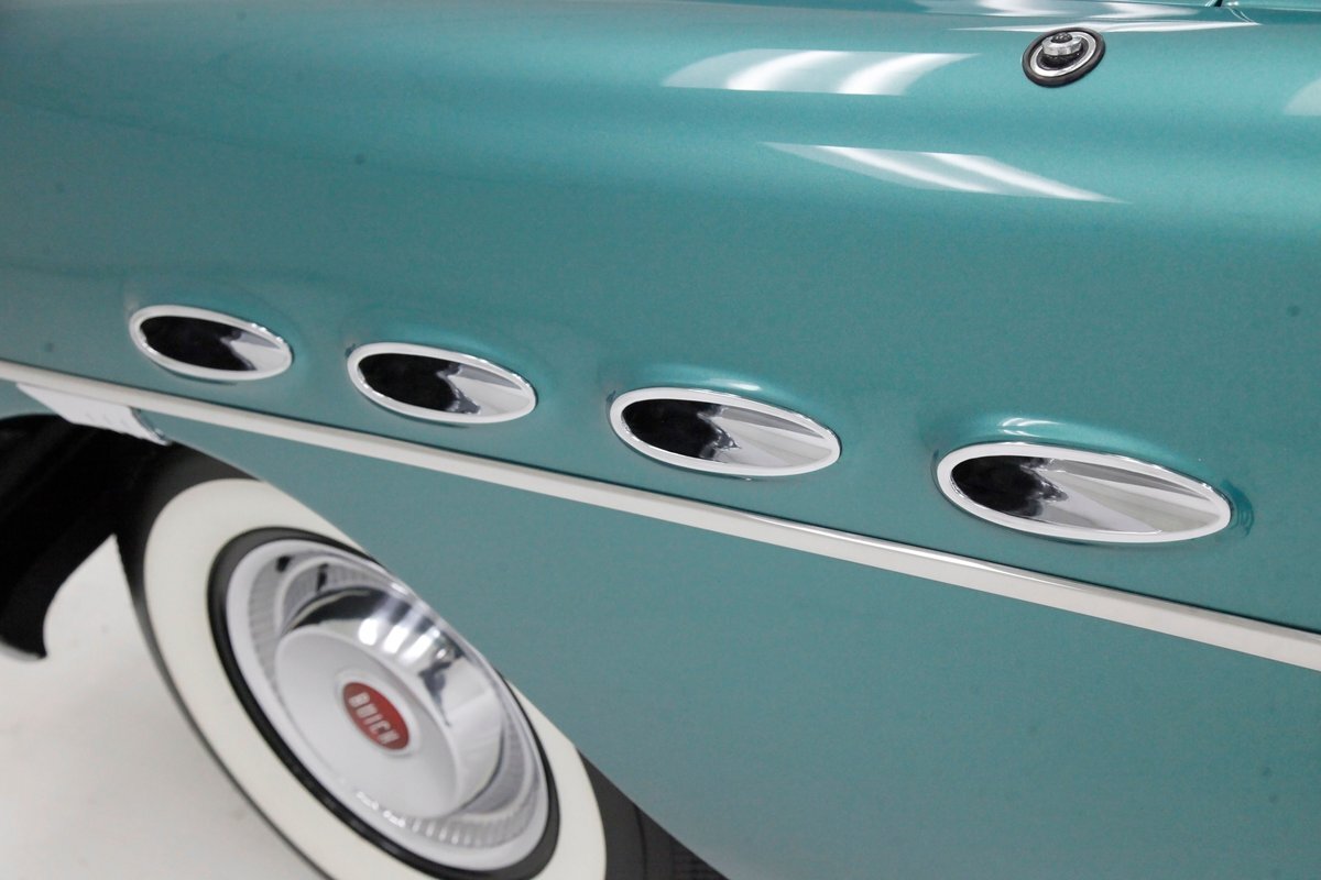 The front of the car is worth the price of admission! Big chromed dagmars frame the edges of what is a two tier bumper, the upper on either side flows over the horizontally ribbed chrome grille and wrapping around the front quarters, and the second being the lower bumper which is nice and wide and very shiny also wrapping aprons in the front quarter. An upper thick chromed arch frames the top of the grille and the lower edge of the hood. A single visor bezel chromed headlight with a smaller signal light outboard and underneath resides on the edge of each quarter in front. B U I C K badging for the front of the massive hood and a Jet Age plane hood ornament dresses things up and we have just visited the front of this car!! Front quarters with their gunsight toppers, a large hood, as well as the lowers down from the passenger compartment beltline and trunk are bathed in miles deep Spruce Green Metallic. The roof finishes off with Foam Green paint providing the perfect contrast. The swoop spear which starts at the headlights and runs past the front door, where it takes a shape, drops then rises to match the rear wheel well and heads straight back to the mid rear quarter, with Spruce Green all around. The iconic 4 portholes in Buick style are on the mid section of the front quarters and would be the Buick signature for many years to come. A chrome encircled wrap-around front window and rear wrap-around glass frame the edges of the Foam Green roof and more chrome highlights the pillarless side glass. On the back, large chromed chevrons house the tail lights and backup lights which melt into the massive rear bumper and just above are the trunk badges which are not fooling around with chrome either! Wide whites and some black accented wheels have polished BUICK badged wheel coverings.