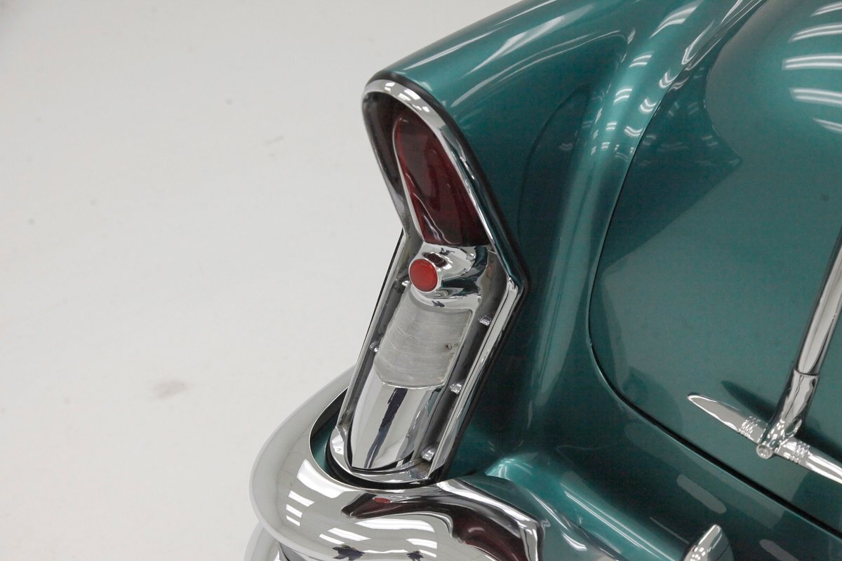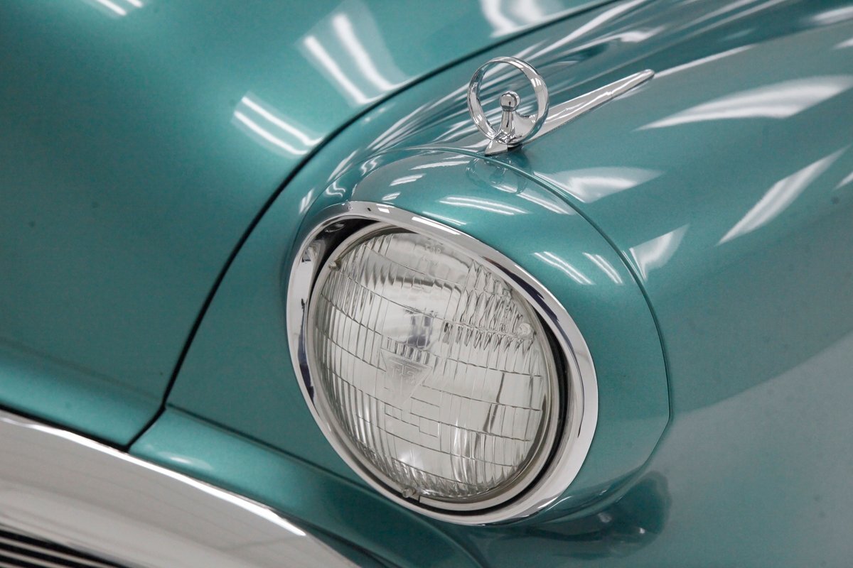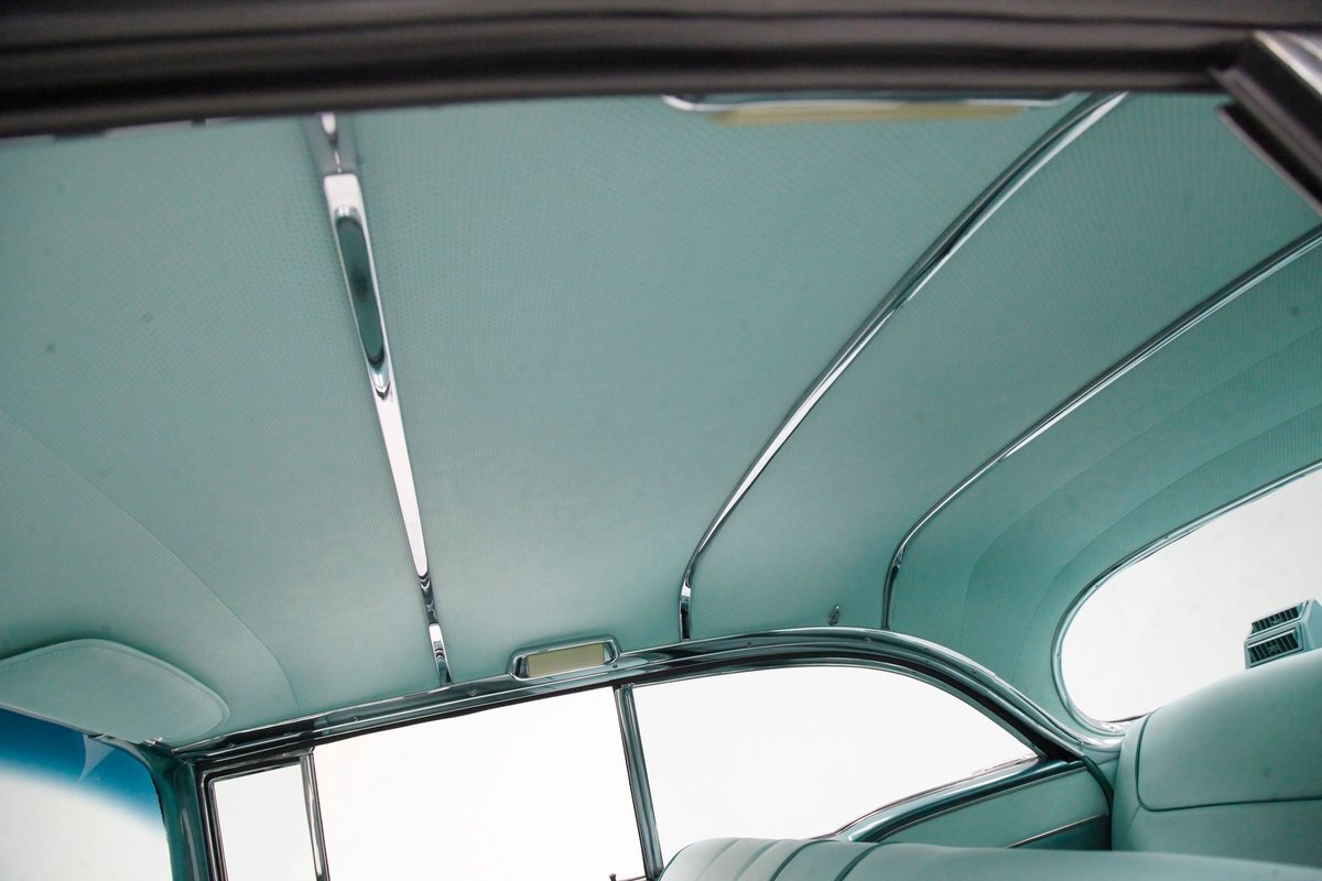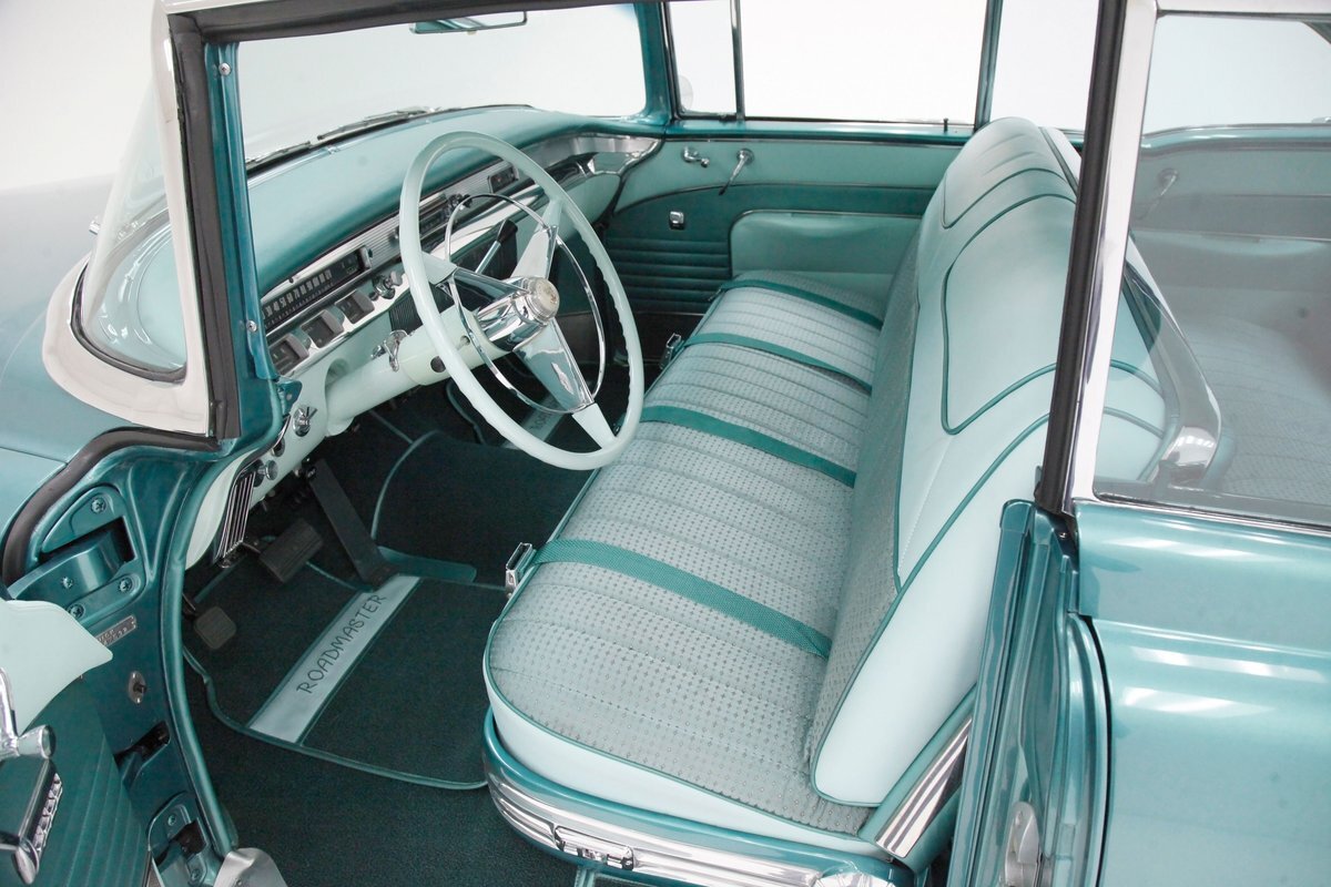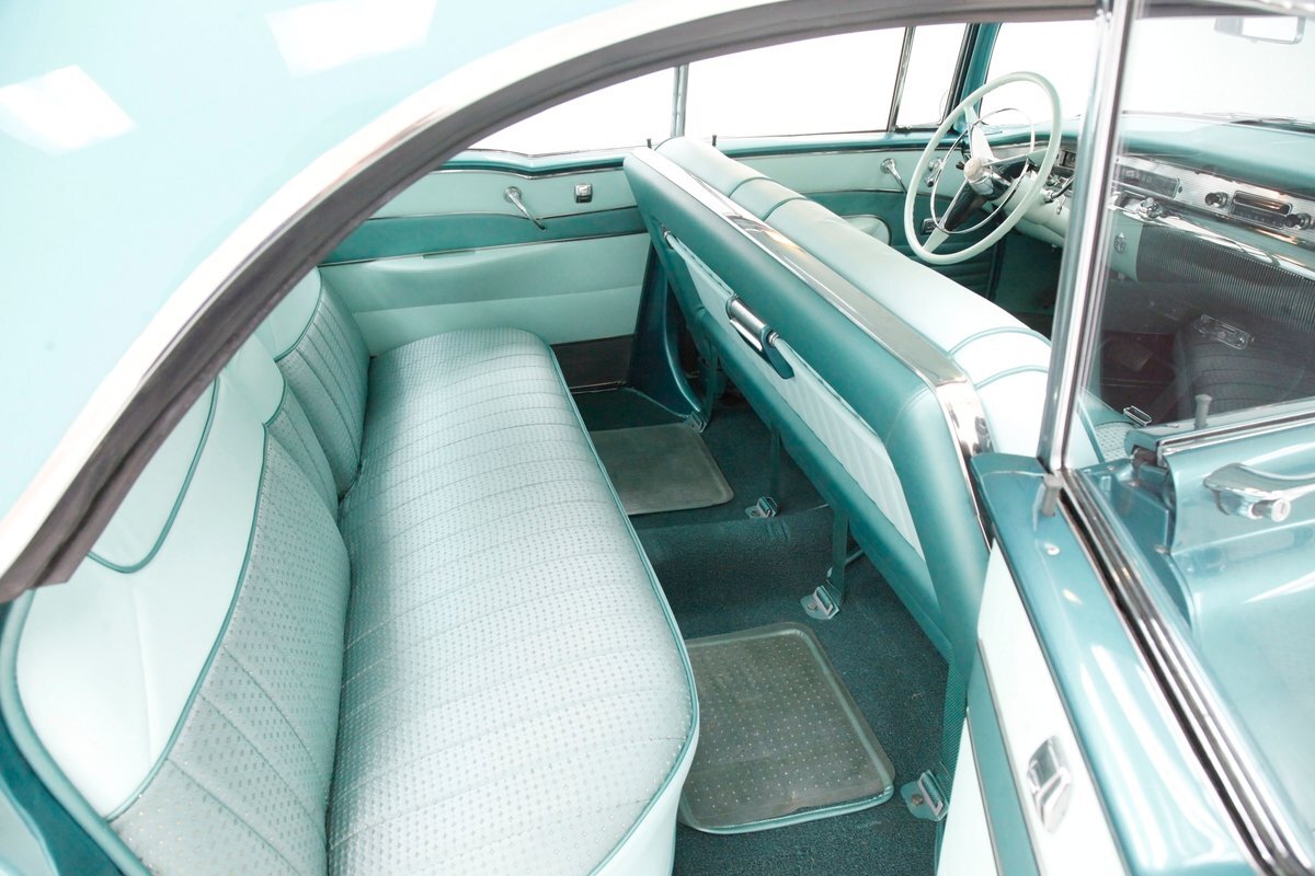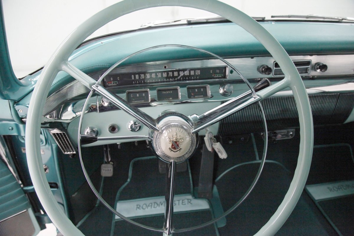 The front of the car is worth the price of admission! Big chromed dagmars frame the edges of what is a two tier bumper, the upper on either side flows over the horizontally ribbed chrome grille and wrapping around the front quarters, and the second being the lower bumper which is nice and wide and very shiny also wrapping aprons in the front quarter. An upper thick chromed arch frames the top of the grille and the lower edge of the hood. A single visor bezel chromed headlight with a smaller signal light outboard and underneath resides on the edge of each quarter in front. B U I C K badging for the front of the massive hood and a Jet Age plane hood ornament dresses things up and we have just visited the front of this car!! Front quarters with their gunsight toppers, a large hood, as well as the lowers down from the passenger compartment beltline and trunk are bathed in miles deep Spruce Green Metallic. The roof finishes off with Foam Green paint providing the perfect contrast. The swoop spear which starts at the headlights and runs past the front door, where it takes a shape, drops then rises to match the rear wheel well and heads straight back to the mid rear quarter, with Spruce Green all around. The iconic 4 portholes in Buick style are on the mid section of the front quarters and would be the Buick signature for many years to come. A chrome encircled wrap-around front window and rear wrap-around glass frame the edges of the Foam Green roof and more chrome highlights the pillarless side glass. On the back, large chromed chevrons house the tail lights and backup lights which melt into the massive rear bumper and just above are the trunk badges which are not fooling around with chrome either! Wide whites and some black accented wheels have polished BUICK badged wheel coverings.