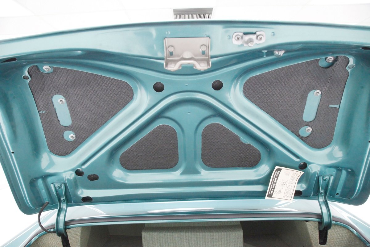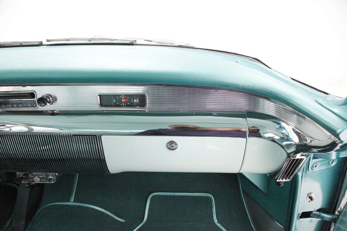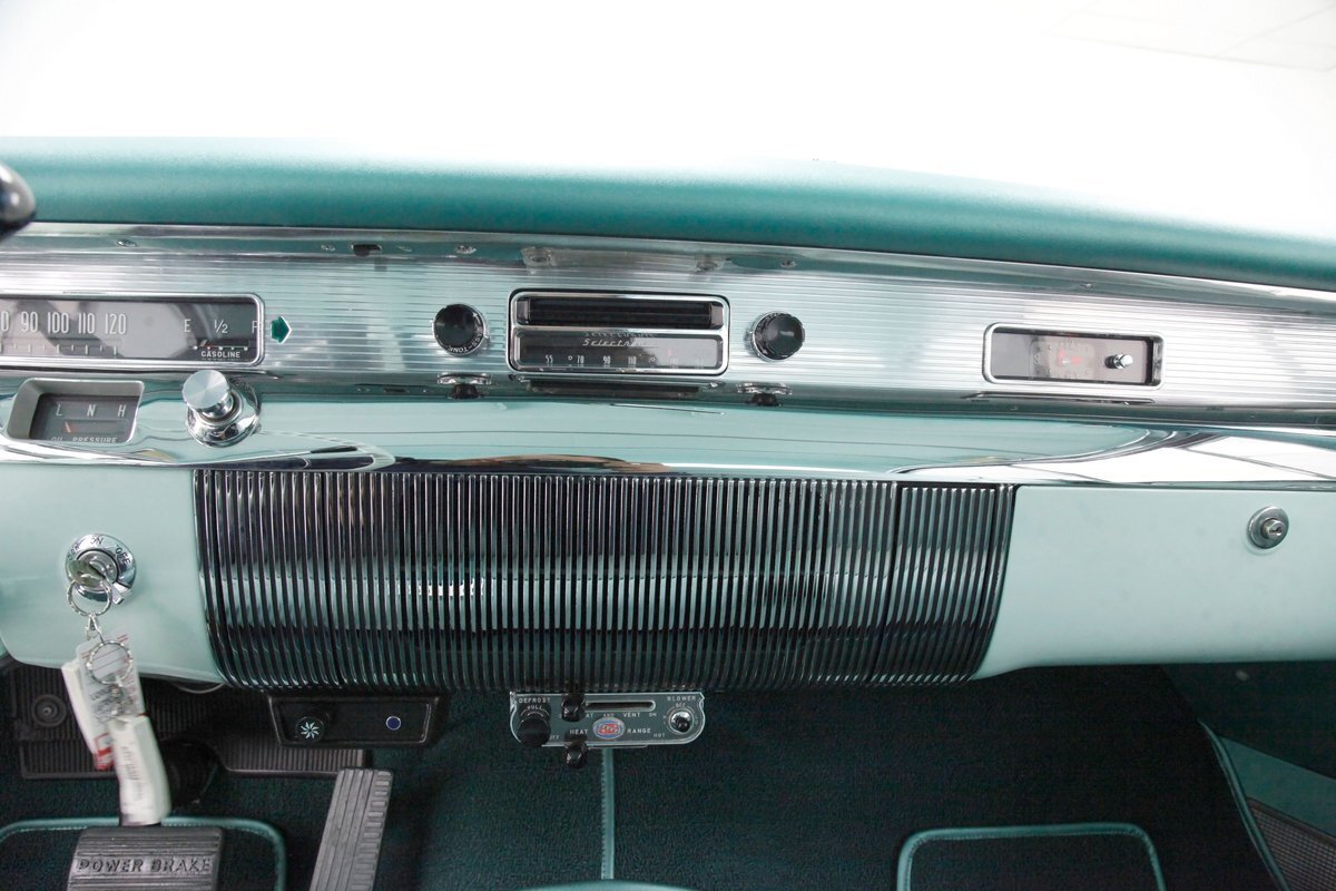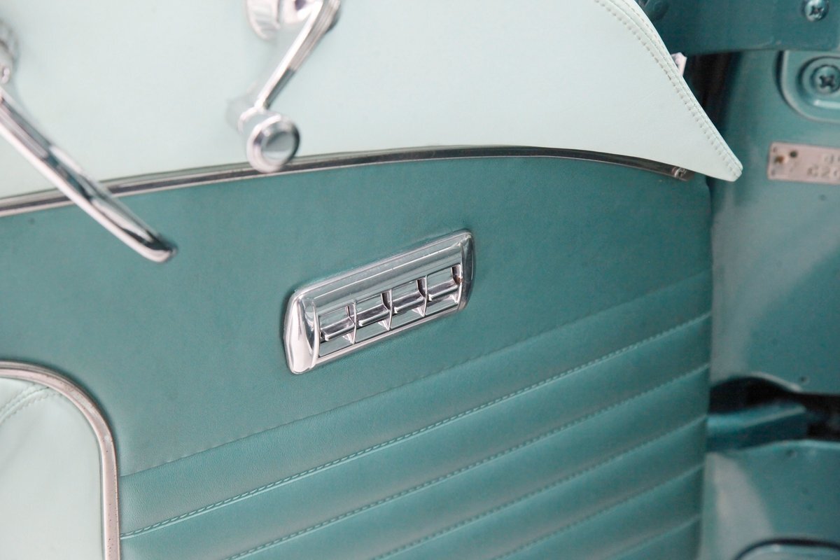 The 2-toning stays strong for this interior, and with a swing of the door where we see medium green and foam green interplaying to form the door panels. Some chromed power window rocker switches and cranks are on and the entire design is showing a forward motion spear. Inside the styling takes those colors and applies them to a front split bench and a full rear bench. These benches have smooth light green cordaveen uppers and bolsters and star pattern green cloth lowers, all delineated by dark green piping. The seats are in beautiful condition with the front seat being power actuated, and float on clean dark green carpeted floors. A large 3 spoke steering wheel fronts a futuristic dash which uses rolls of round steel to make its statement. A rectangular instrument cluster with square and rectangular gauges are in front and center for the driver, and an aluminum bezel with a polished chrome horizontal band lower is stretching across the dash between the rolled padded dark green dash top and the rolled Foam Green steel bottom of the dash. Some temp sliders curve around this lower dash as well as the radio speakers in big ribbed chromed roll with the lower dash. The factory Wonderbar AM radio resides tastefully and unobtrusively within the center of the dash and down below are the factory chrome trimmed heater slides as well as an add on controller for the aftermarket AC system. A light green headliner vies for attention with all this roll and chromed design and has chromed ribbing in the seams and edges.
