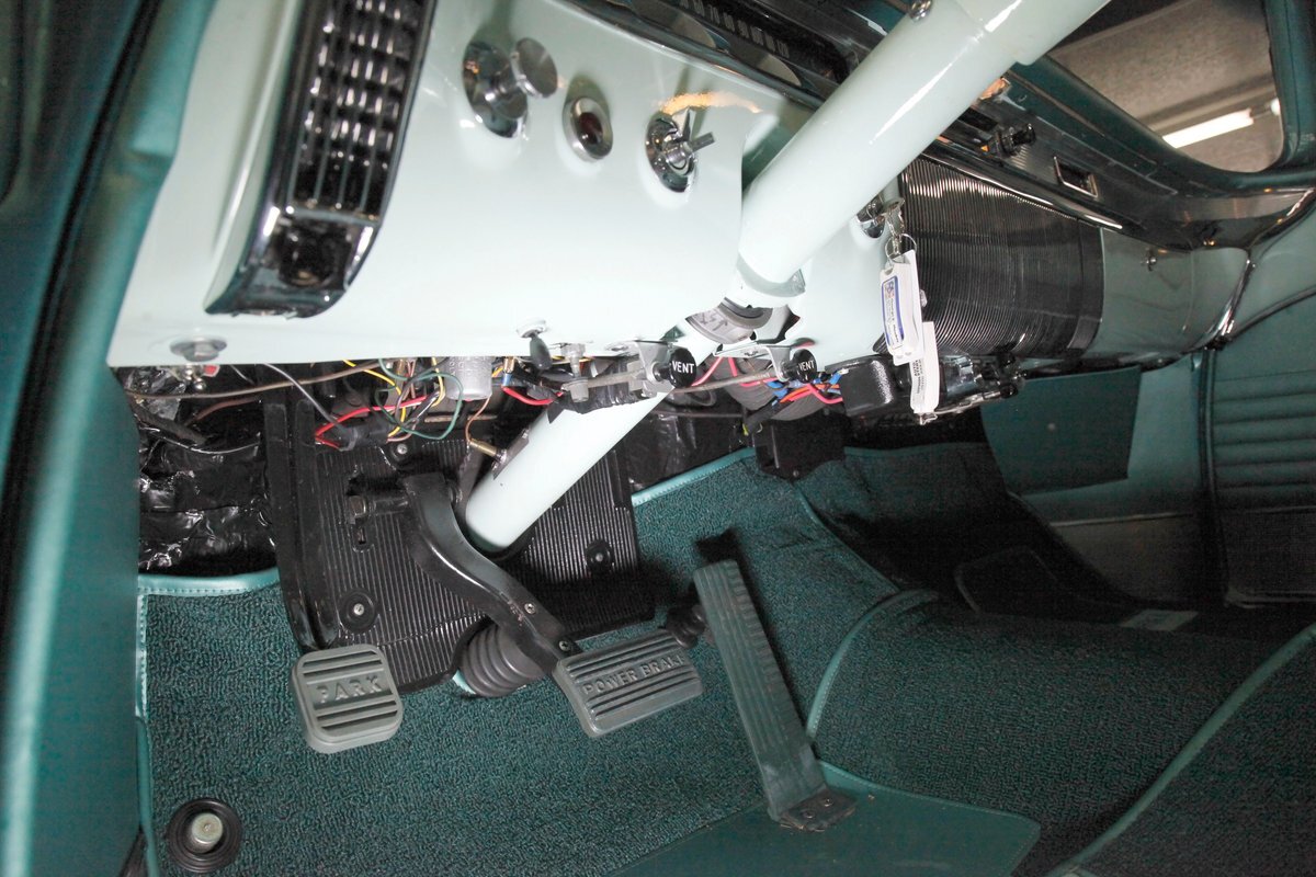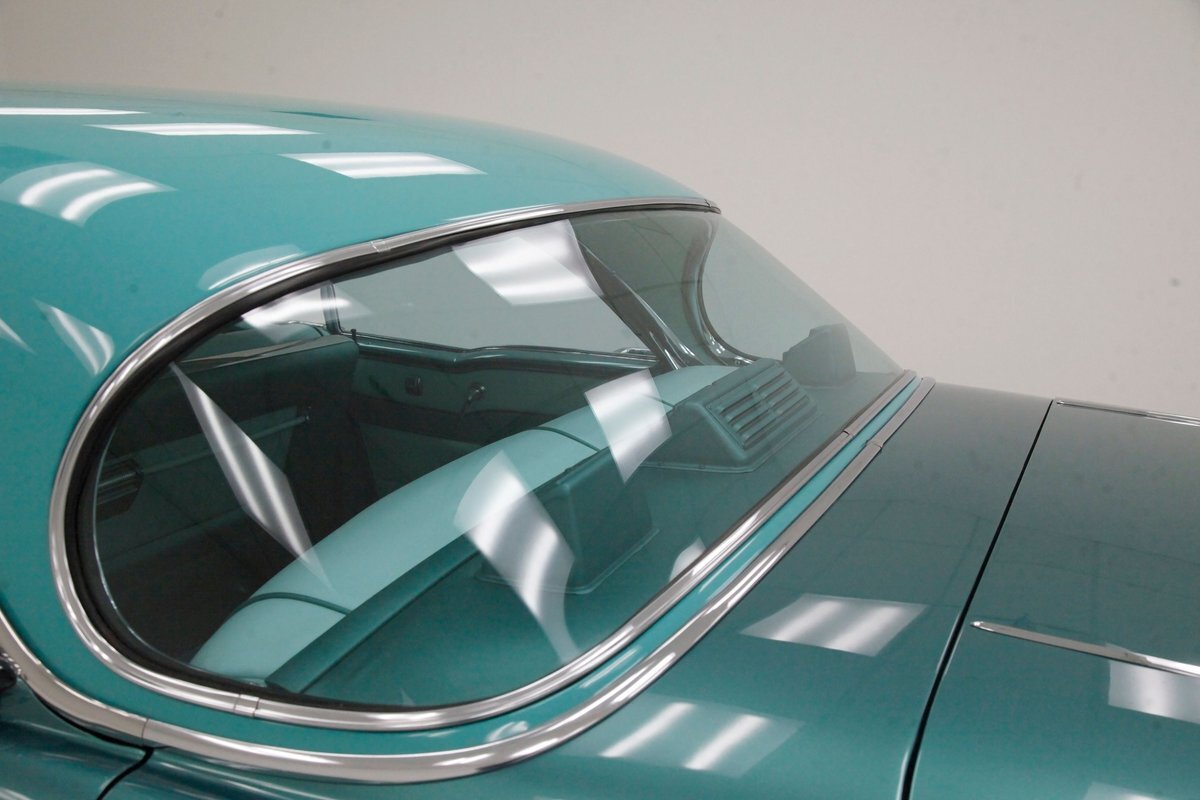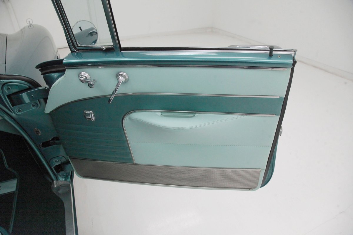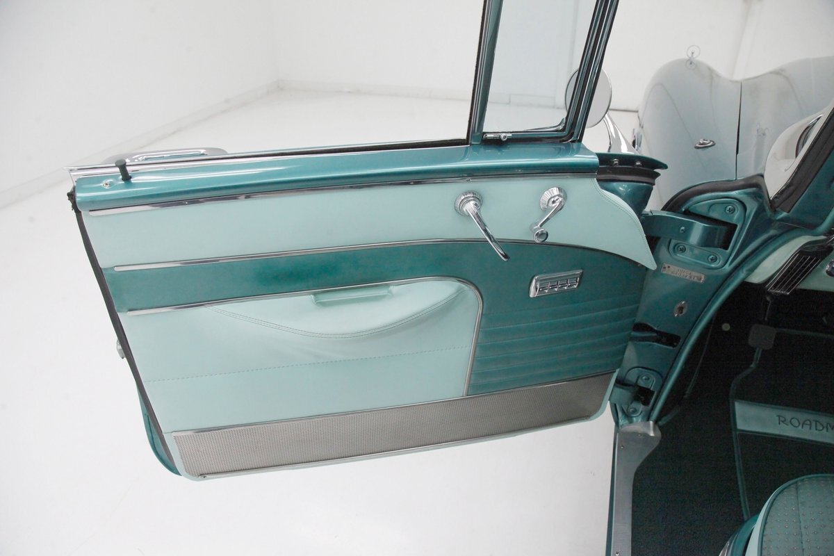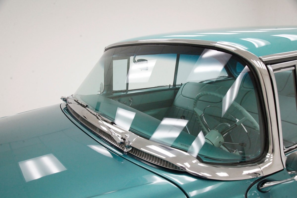 The 2-toning stays strong for this interior, and with a swing of the door where we see medium green and foam green interplaying to form the door panels. Some chromed power window rocker switches and cranks are on and the entire design is showing a forward motion spear. Inside the styling takes those colors and applies them to a front split bench and a full rear bench. These benches have smooth light green cordaveen uppers and bolsters and star pattern green cloth lowers, all delineated by dark green piping. The seats are in beautiful condition with the front seat being power actuated, and float on clean dark green carpeted floors. A large 3 spoke steering wheel fronts a futuristic dash which uses rolls of round steel to make its statement. A rectangular instrument cluster with square and rectangular gauges are in front and center for the driver, and an aluminum bezel with a polished chrome horizontal band lower is stretching across the dash between the rolled padded dark green dash top and the rolled Foam Green steel bottom of the dash. Some temp sliders curve around this lower dash as well as the radio speakers in big ribbed chromed roll with the lower dash. The factory Wonderbar AM radio resides tastefully and unobtrusively within the center of the dash and down below are the factory chrome trimmed heater slides as well as an add on controller for the aftermarket AC system. A light green headliner vies for attention with all this roll and chromed design and has chromed ribbing in the seams and edges.