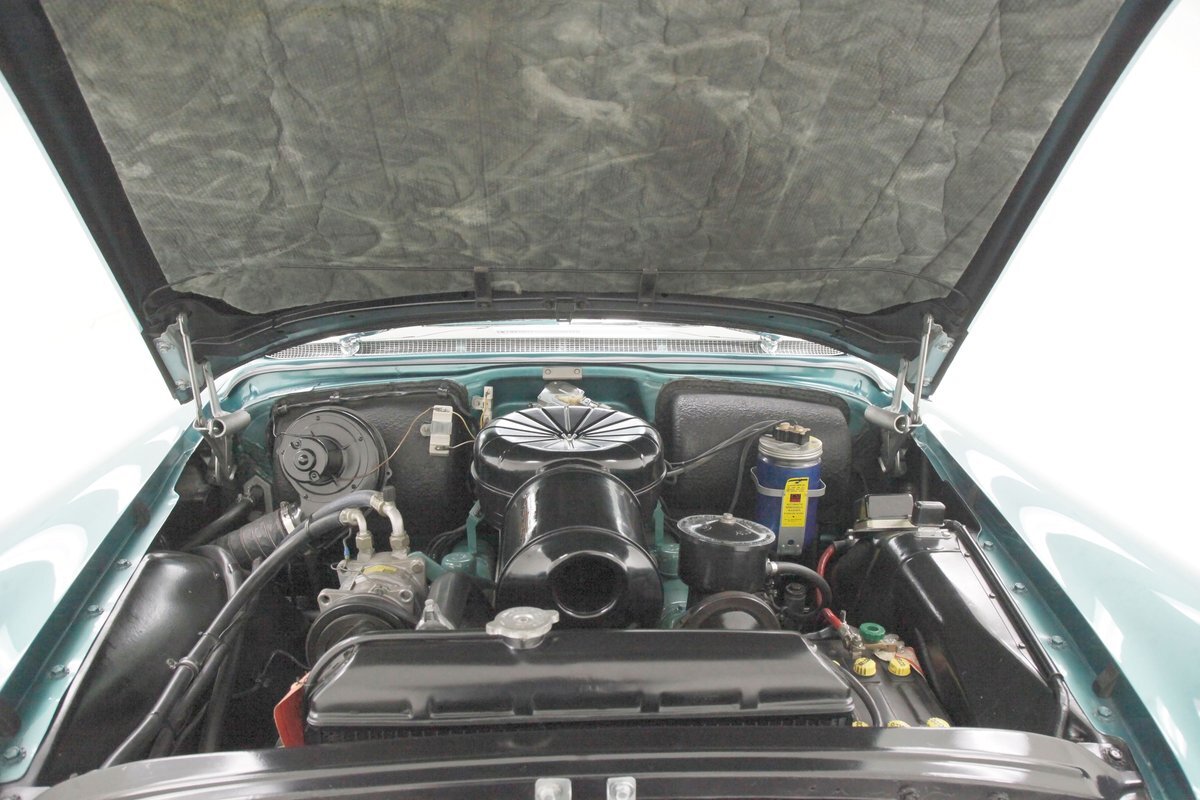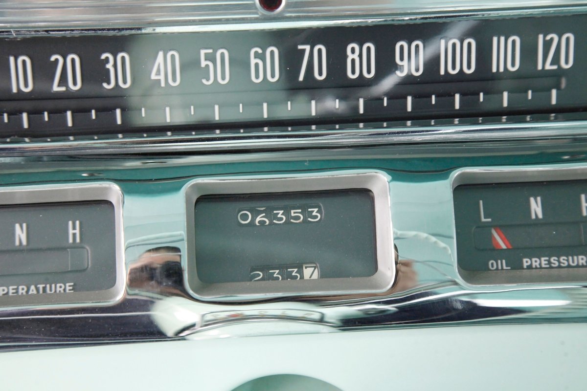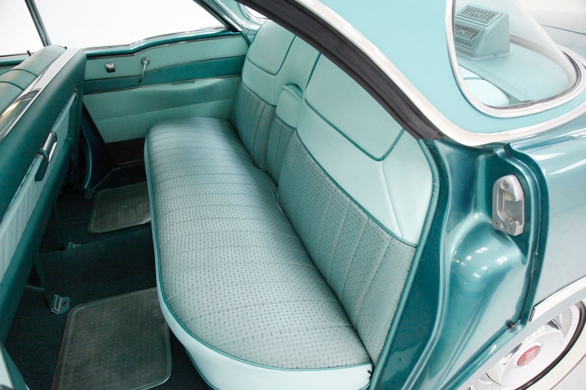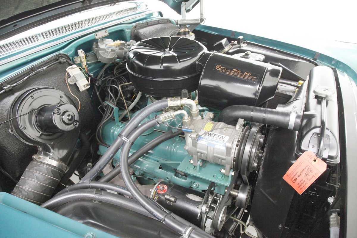 Under the hood is a fully restored power plant within a fully restored engine bay. It comes to us as a Fireball 322ci V8 with a green block and green valve coverings, has massive add-ons all over in the form of a carburetor which is a 4-barrel version and huge air intake drum with an air cleaner behind it and on top of the carb. Nice new wiring and hoses abound and in back is a Dynaflow 2-speed automatic transmission. A 3.36 conventional rear axle is on the back.