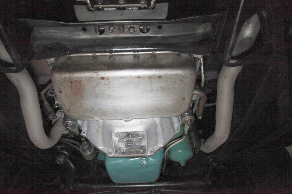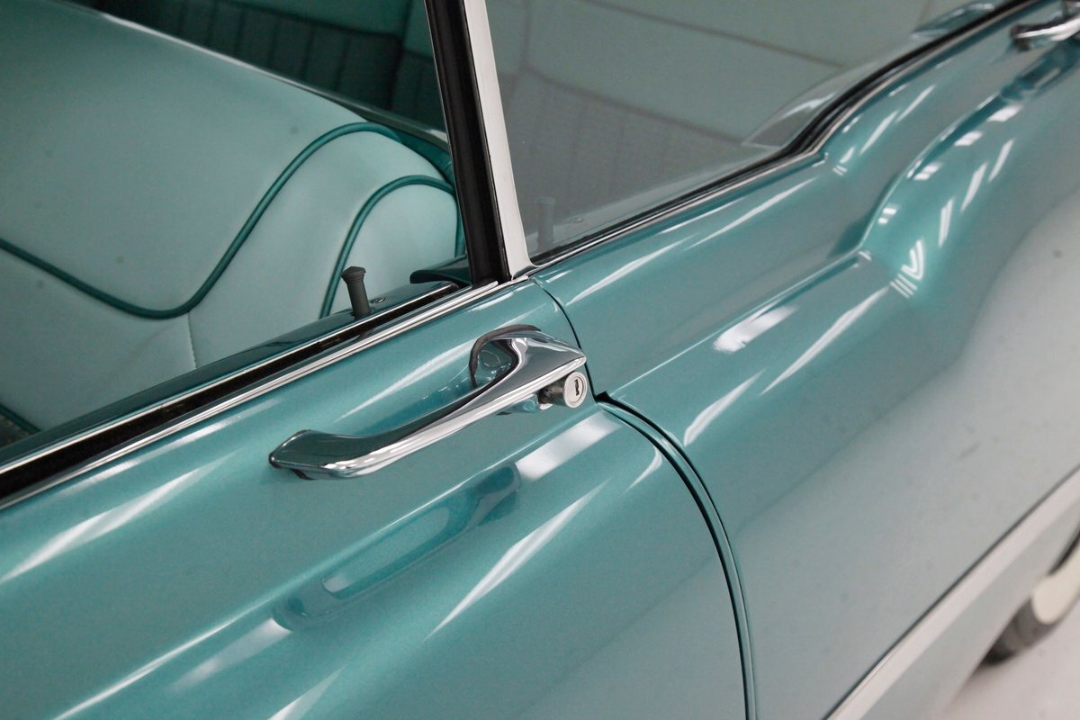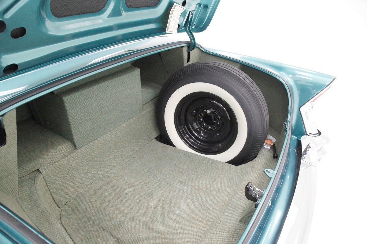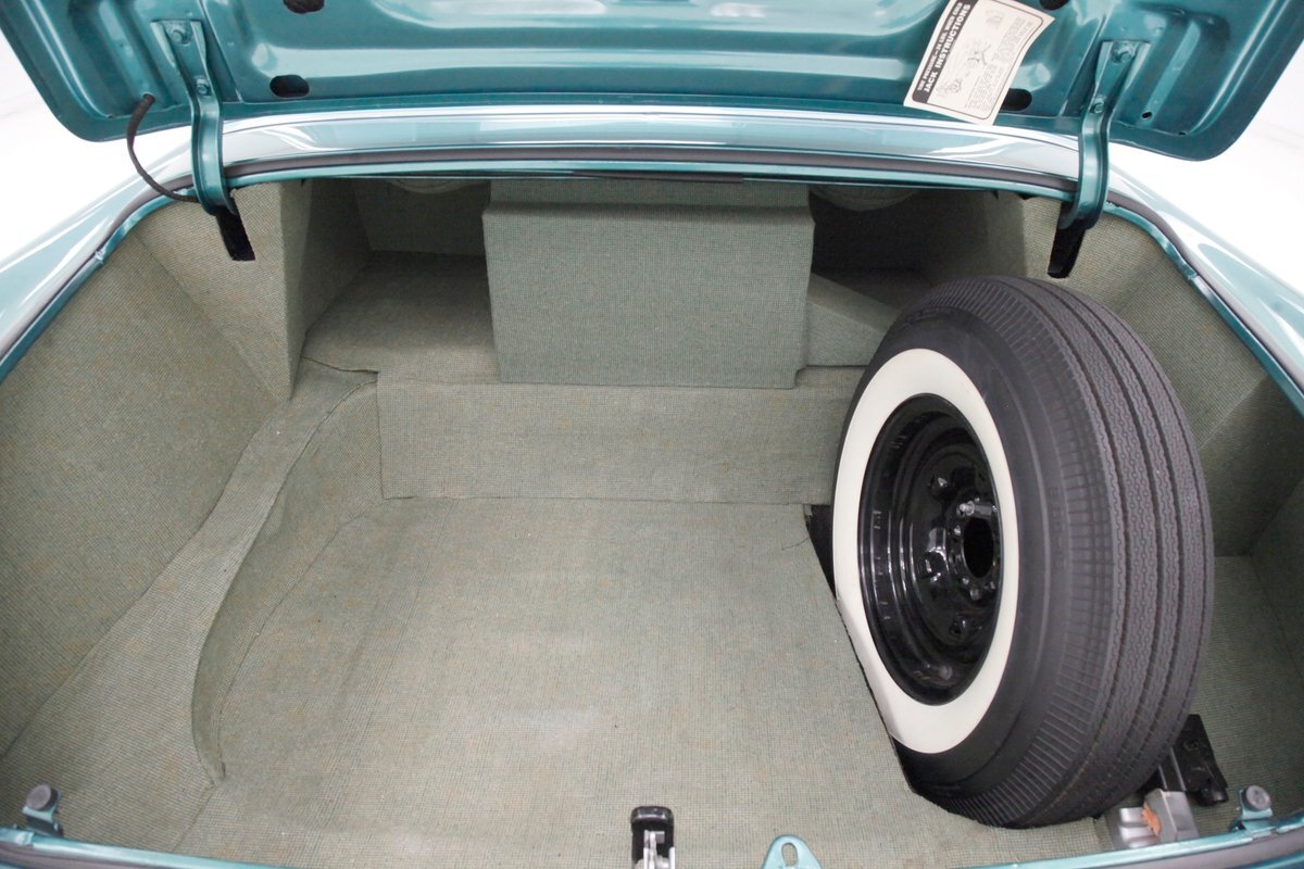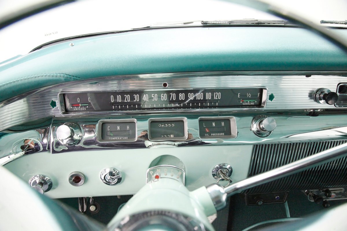 Under the hood is a fully restored power plant within a fully restored engine bay. It comes to us as a Fireball 322ci V8 with a green block and green valve coverings, has massive add-ons all over in the form of a carburetor which is a 4-barrel version and huge air intake drum with an air cleaner behind it and on top of the carb. Nice new wiring and hoses abound and in back is a Dynaflow 2-speed automatic transmission. A 3.36 conventional rear axle is on the back.
