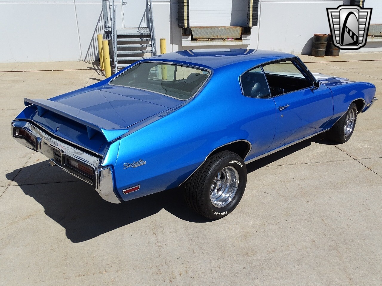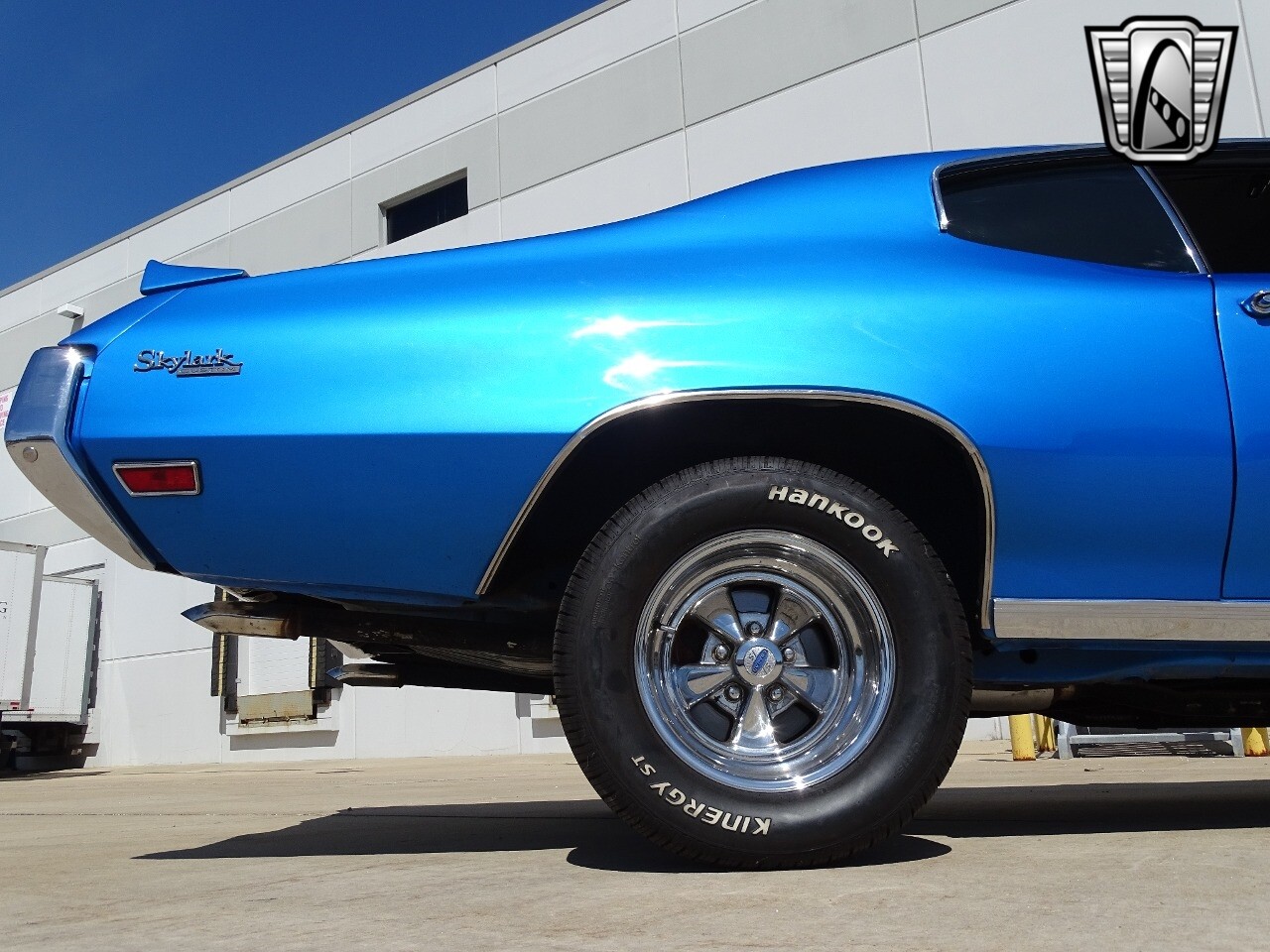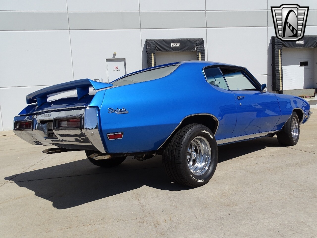 Gateway Classic Cars Milwaukee is excited to present this 1972 Buick Skylark. The car features a striking blue exterior accented with white racing stripes on the hood. Added exterior features include Cragar five-spoke chrome wheels paired with a set of raised white letter tires and a rear spoiler that's sure to turn heads wherever you go.