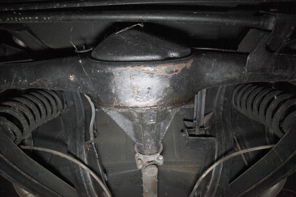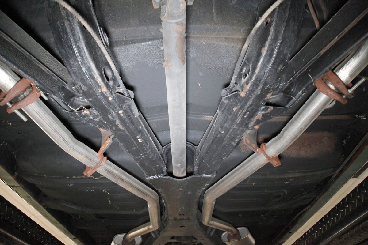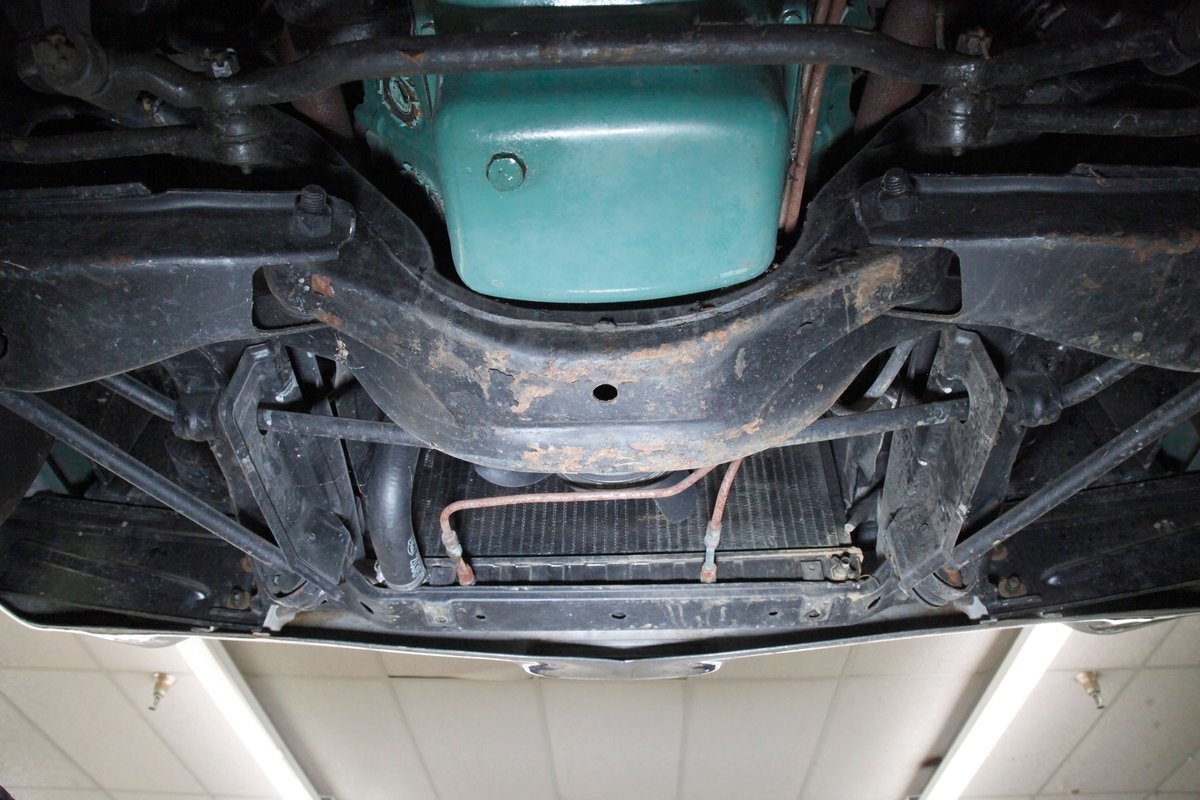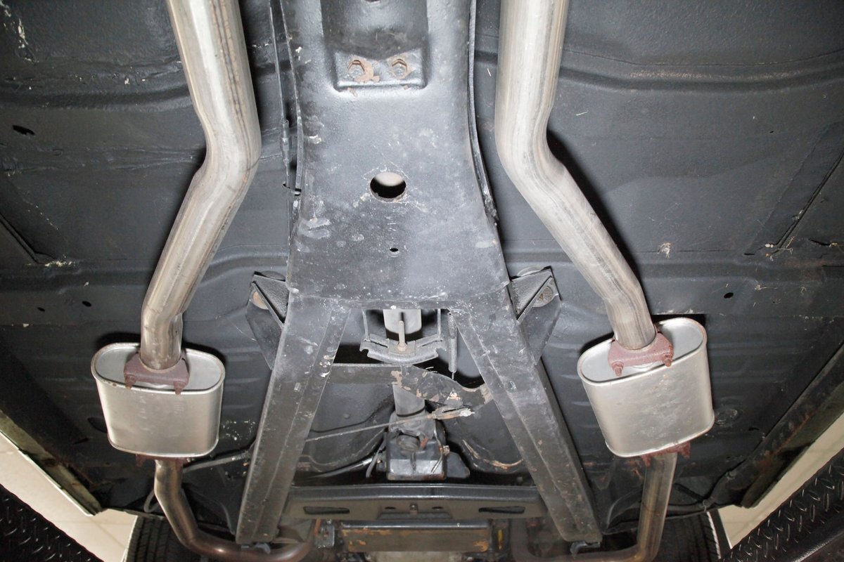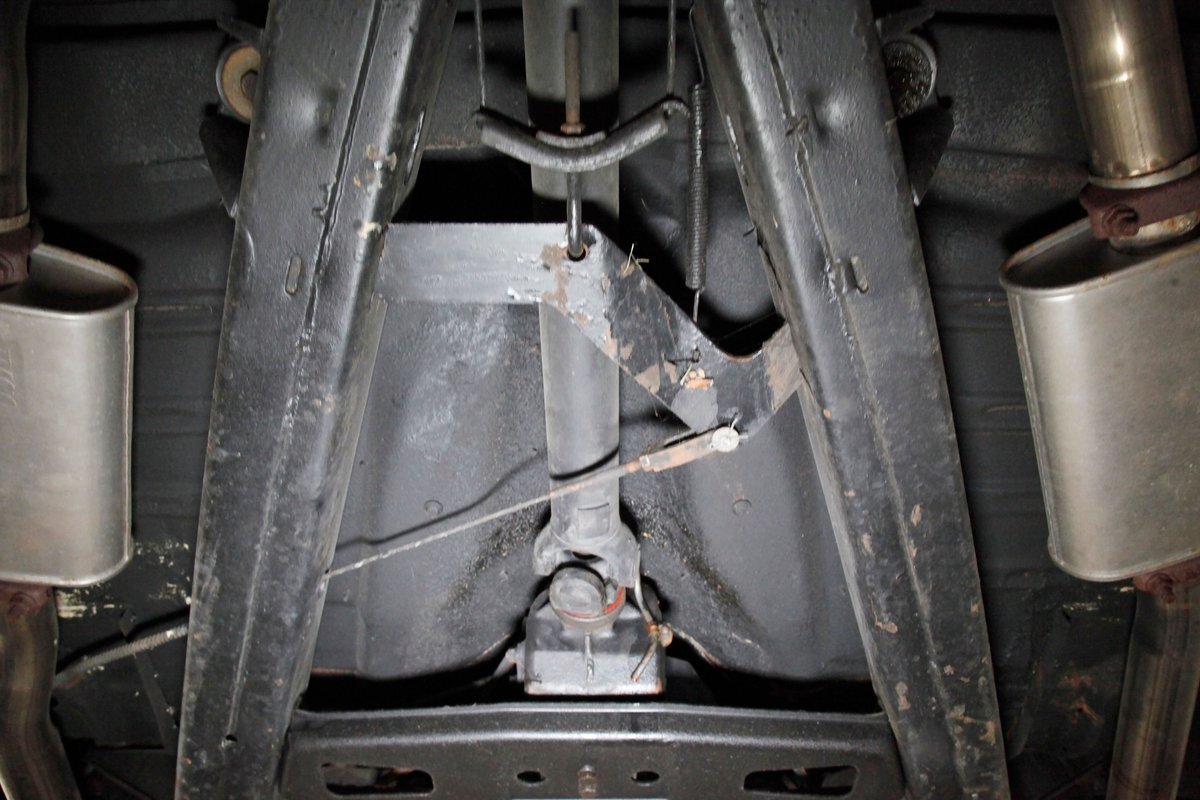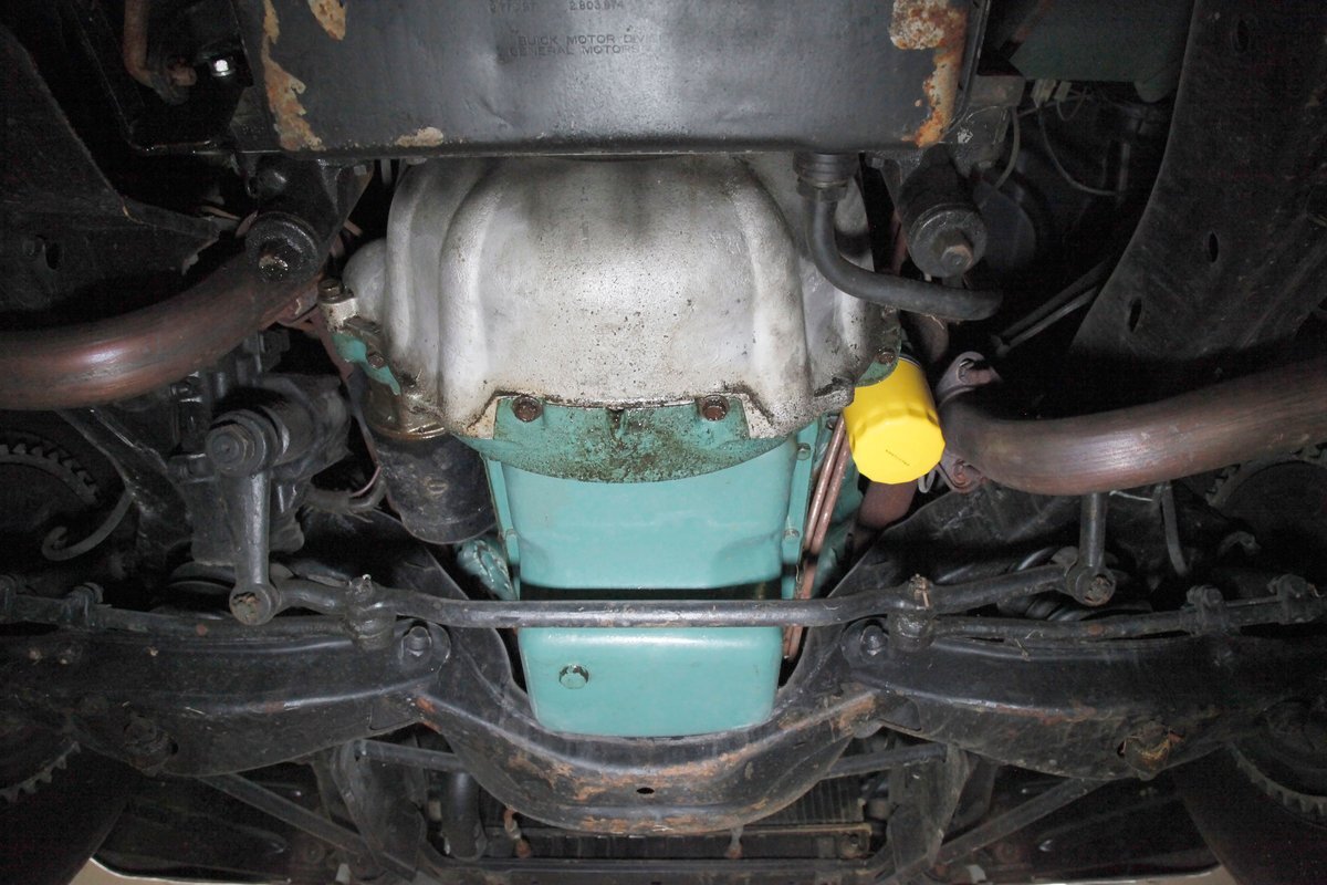 Clean with an ample application of rustproofing texture coating is seen throughout and even surface rust hasn't dared to rear its head save for the untreated components. All strong and black for the frame, flooring, rockers and suspension with only a light dusting of surface rust where the paint was thinly applied. Independent coil spring suspension up front and a 3 link with coil springs in the rear provides the ride, and the power drum braking brings you back to earth safely. Also, a stock style dual exhaust system is seen snaking its way rearward from the Nailhead under the hood.