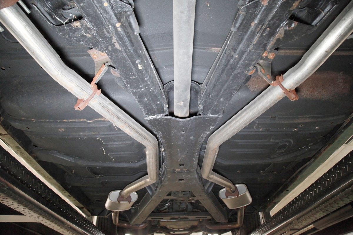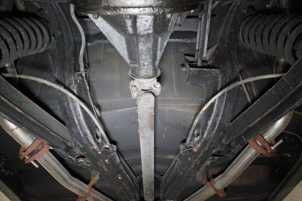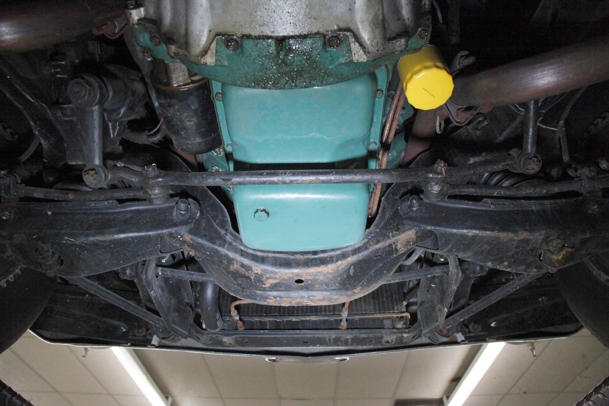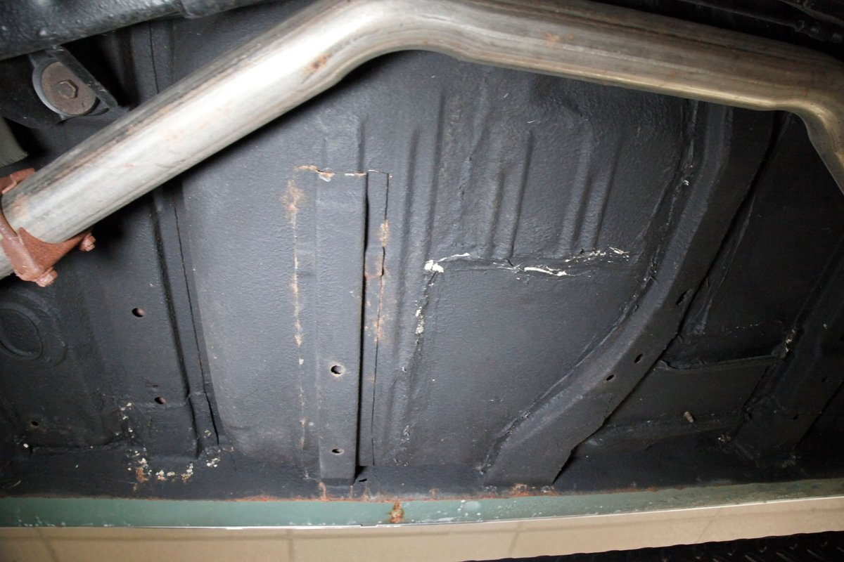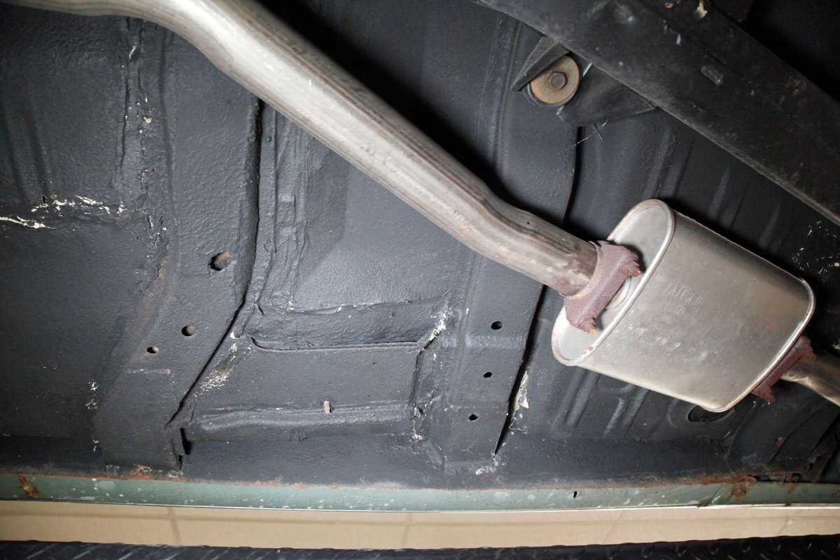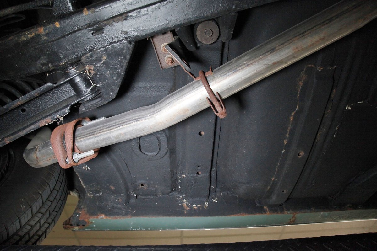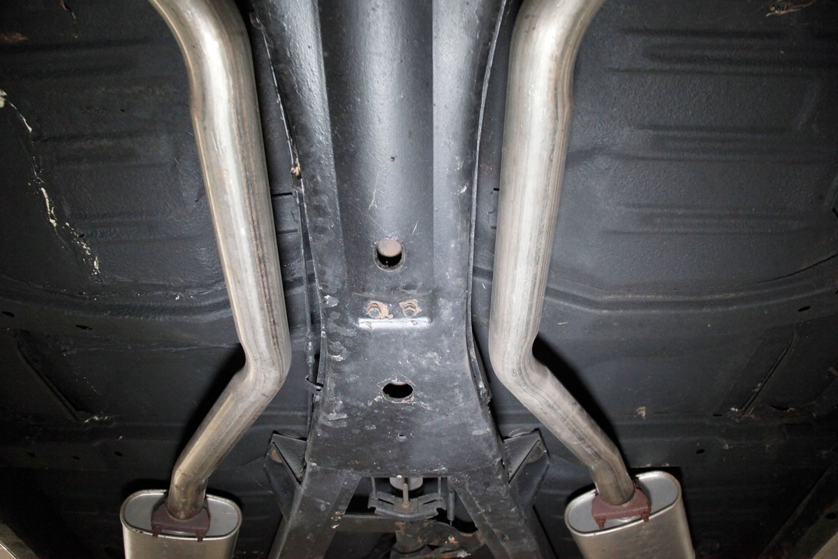 Clean with an ample application of rustproofing texture coating is seen throughout and even surface rust hasn't dared to rear its head save for the untreated components. All strong and black for the frame, flooring, rockers and suspension with only a light dusting of surface rust where the paint was thinly applied. Independent coil spring suspension up front and a 3 link with coil springs in the rear provides the ride, and the power drum braking brings you back to earth safely. Also, a stock style dual exhaust system is seen snaking its way rearward from the Nailhead under the hood.