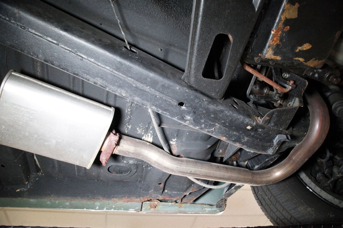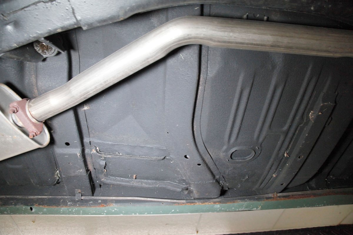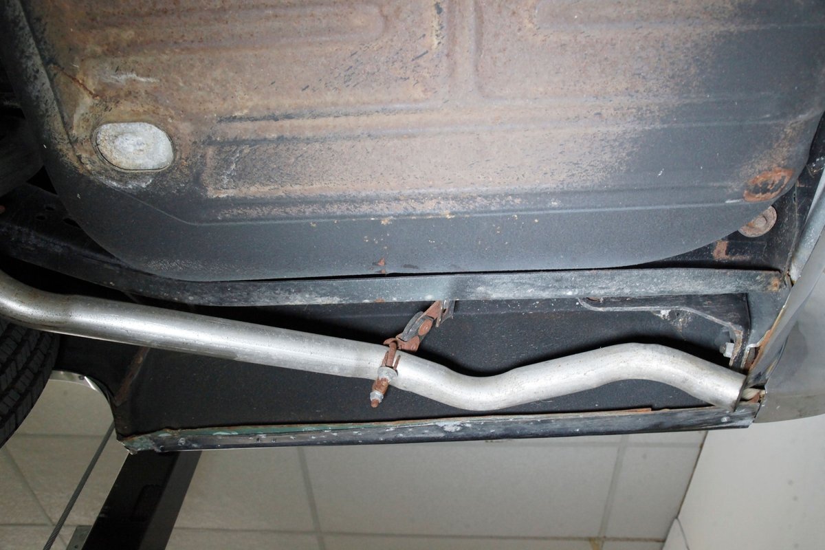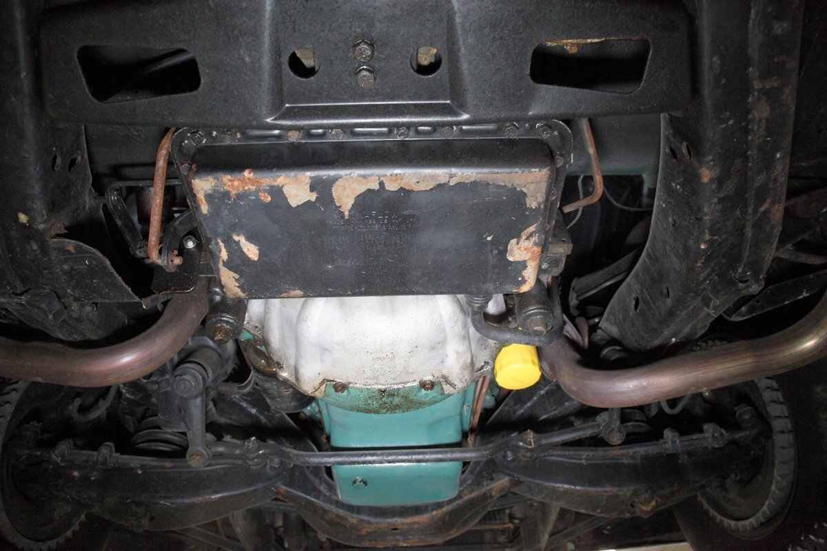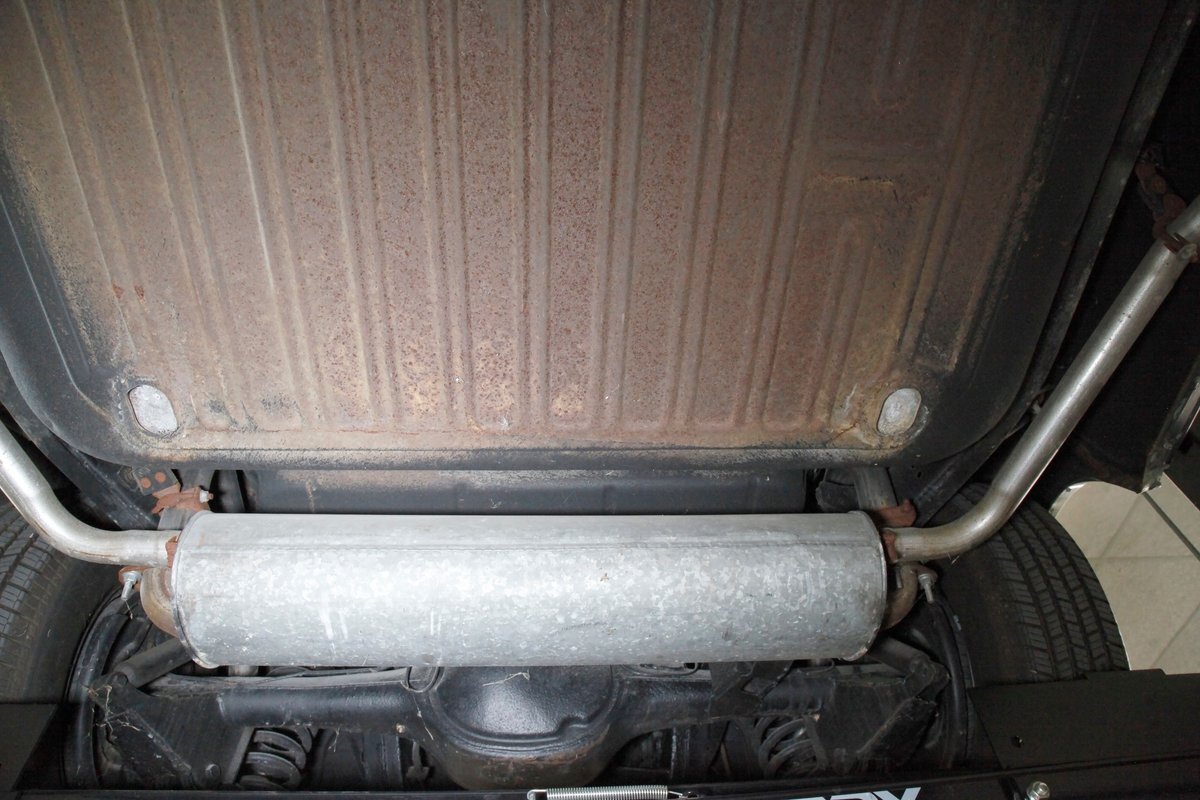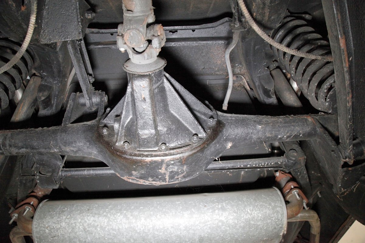 Clean with an ample application of rustproofing texture coating is seen throughout and even surface rust hasn't dared to rear its head save for the untreated components. All strong and black for the frame, flooring, rockers and suspension with only a light dusting of surface rust where the paint was thinly applied. Independent coil spring suspension up front and a 3 link with coil springs in the rear provides the ride, and the power drum braking brings you back to earth safely. Also, a stock style dual exhaust system is seen snaking its way rearward from the Nailhead under the hood.