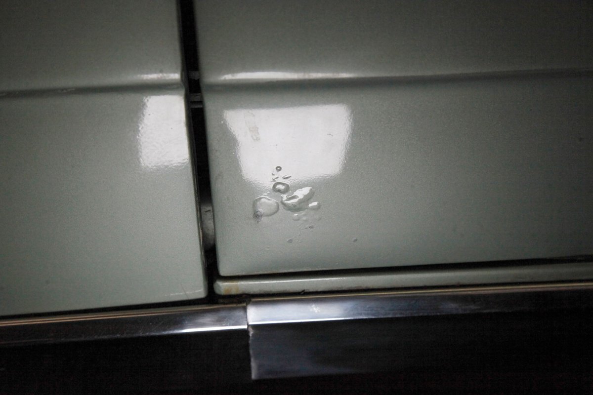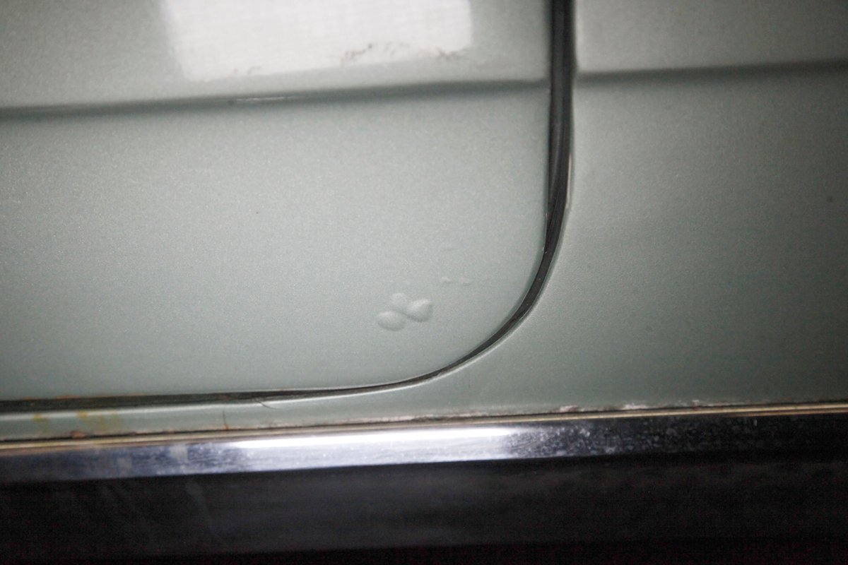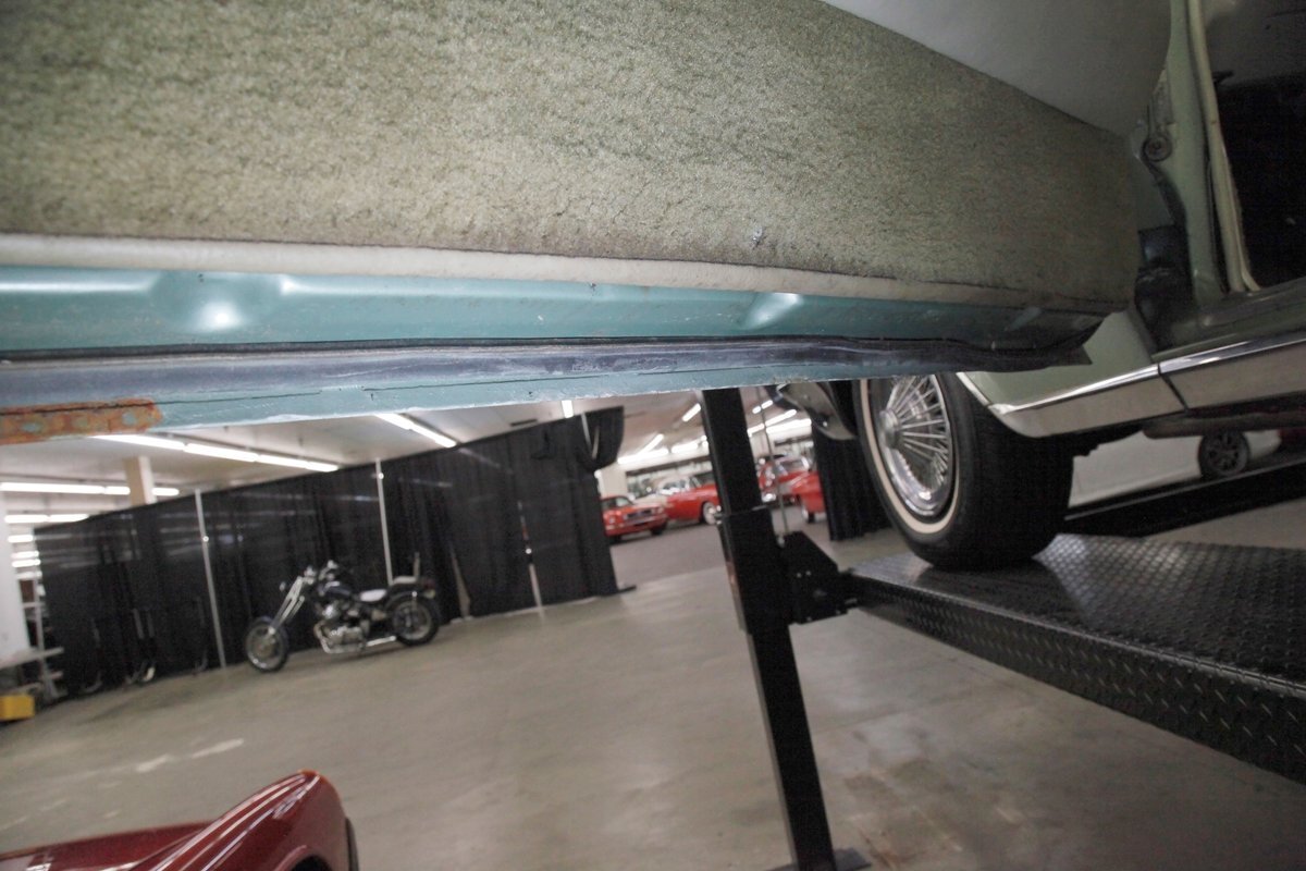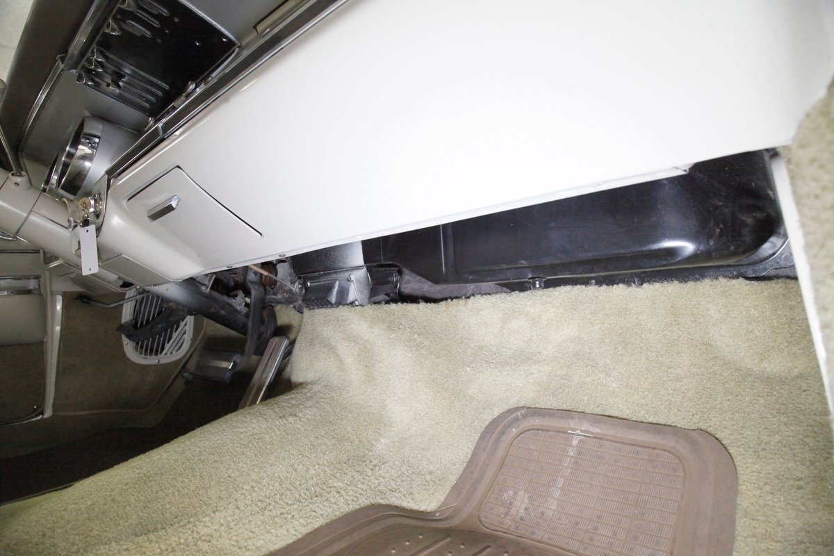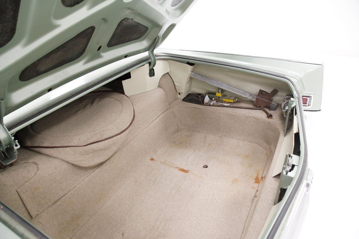 Near perfect faux leather pattern Sandalwood vinyl is interplaying with chrome trimming, smooth vinyl and vertically stitched vinyl wrapping around the door panels. A padded Sandalwood armrest runs the full gamut of the center on the doors holding the toggles for the power windows and mirror joystick, and green carpeting covers the lowers. Inside we are met with a sprawling split bench front seat in more clean Sandalwood vinyl. Smooth bolsters with white piping separate them from the wide section tuck and roll inserts. A rear bench is in back in the same pattern with a central chrome dressed speaker and looks nearly unused. In front of the driver and the original steering wheel is a symmetrical dash with a central Buick tri-shield badge, and dark greenish brown for the padded dash top and Sandalwood for the metal painted dash front. A few brushed and ribbed aluminum panels are also here housing the pulls and knobs. The original AM/FM radio resides here as well as the heat/defrost slides just above that appear to have been also used in fighter jets of the era. Like new dark green carpeting floods the floors and compliments the Sandalwood vinyl splendidly.