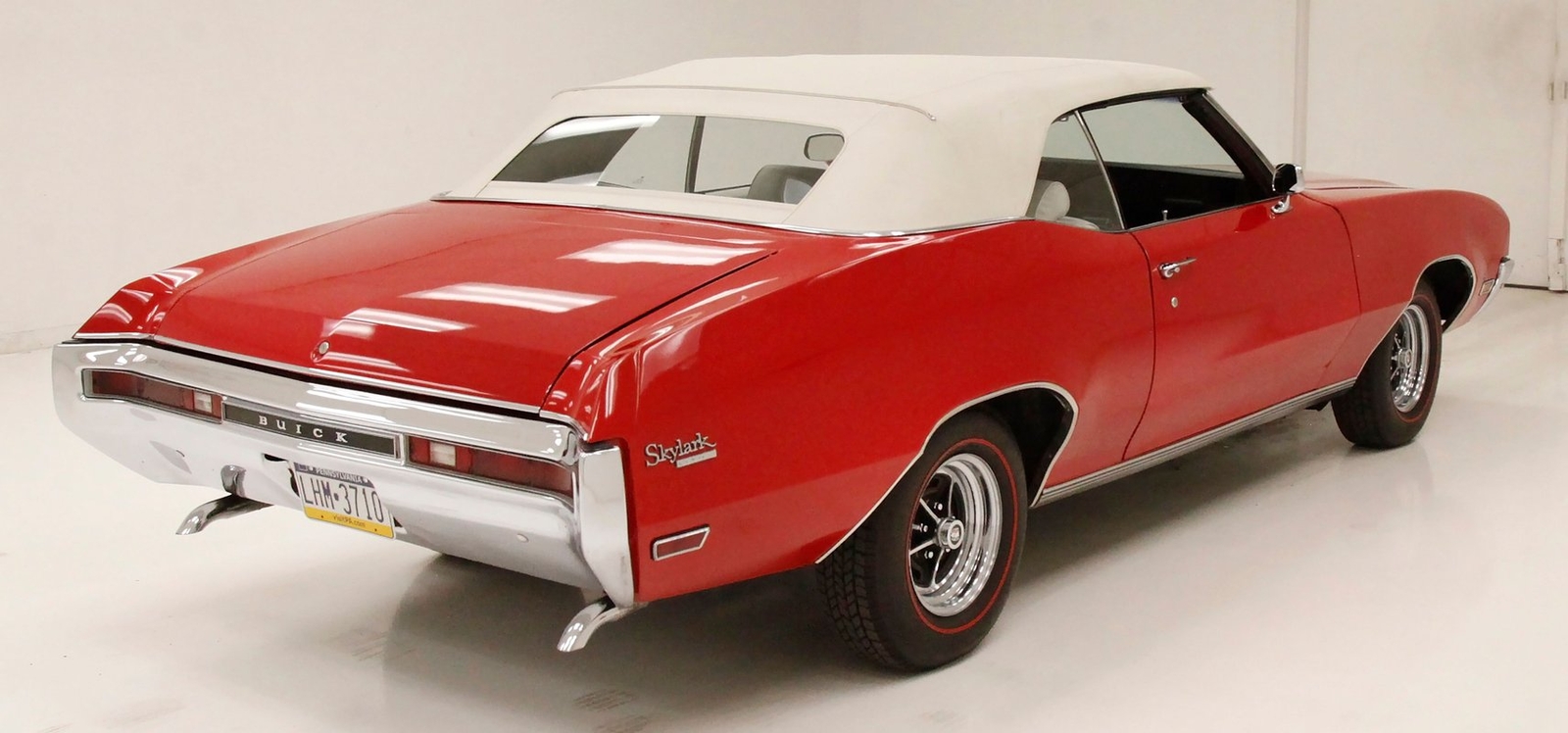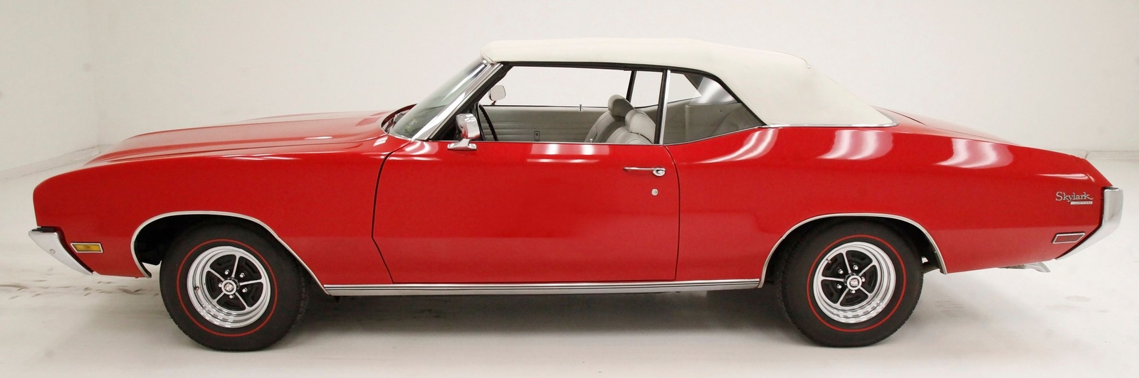 For consignment, an early 70's hunk of Detroit iron in the form of a 1970 Buick Skylark Custom convertible. Taking a cue from the Olds 442's, Chevelles and Buick GS of this time, this car has a very similar body styling. Our version of the Skylark was the beneficiary of a full restoration in 2013, has 47,191 title verified actual miles, and sports a new interior, a new top, new roof seals and new top hydraulics. It's a 350/350 version, bathed in brilliant red and presents very nicely with no rust, a miles deep finish and blinding mirror-like chrome.