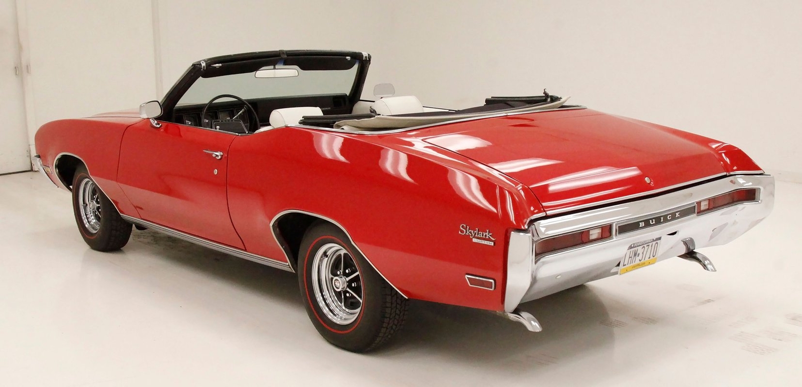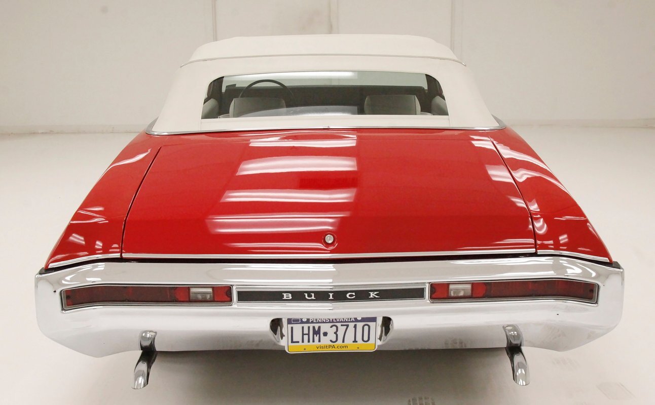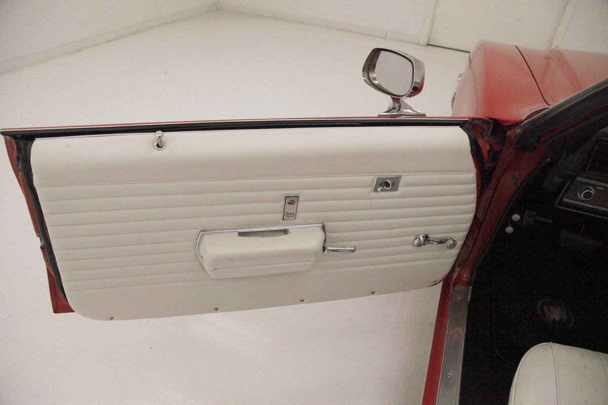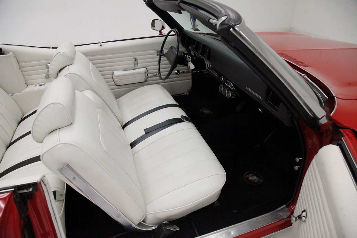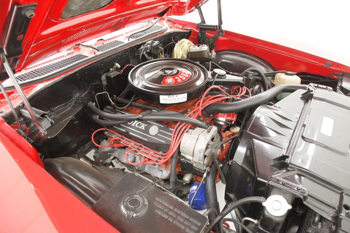 Code 75, Fire Red or otherwise called Cranberry Red, is bathing the straight steel on this coke bottle designed car. The paint shows nicely with a deep reflective finish, no rust and only a few very minor stone chips. Dual headlights and an egg crate grille lead us off and a shiny bumper below has inset turn signal lights. Some thin stainless trimming can be seen edging the wheel wells and a bit wider piece for the rockers. The gaps are good throughout the coke bottle sides and a new convertible top, in contrasting and correct white, is looking in very good condition and sports a glass rear window. It moves up and down smoothly and does so electrically. We note mirror polished stainless trimmings around the glass and passenger compartment to accentuate the quality of the restoration nicely. A sporty design with characteristics of the Chevelle SS, GTO and 442 melded together as styling cues are noted from each in different areas of the car. Within the rear bumper are horizontal tail lights and the bumper wraps around the rear quarters. Nice badging and chrome laden 14-inch Buick rally wheels that are wrapped by thin red stripe 215/75R14 radials round out this stunning presentation.
