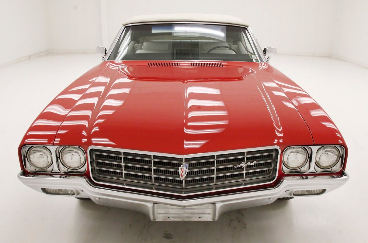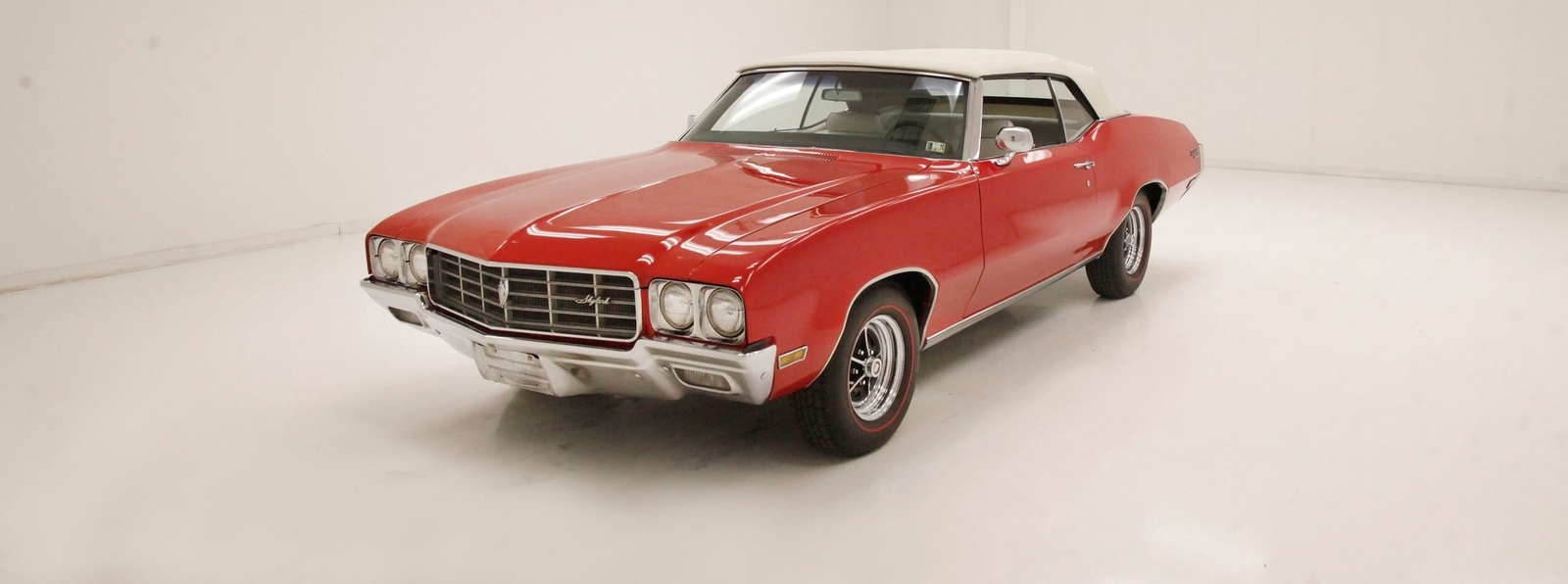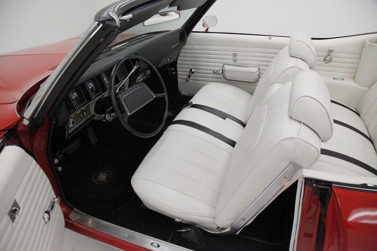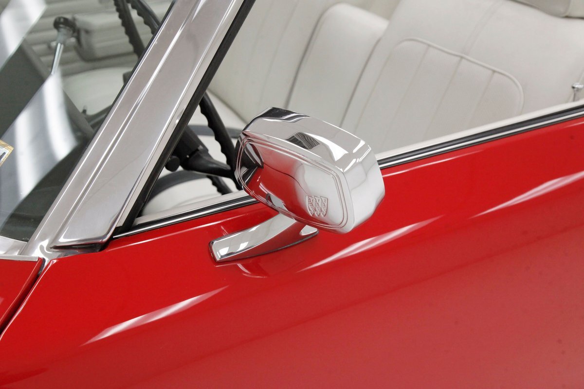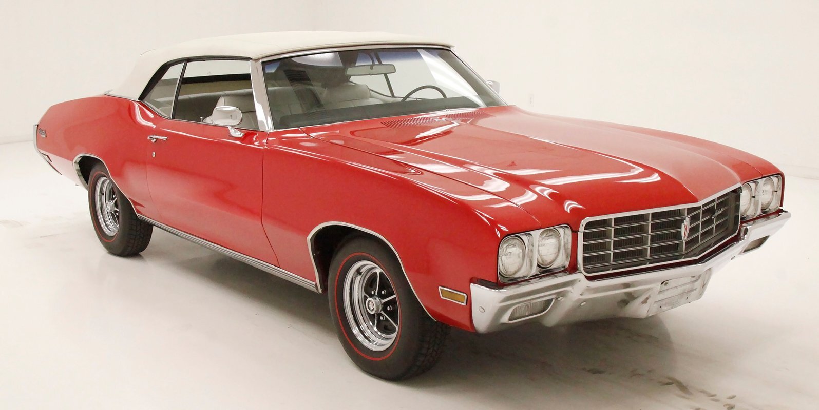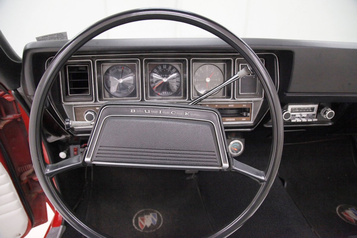 Code 75, Fire Red or otherwise called Cranberry Red, is bathing the straight steel on this coke bottle designed car. The paint shows nicely with a deep reflective finish, no rust and only a few very minor stone chips. Dual headlights and an egg crate grille lead us off and a shiny bumper below has inset turn signal lights. Some thin stainless trimming can be seen edging the wheel wells and a bit wider piece for the rockers. The gaps are good throughout the coke bottle sides and a new convertible top, in contrasting and correct white, is looking in very good condition and sports a glass rear window. It moves up and down smoothly and does so electrically. We note mirror polished stainless trimmings around the glass and passenger compartment to accentuate the quality of the restoration nicely. A sporty design with characteristics of the Chevelle SS, GTO and 442 melded together as styling cues are noted from each in different areas of the car. Within the rear bumper are horizontal tail lights and the bumper wraps around the rear quarters. Nice badging and chrome laden 14-inch Buick rally wheels that are wrapped by thin red stripe 215/75R14 radials round out this stunning presentation.