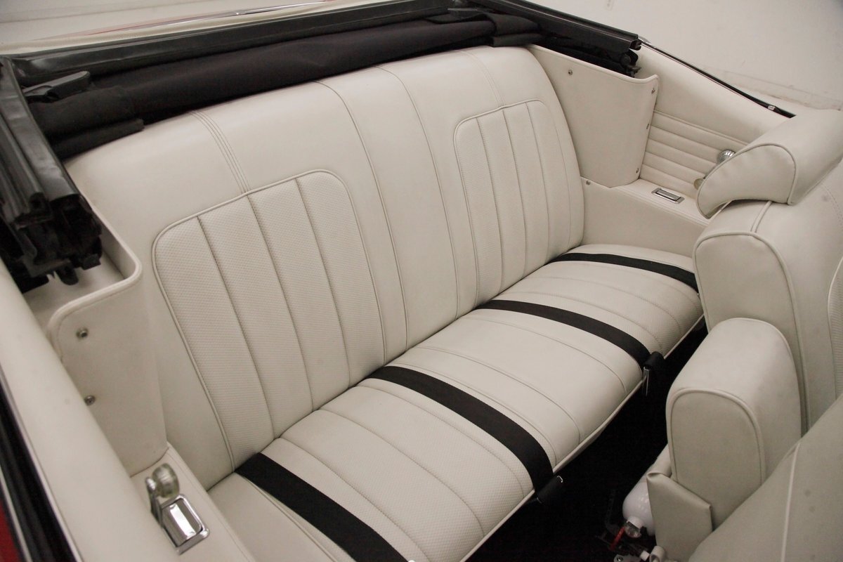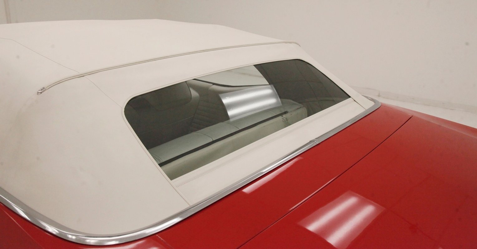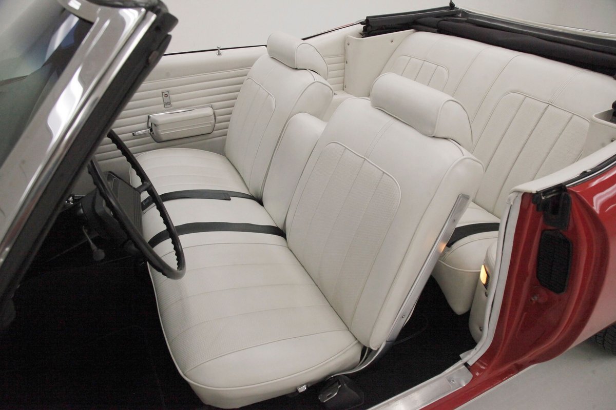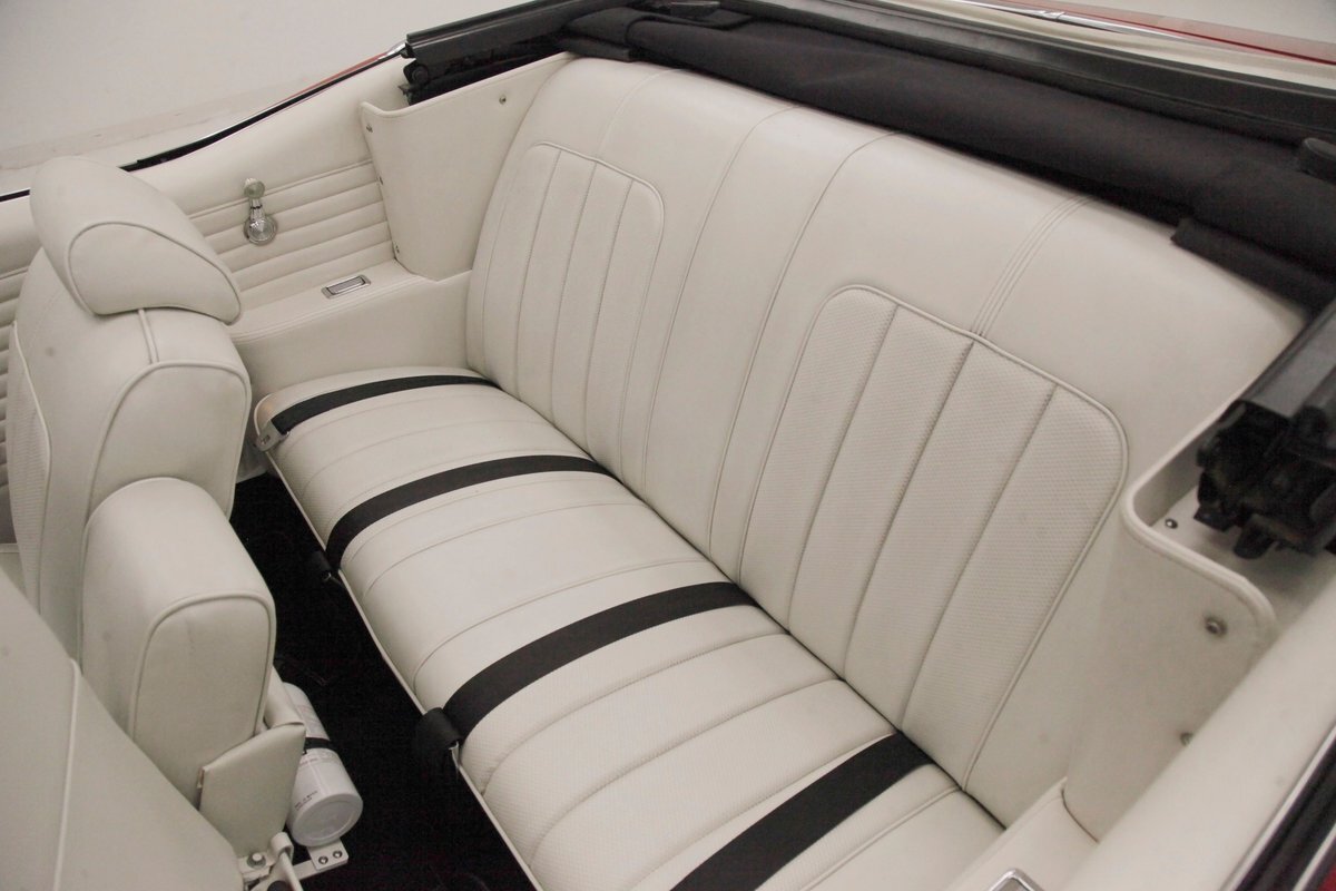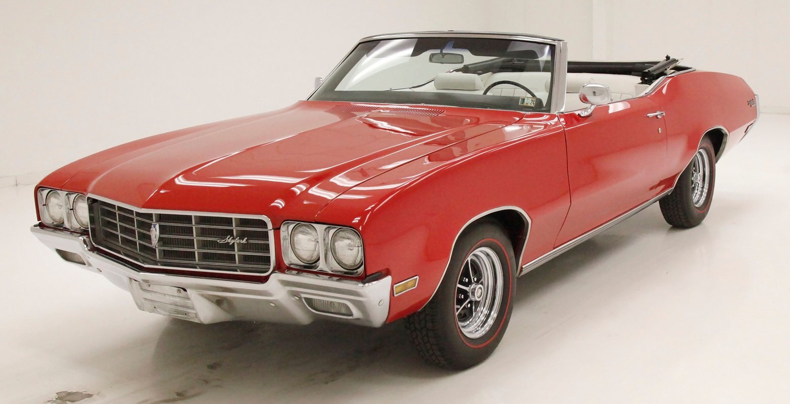 Code 75, Fire Red or otherwise called Cranberry Red, is bathing the straight steel on this coke bottle designed car. The paint shows nicely with a deep reflective finish, no rust and only a few very minor stone chips. Dual headlights and an egg crate grille lead us off and a shiny bumper below has inset turn signal lights. Some thin stainless trimming can be seen edging the wheel wells and a bit wider piece for the rockers. The gaps are good throughout the coke bottle sides and a new convertible top, in contrasting and correct white, is looking in very good condition and sports a glass rear window. It moves up and down smoothly and does so electrically. We note mirror polished stainless trimmings around the glass and passenger compartment to accentuate the quality of the restoration nicely. A sporty design with characteristics of the Chevelle SS, GTO and 442 melded together as styling cues are noted from each in different areas of the car. Within the rear bumper are horizontal tail lights and the bumper wraps around the rear quarters. Nice badging and chrome laden 14-inch Buick rally wheels that are wrapped by thin red stripe 215/75R14 radials round out this stunning presentation.