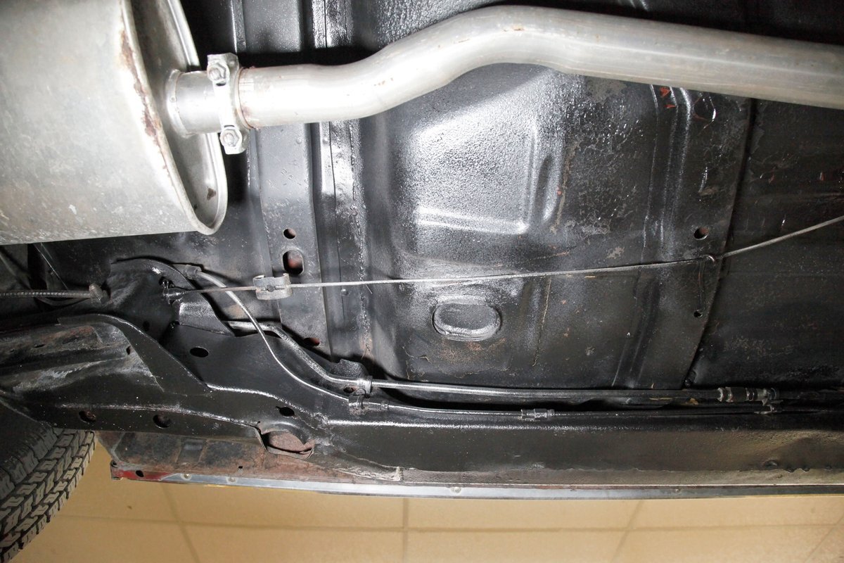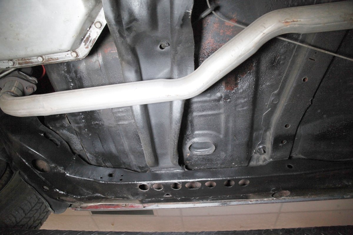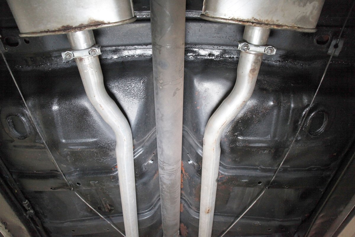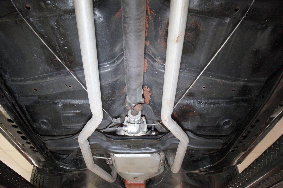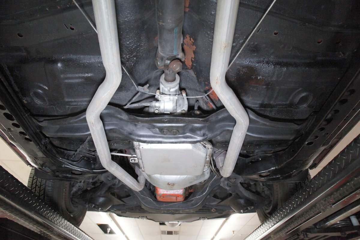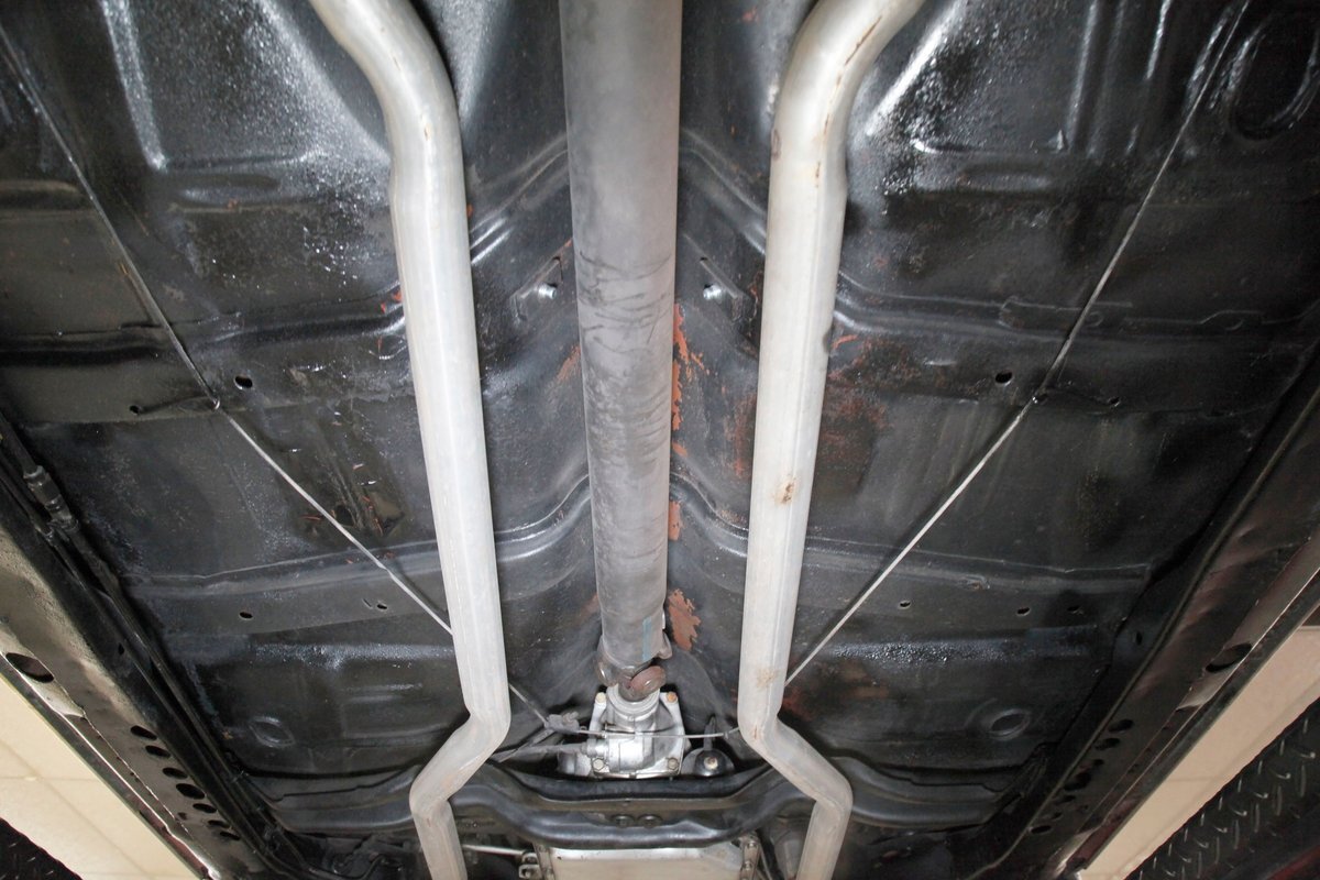 Attention to detail was definitely paid during the redux and it continues on the underside where we are met with miles of black painted steel. The frame, flooring, rockers and body supports are all structurally sound and we note in the areas of paint chip off the factory primer is showing through. Dual exhaust with stock replacement style mufflers are on as are power drum brakes with finned drums all around. Independent coil sprung front suspension and a 4 link with coil springs in back is providing the ride, and speaking of which it's time for us to take this beauty to the test track.