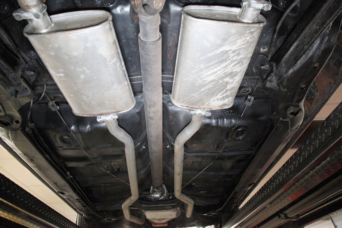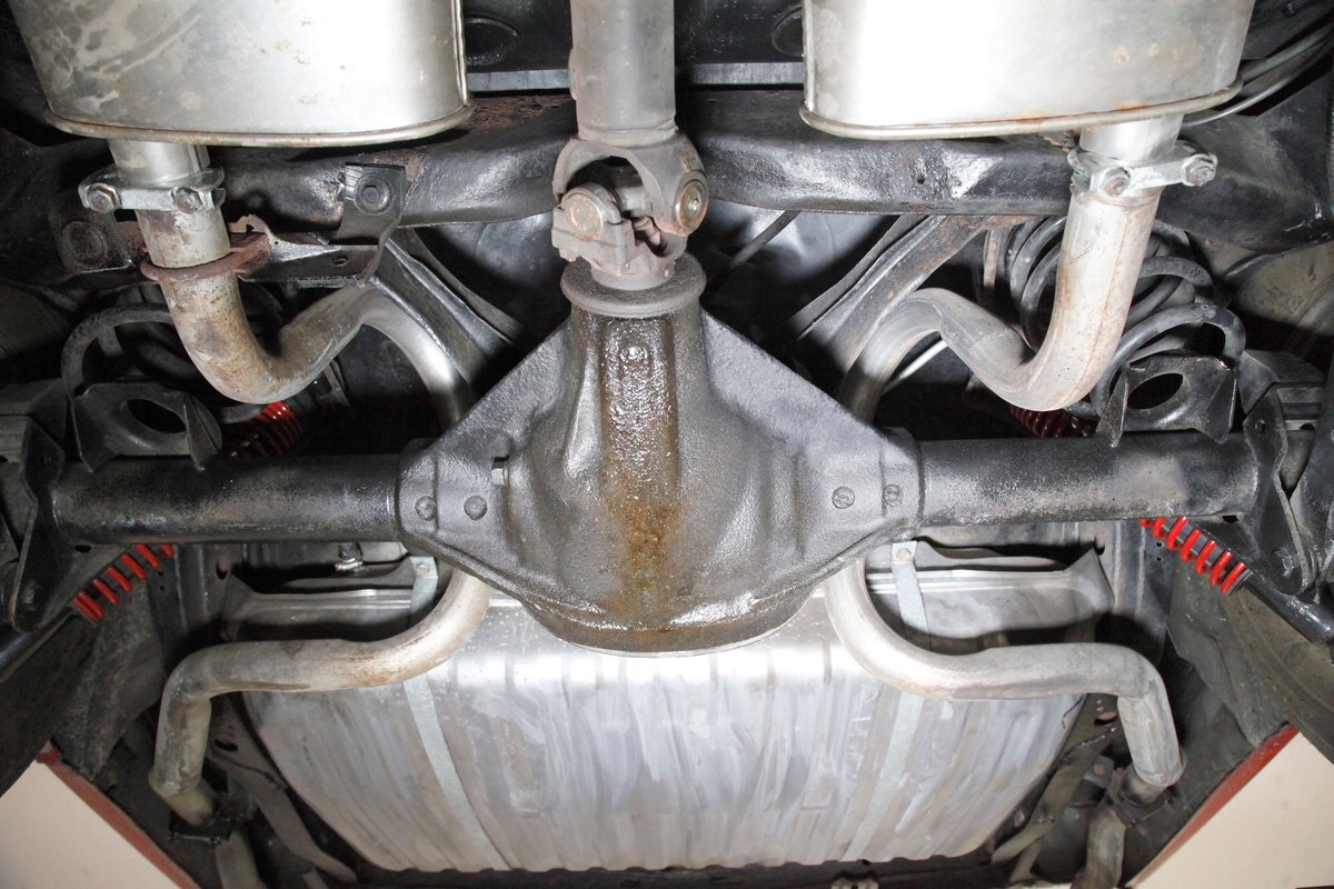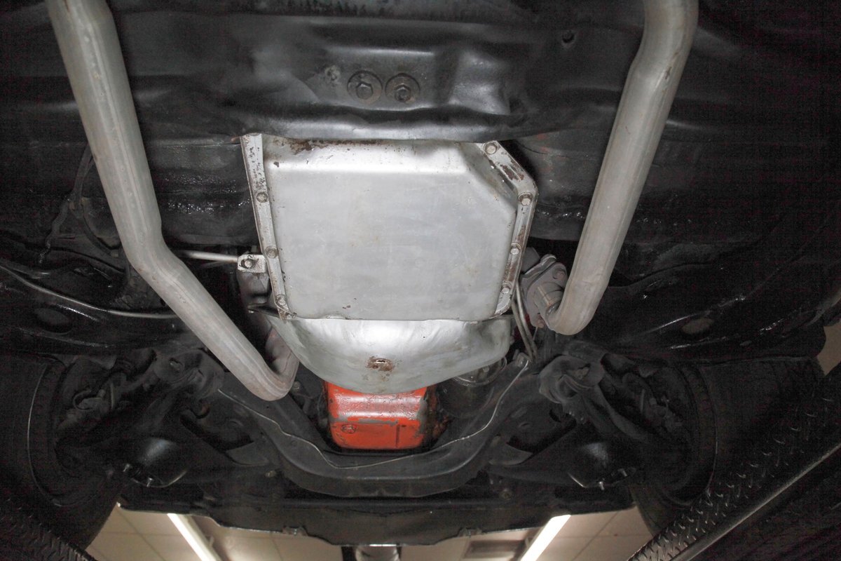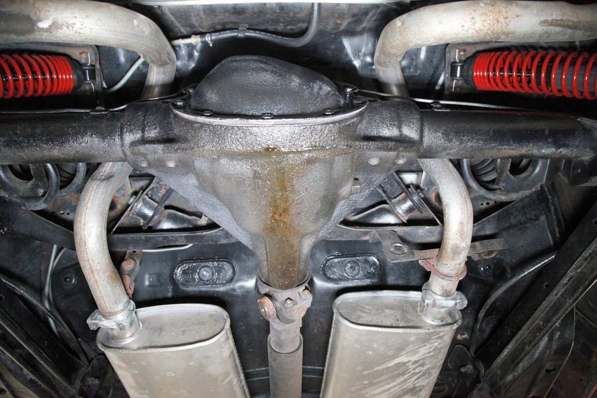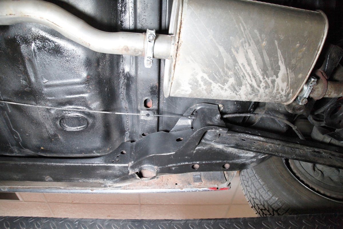 Attention to detail was definitely paid during the redux and it continues on the underside where we are met with miles of black painted steel. The frame, flooring, rockers and body supports are all structurally sound and we note in the areas of paint chip off the factory primer is showing through. Dual exhaust with stock replacement style mufflers are on as are power drum brakes with finned drums all around. Independent coil sprung front suspension and a 4 link with coil springs in back is providing the ride, and speaking of which it's time for us to take this beauty to the test track.