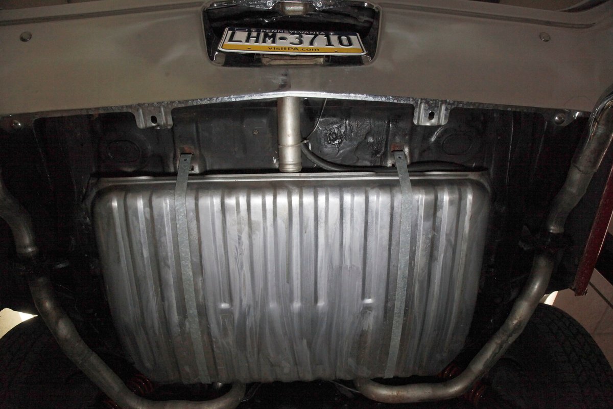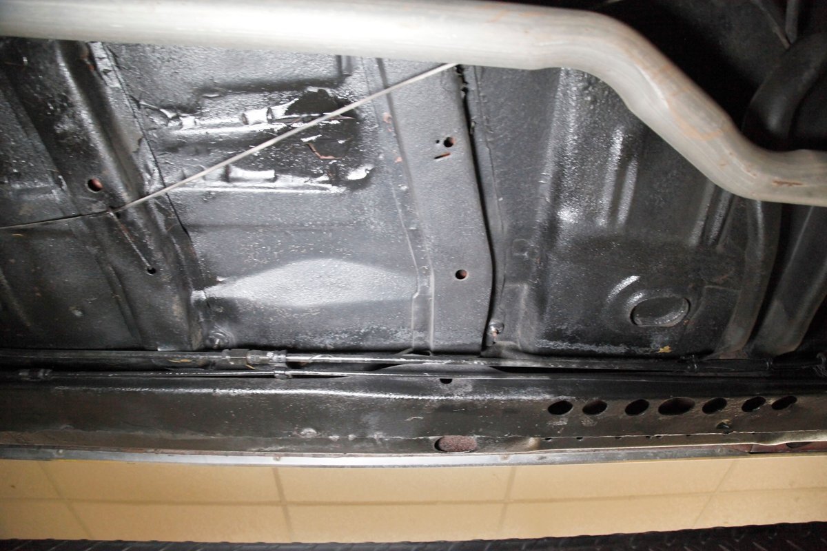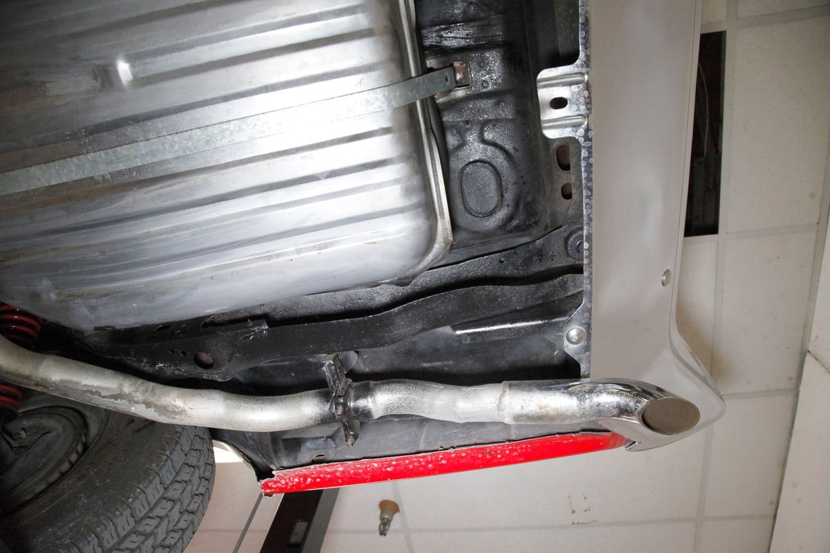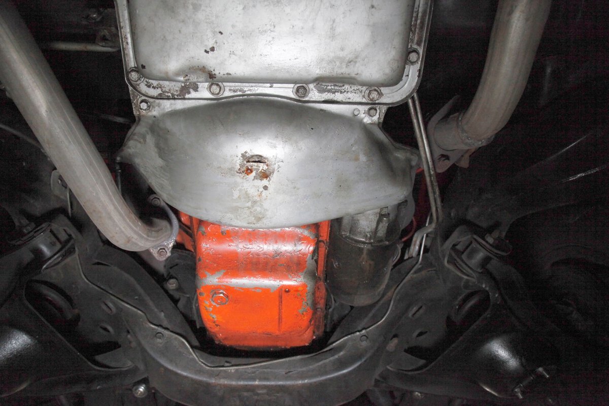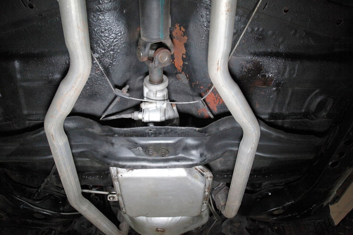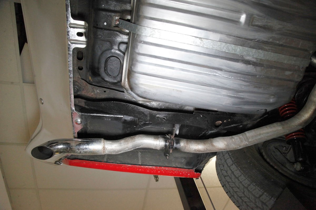 Attention to detail was definitely paid during the redux and it continues on the underside where we are met with miles of black painted steel. The frame, flooring, rockers and body supports are all structurally sound and we note in the areas of paint chip off the factory primer is showing through. Dual exhaust with stock replacement style mufflers are on as are power drum brakes with finned drums all around. Independent coil sprung front suspension and a 4 link with coil springs in back is providing the ride, and speaking of which it's time for us to take this beauty to the test track.