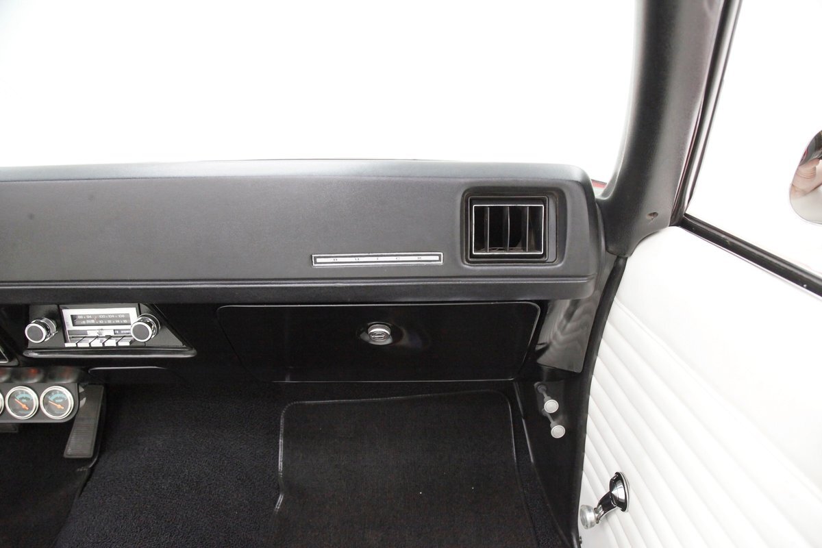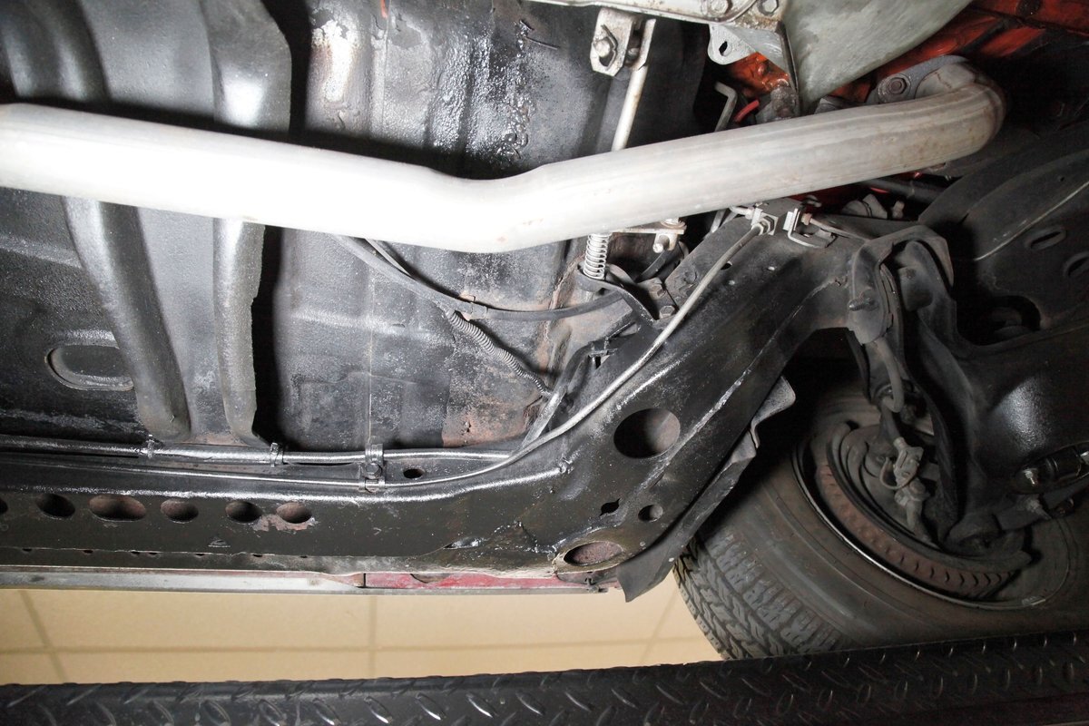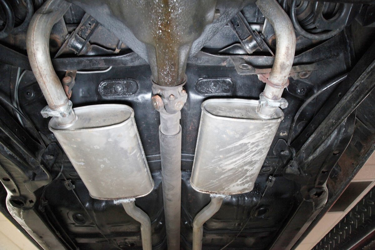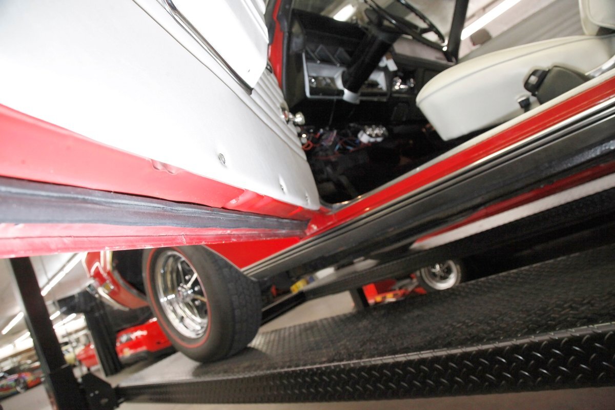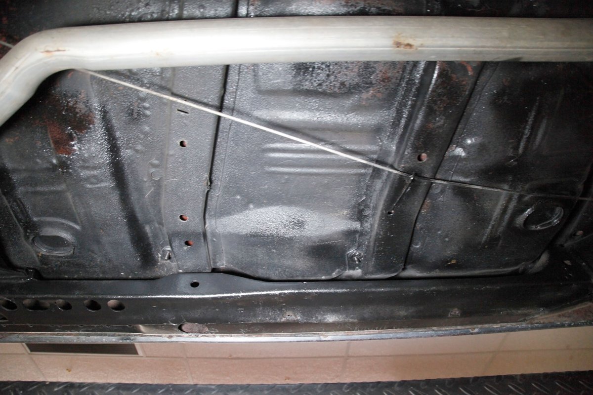 Attention to detail was definitely paid during the redux and it continues on the underside where we are met with miles of black painted steel. The frame, flooring, rockers and body supports are all structurally sound and we note in the areas of paint chip off the factory primer is showing through. Dual exhaust with stock replacement style mufflers are on as are power drum brakes with finned drums all around. Independent coil sprung front suspension and a 4 link with coil springs in back is providing the ride, and speaking of which it's time for us to take this beauty to the test track.
