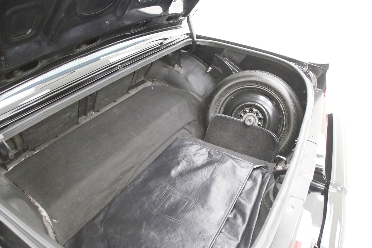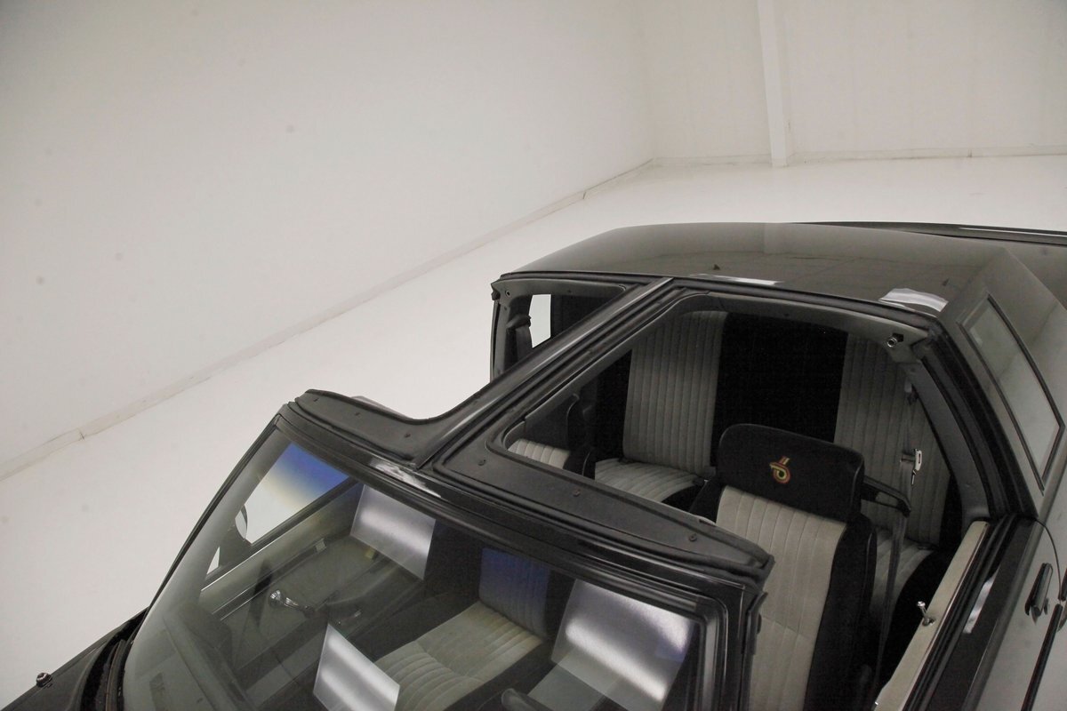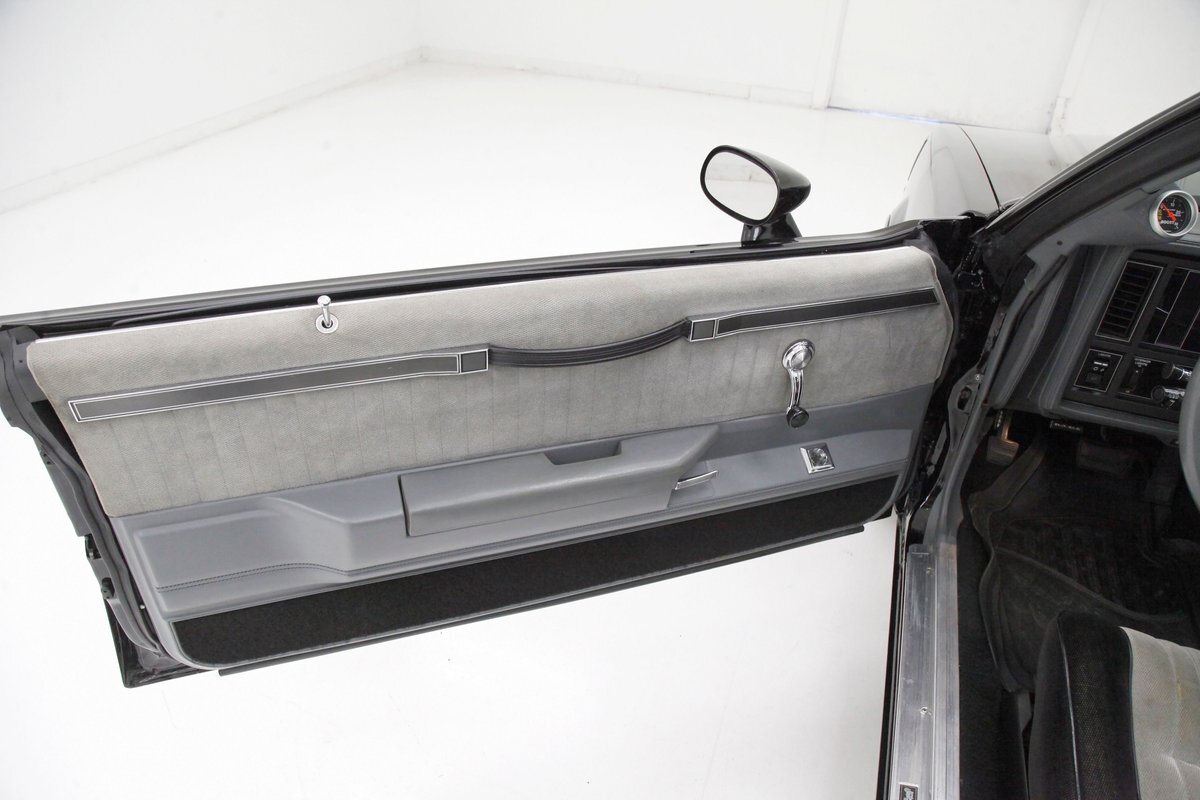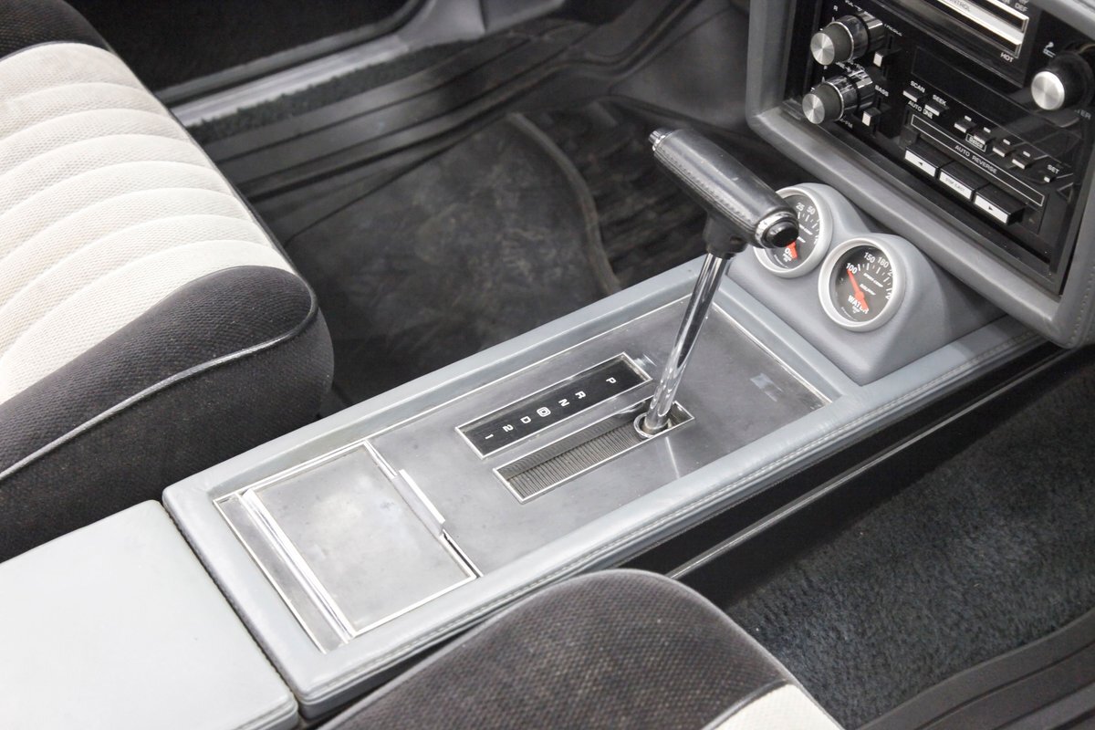Very nice and very racy with high back buckets in velour broadcloth with light gray tuck and roll inserts, and black bolsters surrounded by black piping. A rear bench with the same design, and these all float in a sea of black carpet which is very clean and like new. We note some slight soiling of the front buckets and a bit of seam separation on the driver's lower cushion, but this is the original interior. The door panels are dressed in more gray cloth and vinyl with black carpeted lowers and come to us with a chrome mirror joystick and shiny cranks for the non-power windows. The dash as well as the center console are formed from gray molded plastic and are fitted with a square and rectangle cluster with a black panel for the instruments that fronts an original steering wheel. The dash is very clean and well preserved and on the driver's A-pillar we note the addition of an AutoMeter boost gauge and in the center of the seats, the console houses the shift lever, a duo of added gauges within a pod, and a square glovebox. A digital AM/FM/Cassette radio panel hovers above the console and mounts into the center of the dash. The headliner is minimal due to the roof panels, but all looking clean and green, well gray actually with slight sagging.