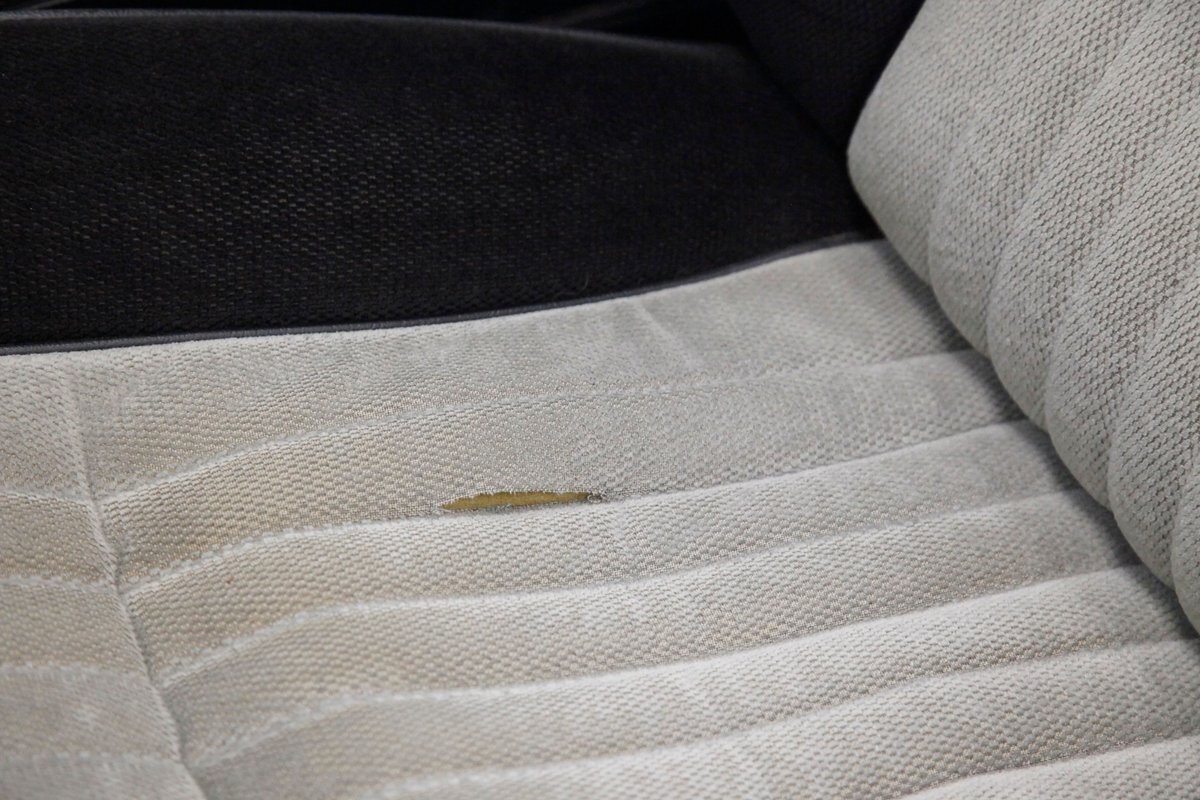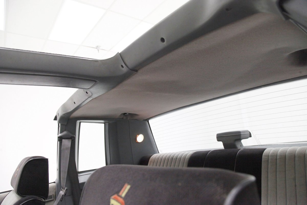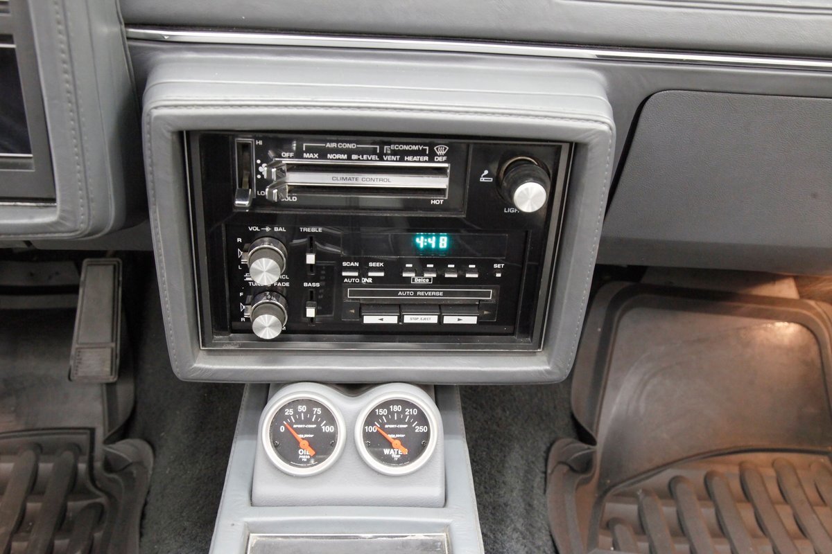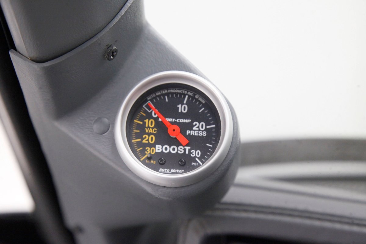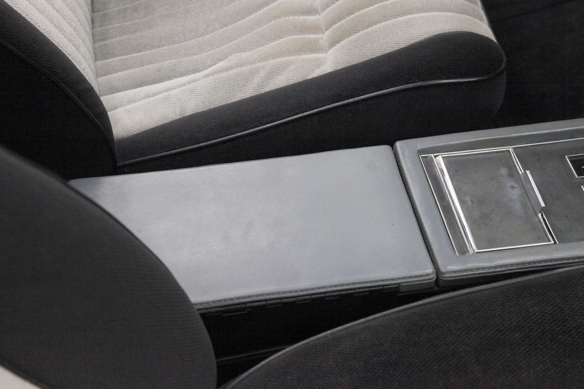 Very nice and very racy with high back buckets in velour broadcloth with light gray tuck and roll inserts, and black bolsters surrounded by black piping. A rear bench with the same design, and these all float in a sea of black carpet which is very clean and like new. We note some slight soiling of the front buckets and a bit of seam separation on the driver's lower cushion, but this is the original interior. The door panels are dressed in more gray cloth and vinyl with black carpeted lowers and come to us with a chrome mirror joystick and shiny cranks for the non-power windows. The dash as well as the center console are formed from gray molded plastic and are fitted with a square and rectangle cluster with a black panel for the instruments that fronts an original steering wheel. The dash is very clean and well preserved and on the driver's A-pillar we note the addition of an AutoMeter boost gauge and in the center of the seats, the console houses the shift lever, a duo of added gauges within a pod, and a square glovebox. A digital AM/FM/Cassette radio panel hovers above the console and mounts into the center of the dash. The headliner is minimal due to the roof panels, but all looking clean and green, well gray actually with slight sagging.