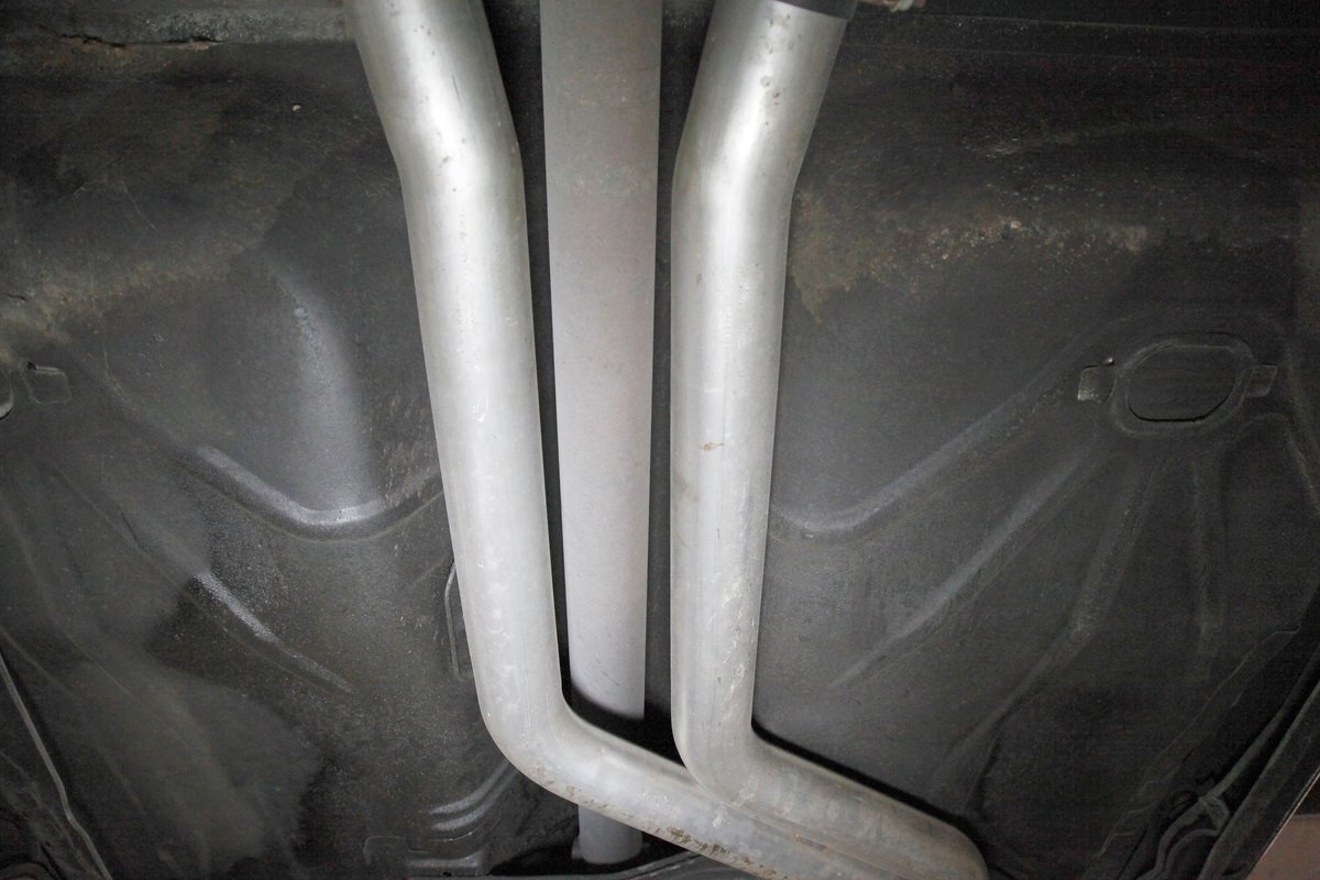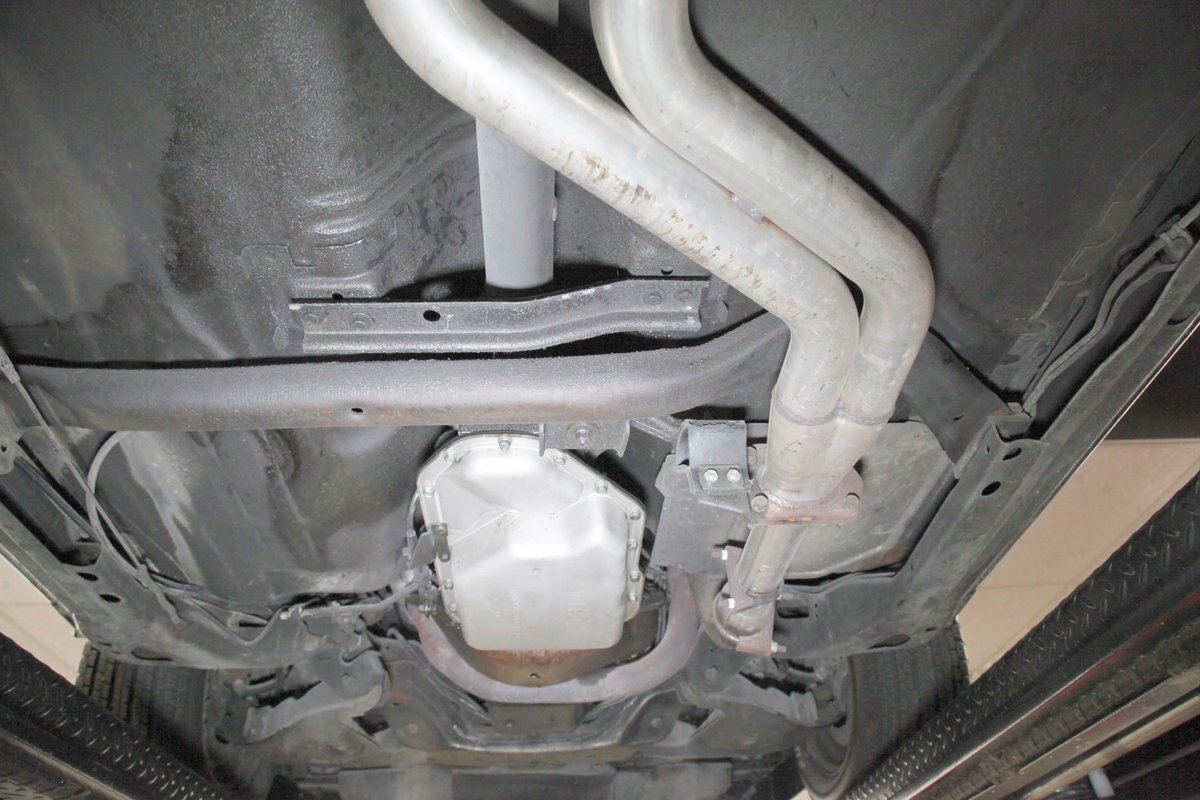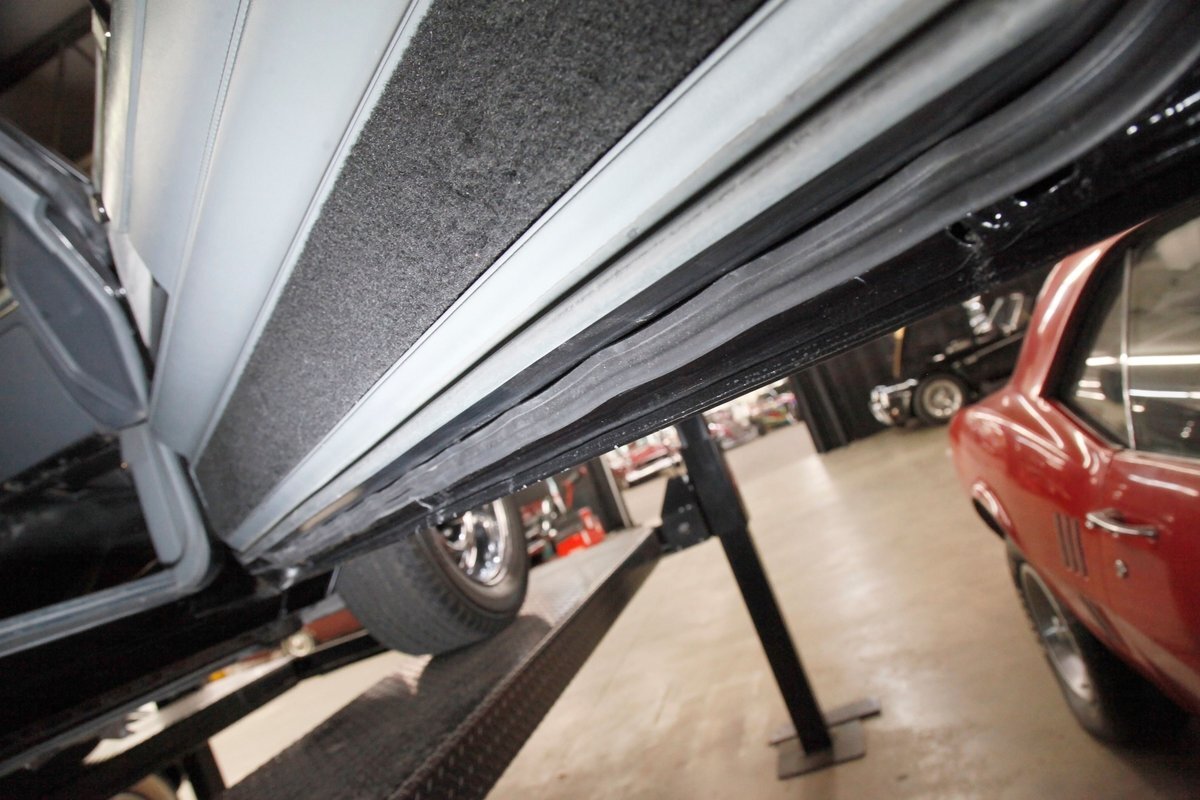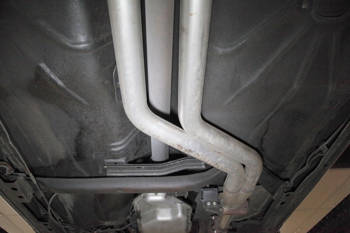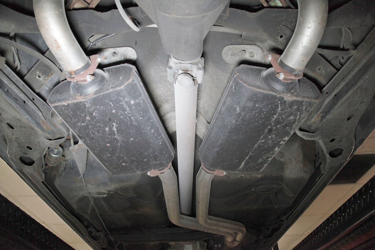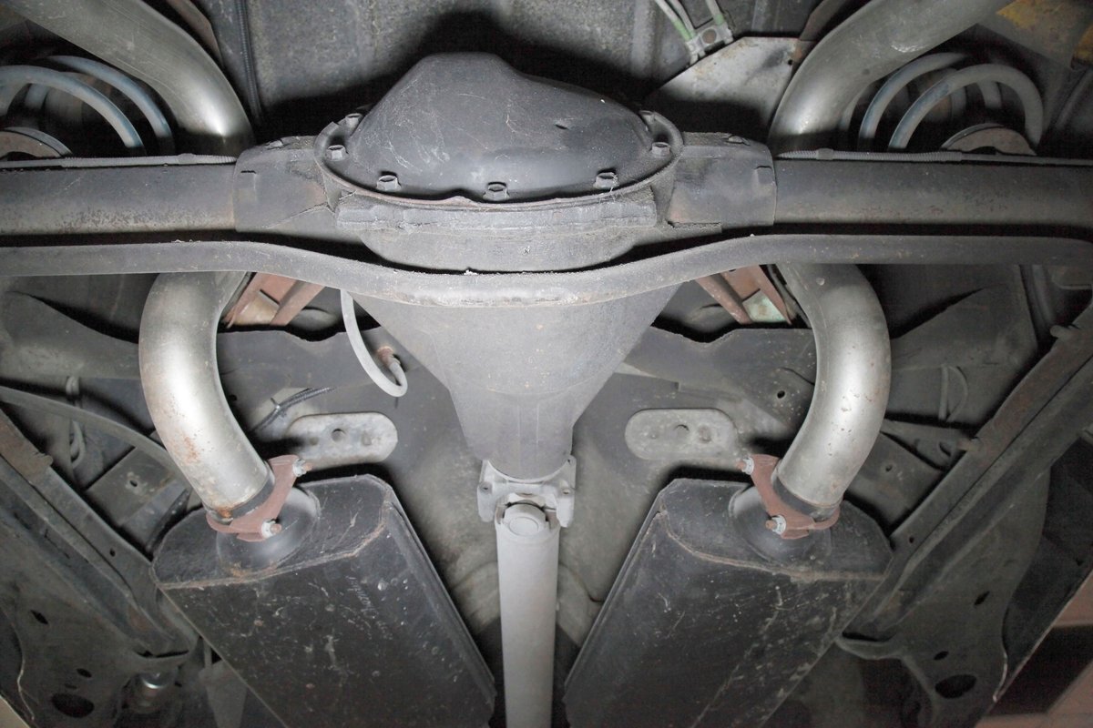 Underneath we see all being invasive rust free and well preserved with solid floor pans and toe kicks, frame, and drip free bottom end of the engine and transmission. Independent suspension with coil springs is upfront and along for the ride are power disc brakes. On the back this suspension is a 4 link with coil springs, and power drums are along for this ride. The single exhaust feeds down to a dual Hooker Aerochamber muffler equipped exhaust that exits under the rear bumper.