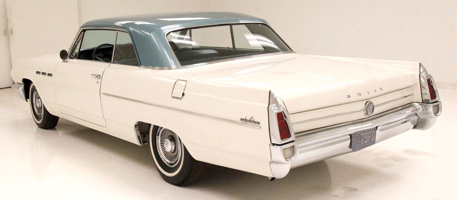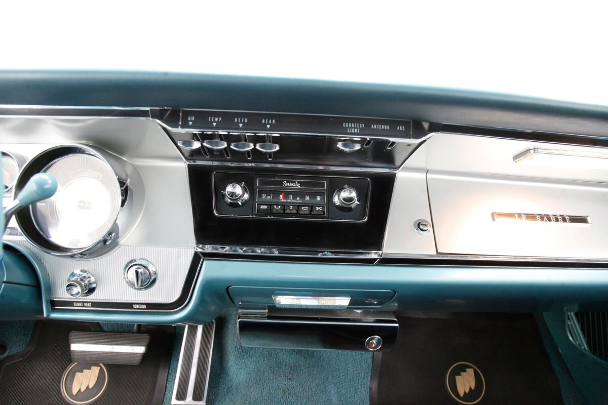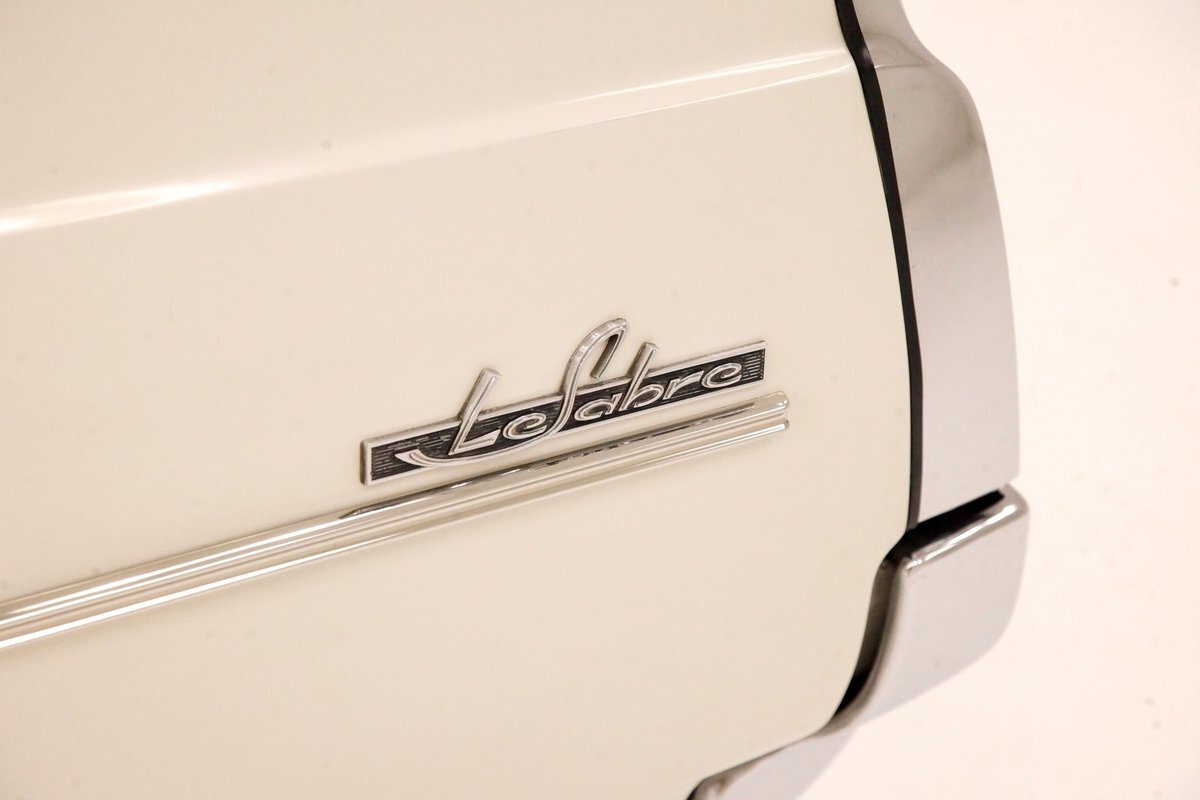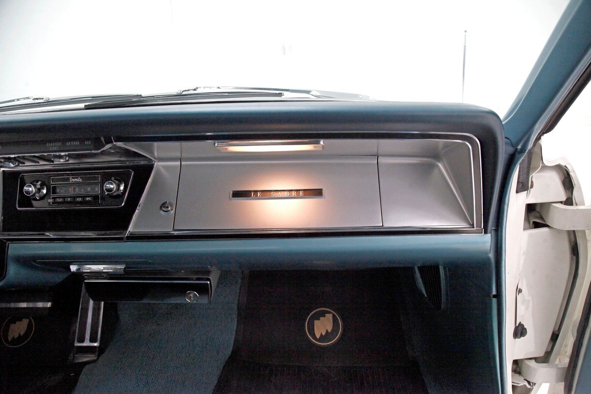 Arctic White covers the slightly finned metal slabs that are adorned with an array of near perfect condition brite work. A few inclusions are noted in the finish, but nothing remarkable overall. Fins were in the diminishing phase at this point in automotive design, but the fins make this car stand out from among its brethren. From the 3 front quarter panel quintessential "vents" to the horizontal tasteful V styled grille dressed with the Buick tri-shield and AACA badged with flanking dual headlights, and a rear quarter panel length trim spear that dresses the slab steel sides it is in very nice shiny condition. Stainless window trimmings, mirrors and wheel well surrounds add some more bling to the Arctic White paint. The glass trimmings also do a spectacular job of highlighting the formal hardtop roof design that is dipped in Teal Mist. On the rear quarters, a small comeback is made in the form of a light fin on top that frames the trunk lid on either side and really adds to the groovy vibe. Vertical tail lighting, within chrome pods that contour to the end of the quarter panels, melts near seamlessly into the shiny bumper below to finish off the body. Thin white wall rubber has turbine styled wheel coverings and this car is now bleeding 60's cool, right down to the LeSabre badge just above the back portion of the trim spear.