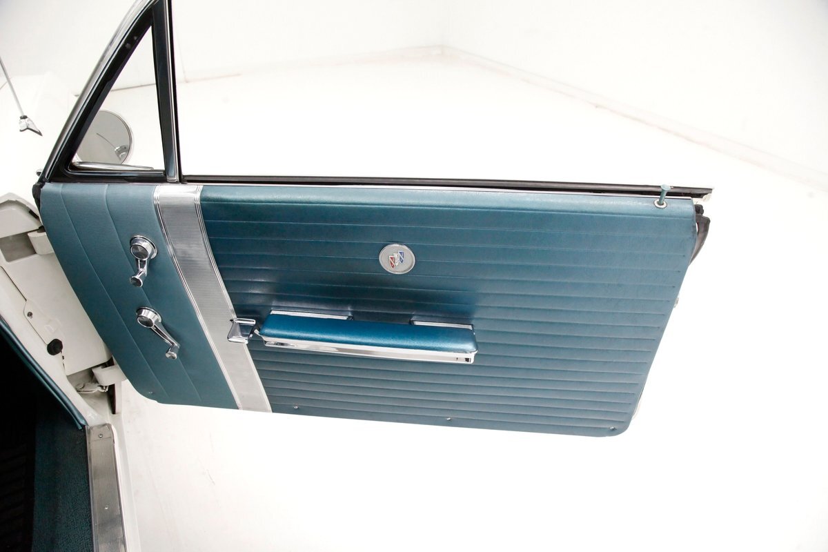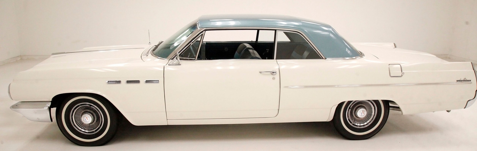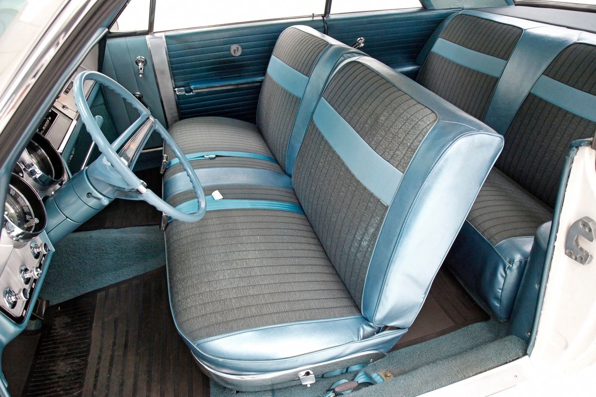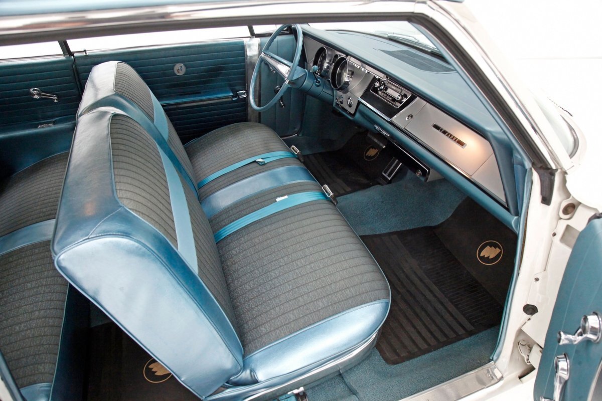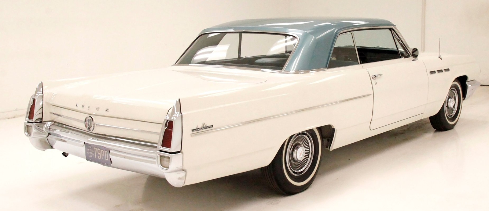 Arctic White covers the slightly finned metal slabs that are adorned with an array of near perfect condition brite work. A few inclusions are noted in the finish, but nothing remarkable overall. Fins were in the diminishing phase at this point in automotive design, but the fins make this car stand out from among its brethren. From the 3 front quarter panel quintessential "vents" to the horizontal tasteful V styled grille dressed with the Buick tri-shield and AACA badged with flanking dual headlights, and a rear quarter panel length trim spear that dresses the slab steel sides it is in very nice shiny condition. Stainless window trimmings, mirrors and wheel well surrounds add some more bling to the Arctic White paint. The glass trimmings also do a spectacular job of highlighting the formal hardtop roof design that is dipped in Teal Mist. On the rear quarters, a small comeback is made in the form of a light fin on top that frames the trunk lid on either side and really adds to the groovy vibe. Vertical tail lighting, within chrome pods that contour to the end of the quarter panels, melts near seamlessly into the shiny bumper below to finish off the body. Thin white wall rubber has turbine styled wheel coverings and this car is now bleeding 60's cool, right down to the LeSabre badge just above the back portion of the trim spear.
