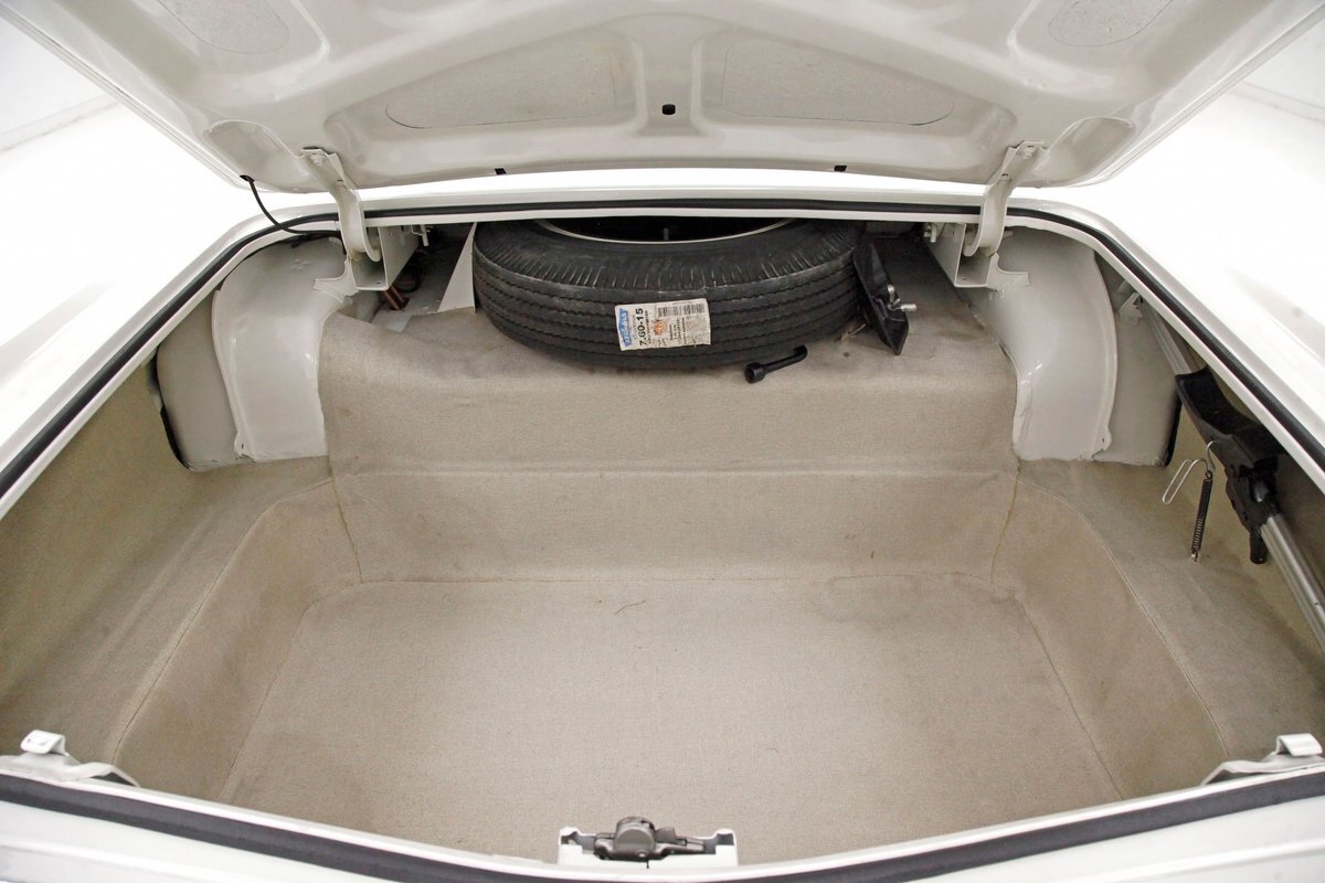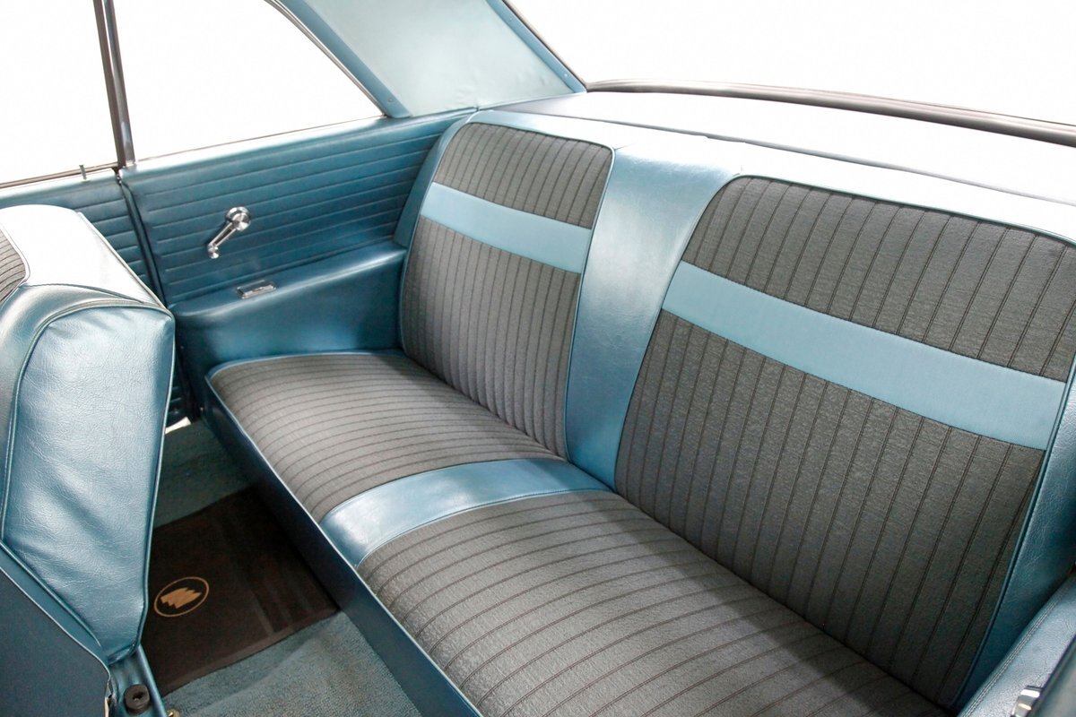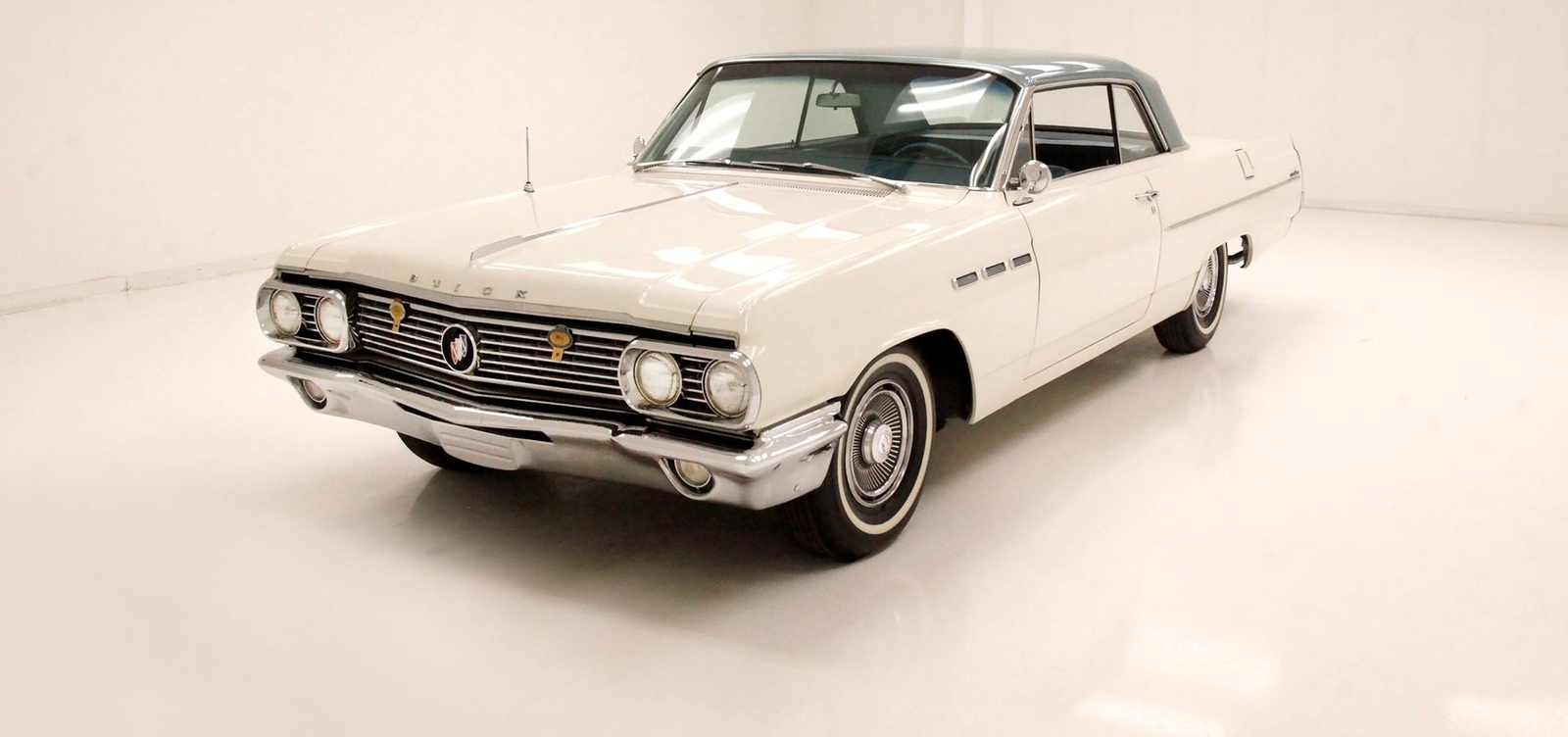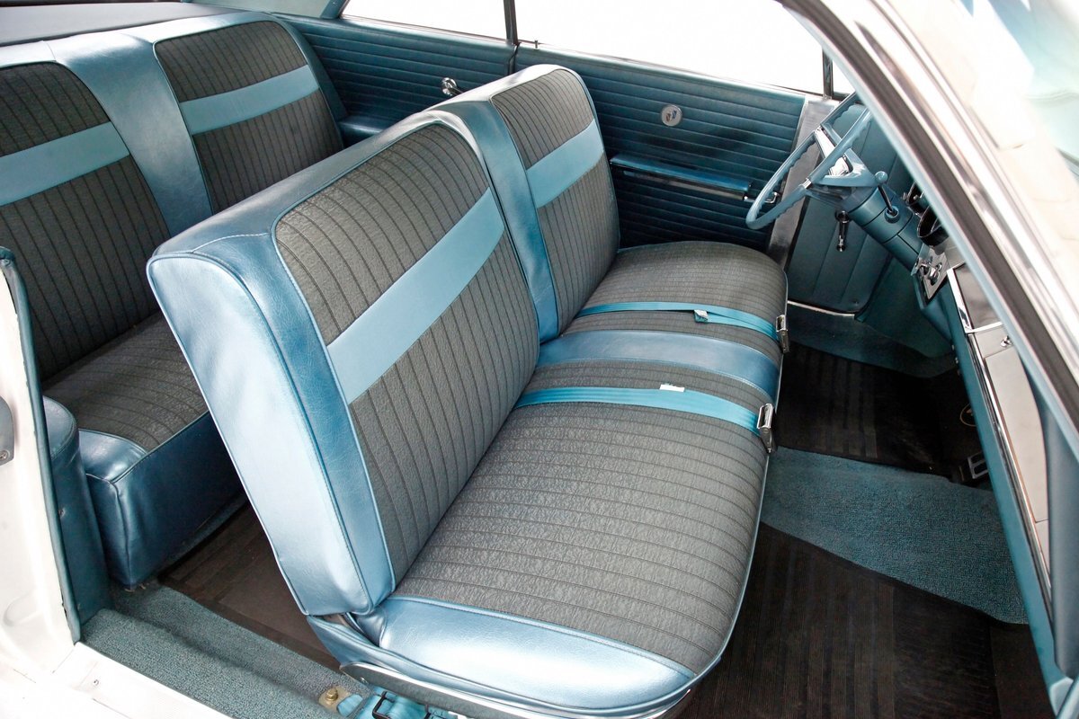 Arctic White covers the slightly finned metal slabs that are adorned with an array of near perfect condition brite work. A few inclusions are noted in the finish, but nothing remarkable overall. Fins were in the diminishing phase at this point in automotive design, but the fins make this car stand out from among its brethren. From the 3 front quarter panel quintessential "vents" to the horizontal tasteful V styled grille dressed with the Buick tri-shield and AACA badged with flanking dual headlights, and a rear quarter panel length trim spear that dresses the slab steel sides it is in very nice shiny condition. Stainless window trimmings, mirrors and wheel well surrounds add some more bling to the Arctic White paint. The glass trimmings also do a spectacular job of highlighting the formal hardtop roof design that is dipped in Teal Mist. On the rear quarters, a small comeback is made in the form of a light fin on top that frames the trunk lid on either side and really adds to the groovy vibe. Vertical tail lighting, within chrome pods that contour to the end of the quarter panels, melts near seamlessly into the shiny bumper below to finish off the body. Thin white wall rubber has turbine styled wheel coverings and this car is now bleeding 60's cool, right down to the LeSabre badge just above the back portion of the trim spear.