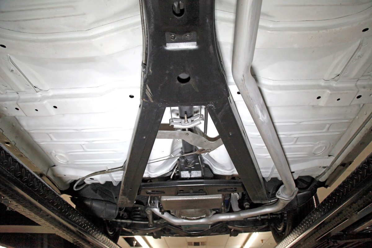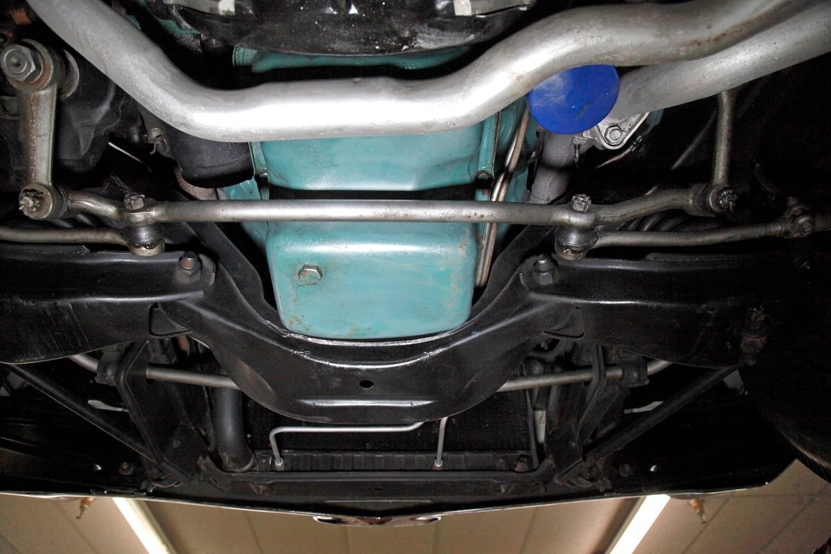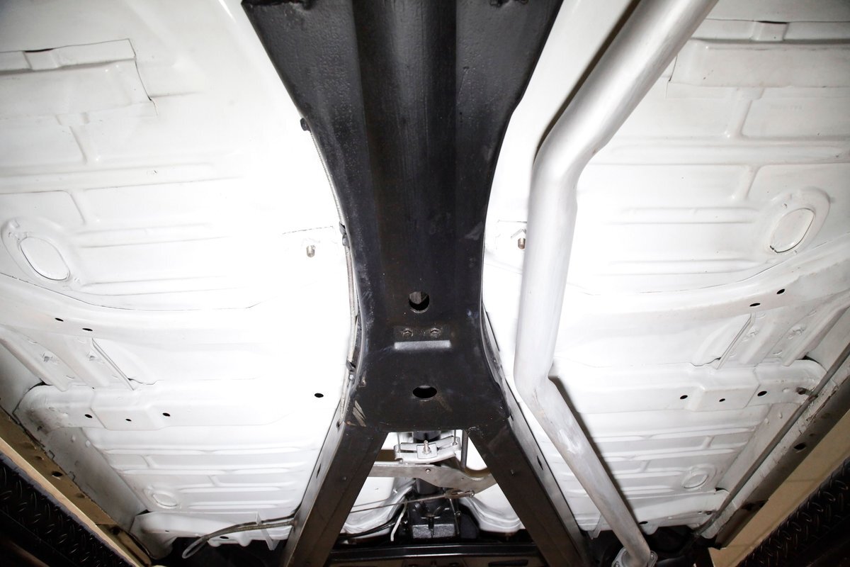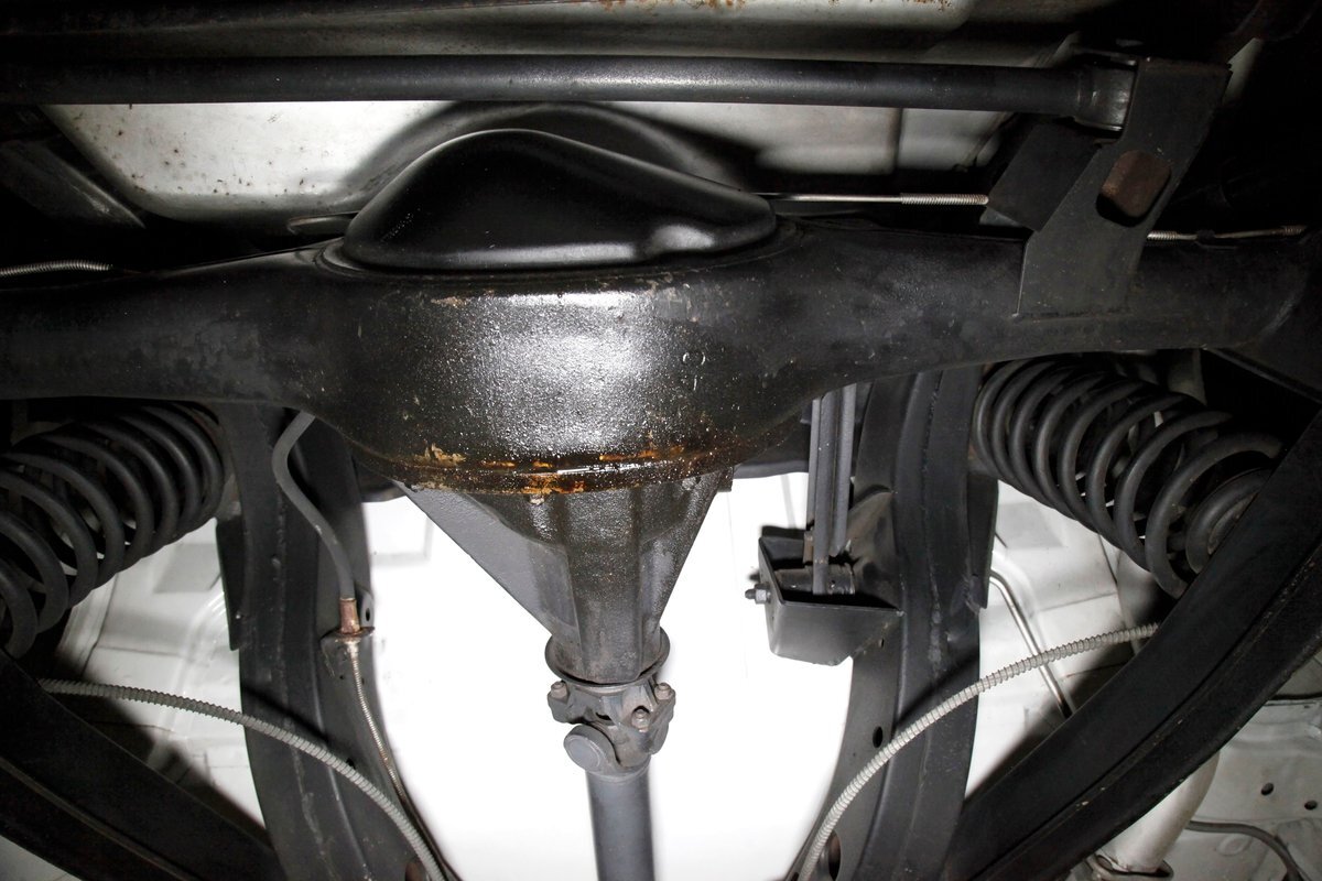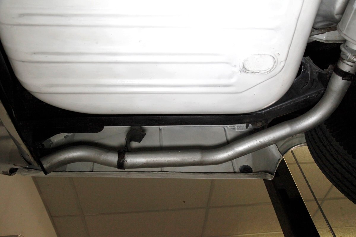 Thanks to a top notch frame off restoration there is very little to no surface rust underneath, just miles of white flooring, black suspension and black framing. An X frame holds it all together, and for the suspension I see front independent coil springs and on the back a 4 link with coil springs. Power drum braking is on all 4 corners, and a like new single piped stock exhaust is on the car. Break out the mirrors...it's showtime!